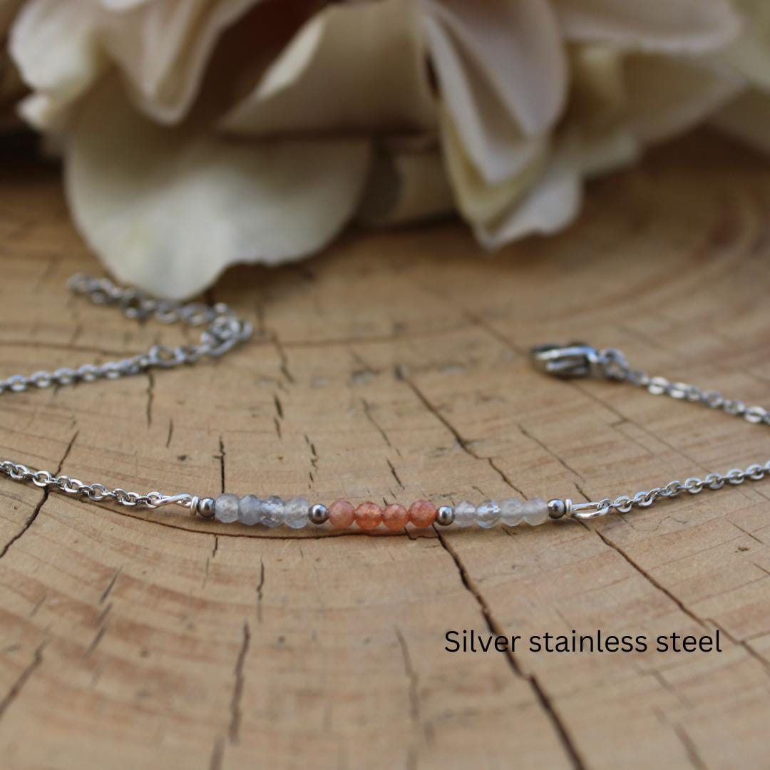 Moonstone and labradorite have an ethereal blue flash that will be visible in the right light and sunstone with metallic inclusions that makes it glittery. To keep it in great condition it is important to avoid water so please keep this in mind before placing an order.