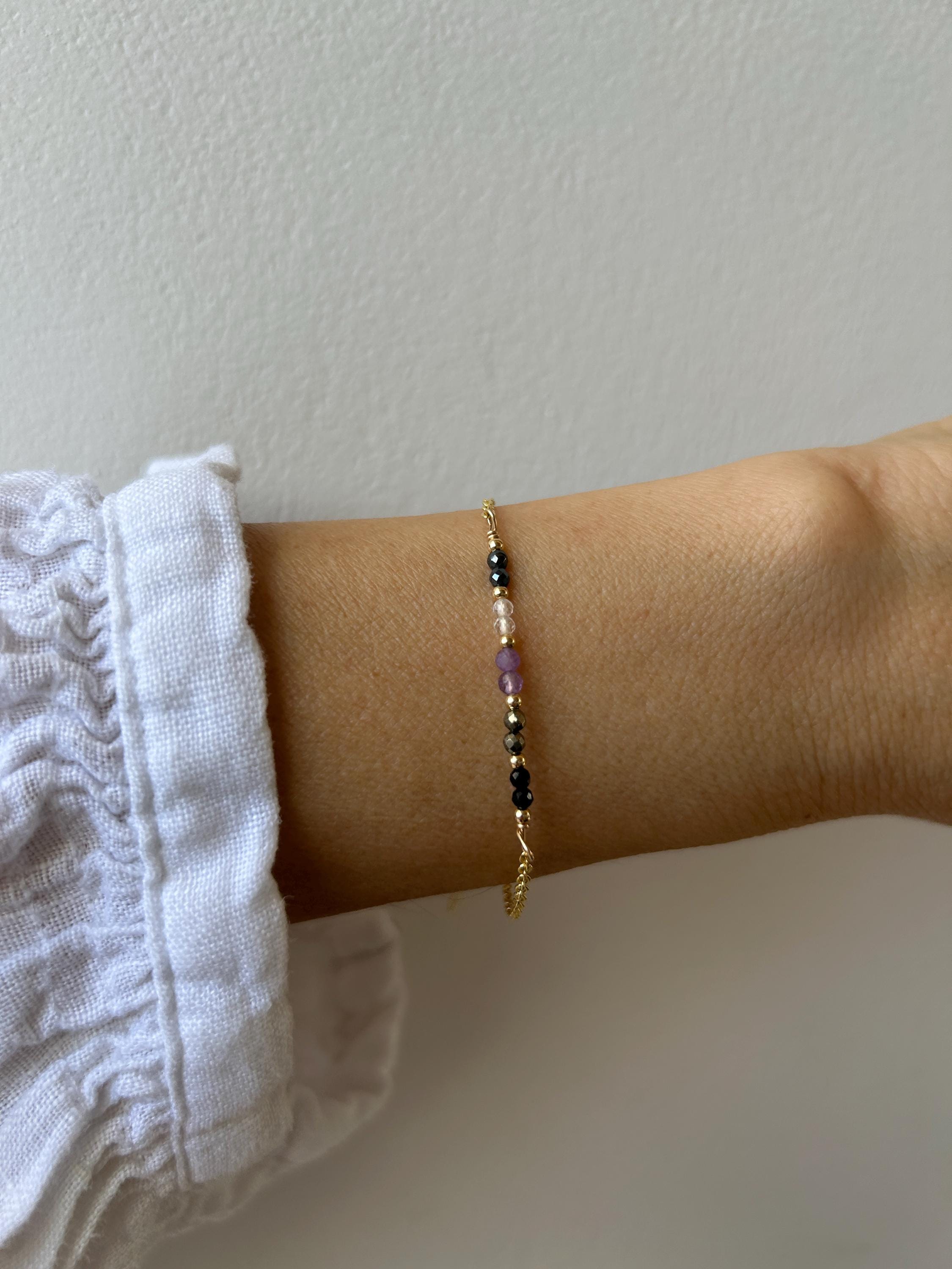 This little bracelet combines some of the most beneficial crystals for protection, calming energy and and blocking negative energy. As it contains crystals ending in "ite" it should not be exposed to water so please bear this in mind before placing and order.