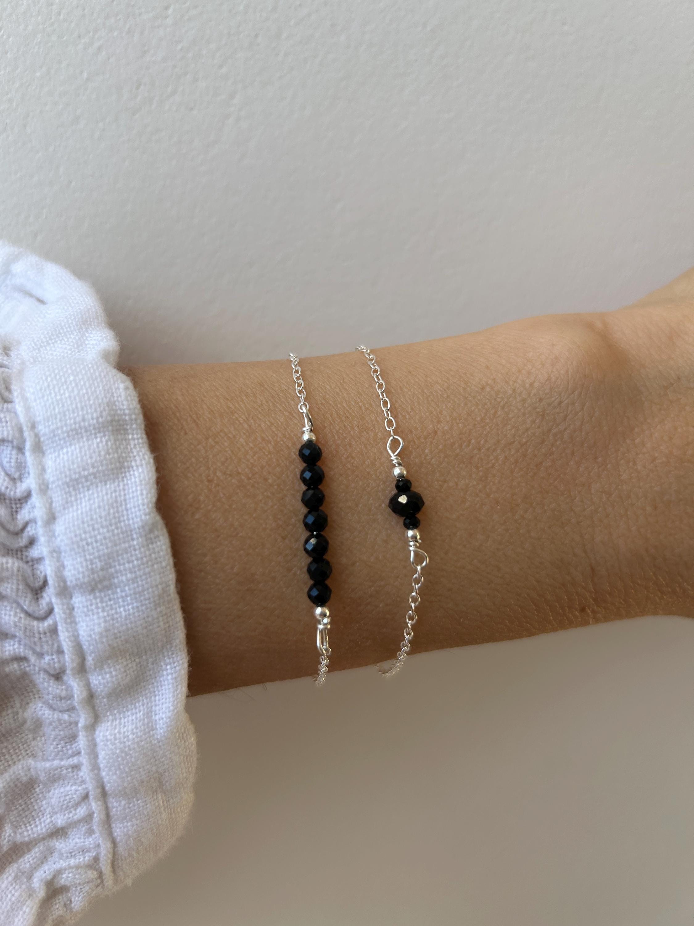 •Made with black tourmaline hand cut faceted rondelles that originate from Africa and Brazil. The larger crystal used in the trio can have a dark chrome green undertone when you hold it to the light. This is a much rarer and more expensive form of tourmaline.