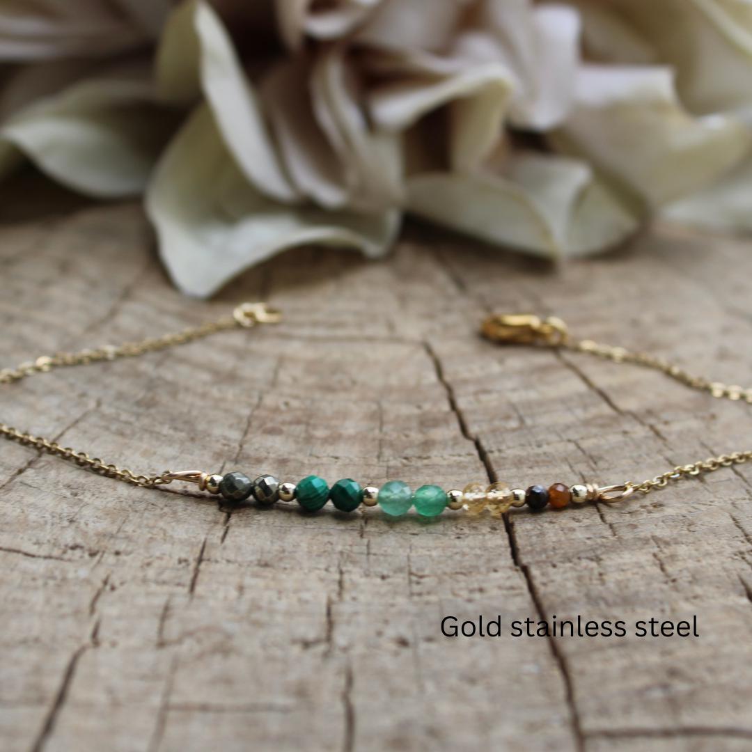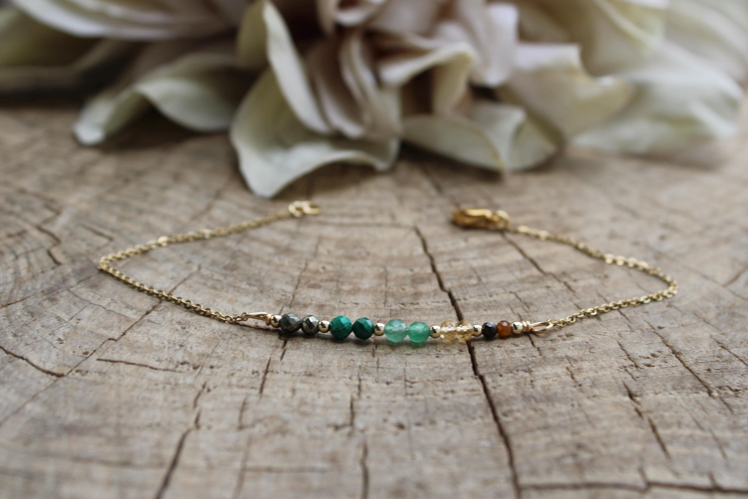 This little bracelet combines gemstones that are associated with prosperity, abundance and attracting wealth and luck. As it contains pyrite and malachite "ite " crystals water should be avoided so please bear this in mind before placing an order.