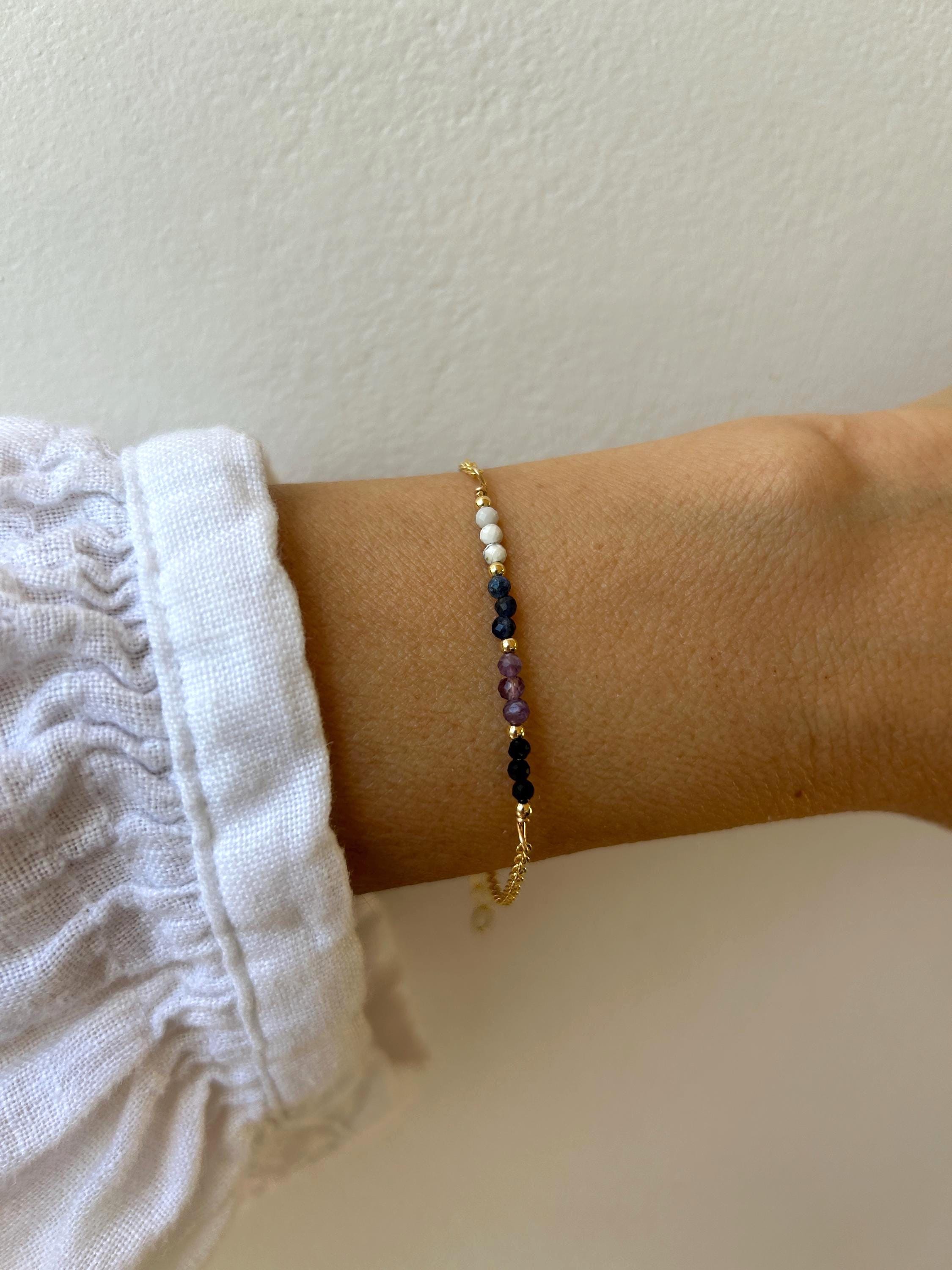 •Made with a line up of AAA quality micro faceted gemstones. These are very small measuring between 2 and 2.25mm. These include howlite, sodalite, amethyst and black tourmaline,