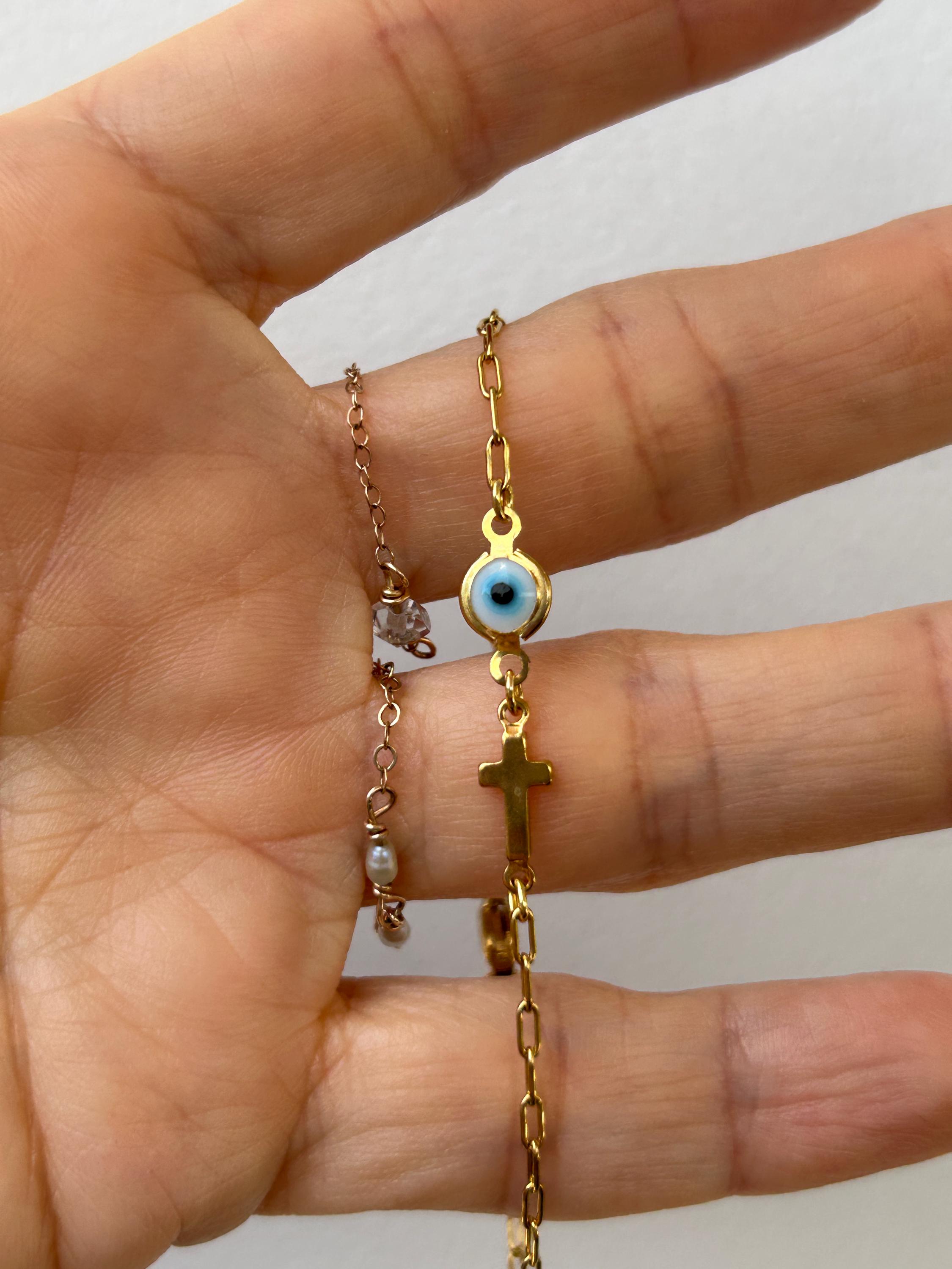 Brush away negative energy and jealous prying eyes with this dainty evil eye and cross bracelet! You can customise it by choosing the chain and evil eye colour.