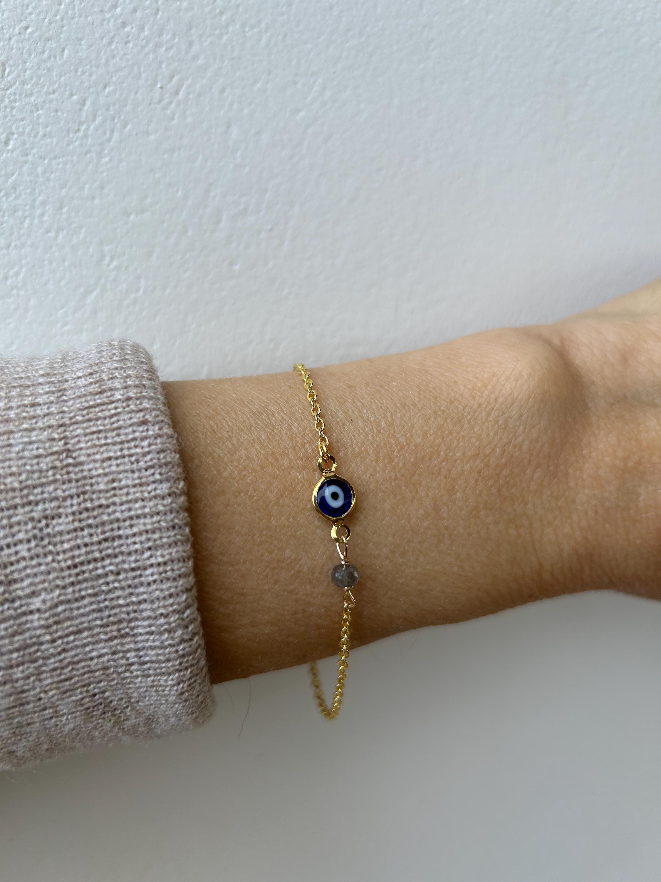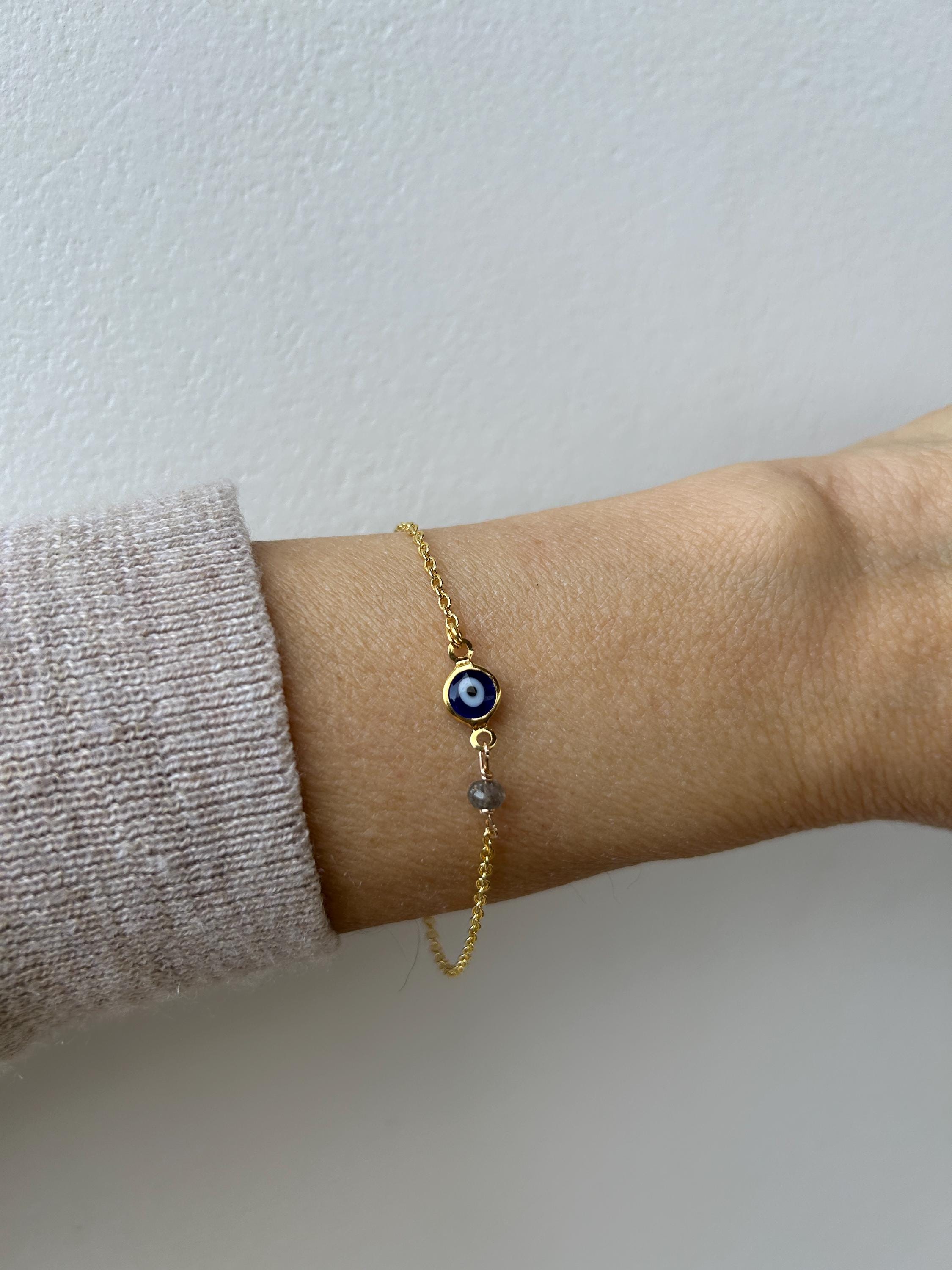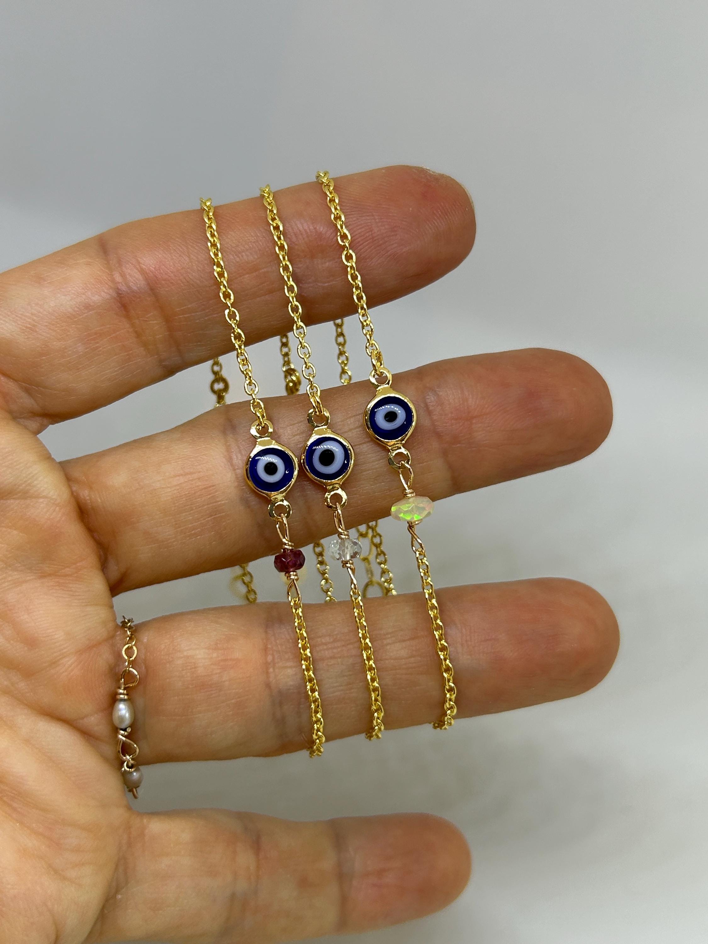Brush away negative energy and jealous prying eyes with this dainty evil eye bracelet that you can customise by adding the gemstone/birthstone of your choice.
