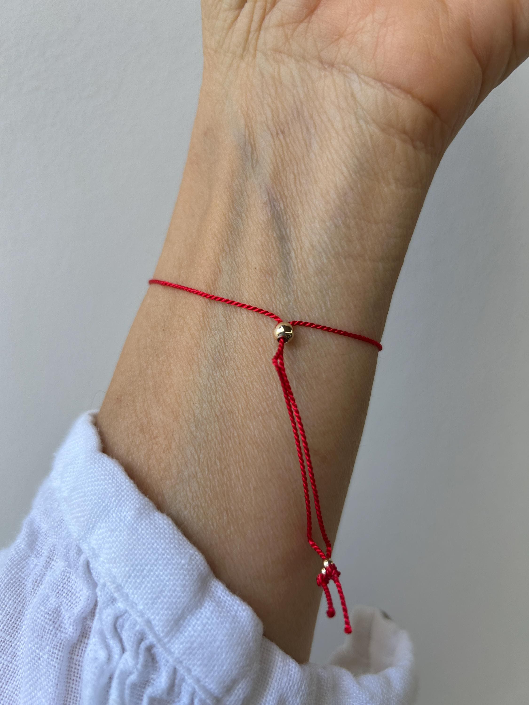 This natural silk string bracelet features solid gold beads and makes a wonderful gift for yourself or someone special.
