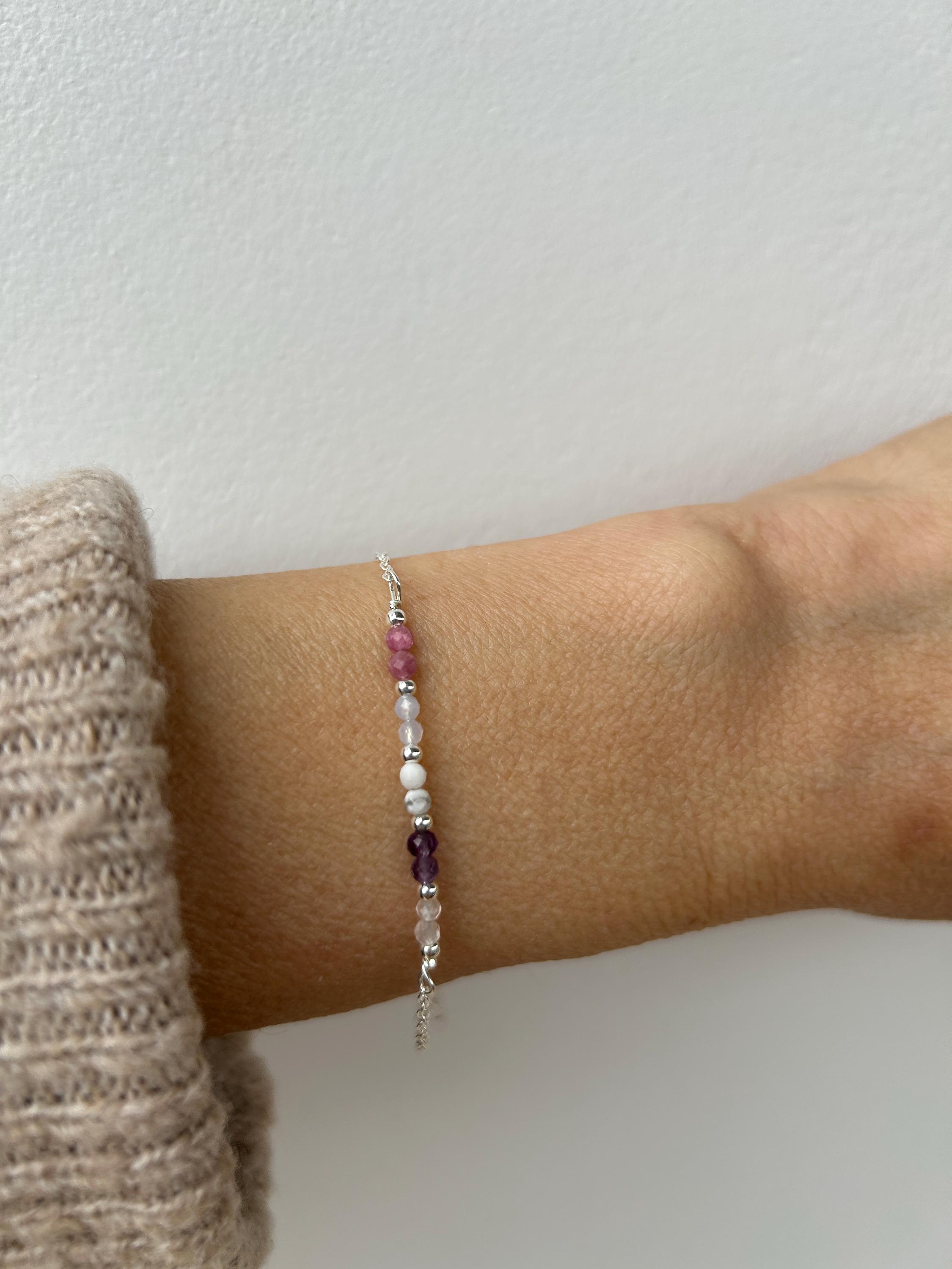 This dainty little bracelet features beautiful gemstones that compliment each other and are associated with a sense of calm, well- being and self- love.