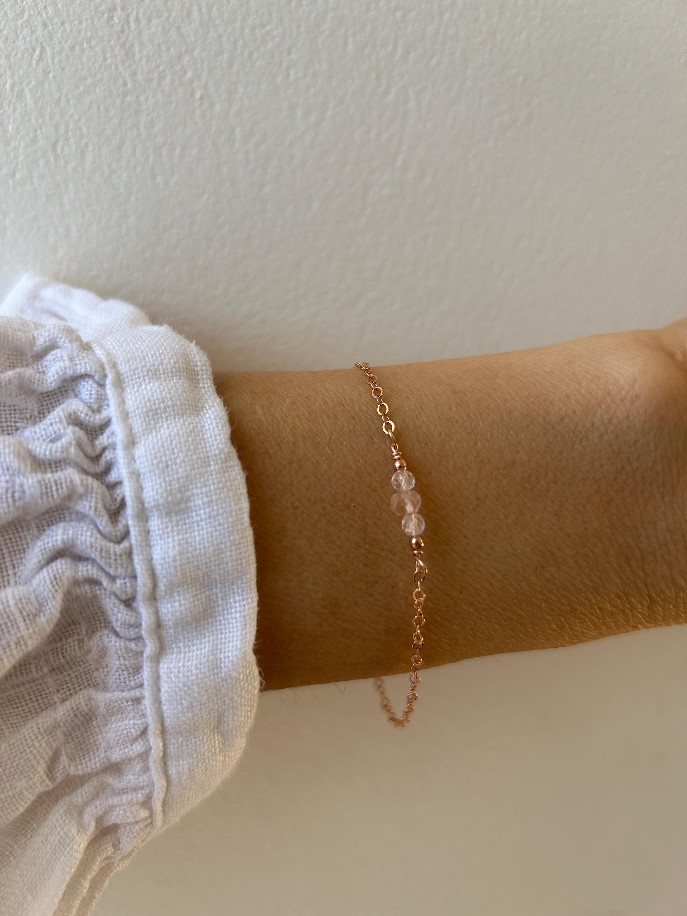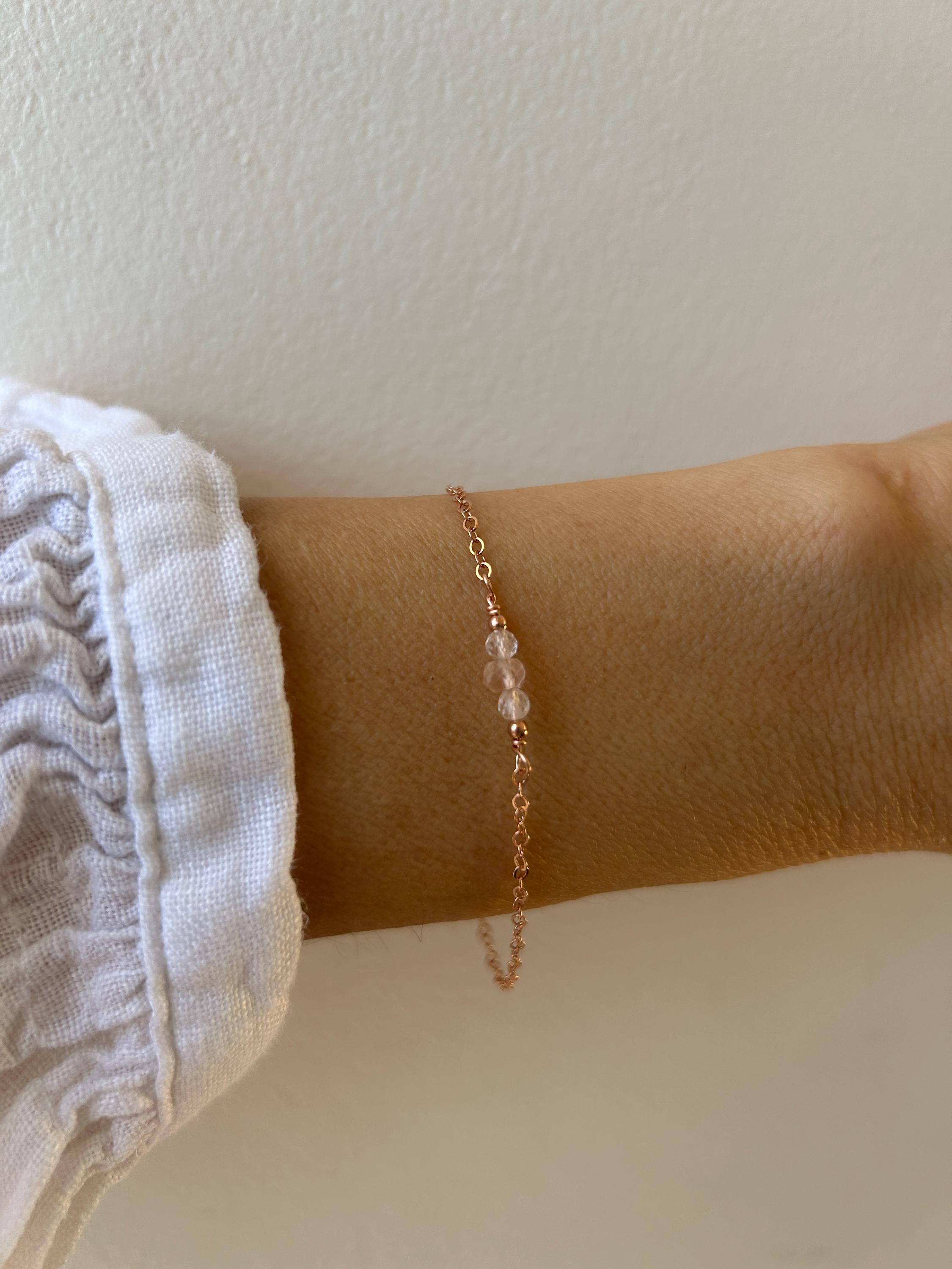 Made with the gentle essence of rose quartz this beautiful little bracelet also has powerful metaphysical properties. Rose quartz also known as the heart stone is associated with self love and can aid fertility and offer protection through pregnancy.
