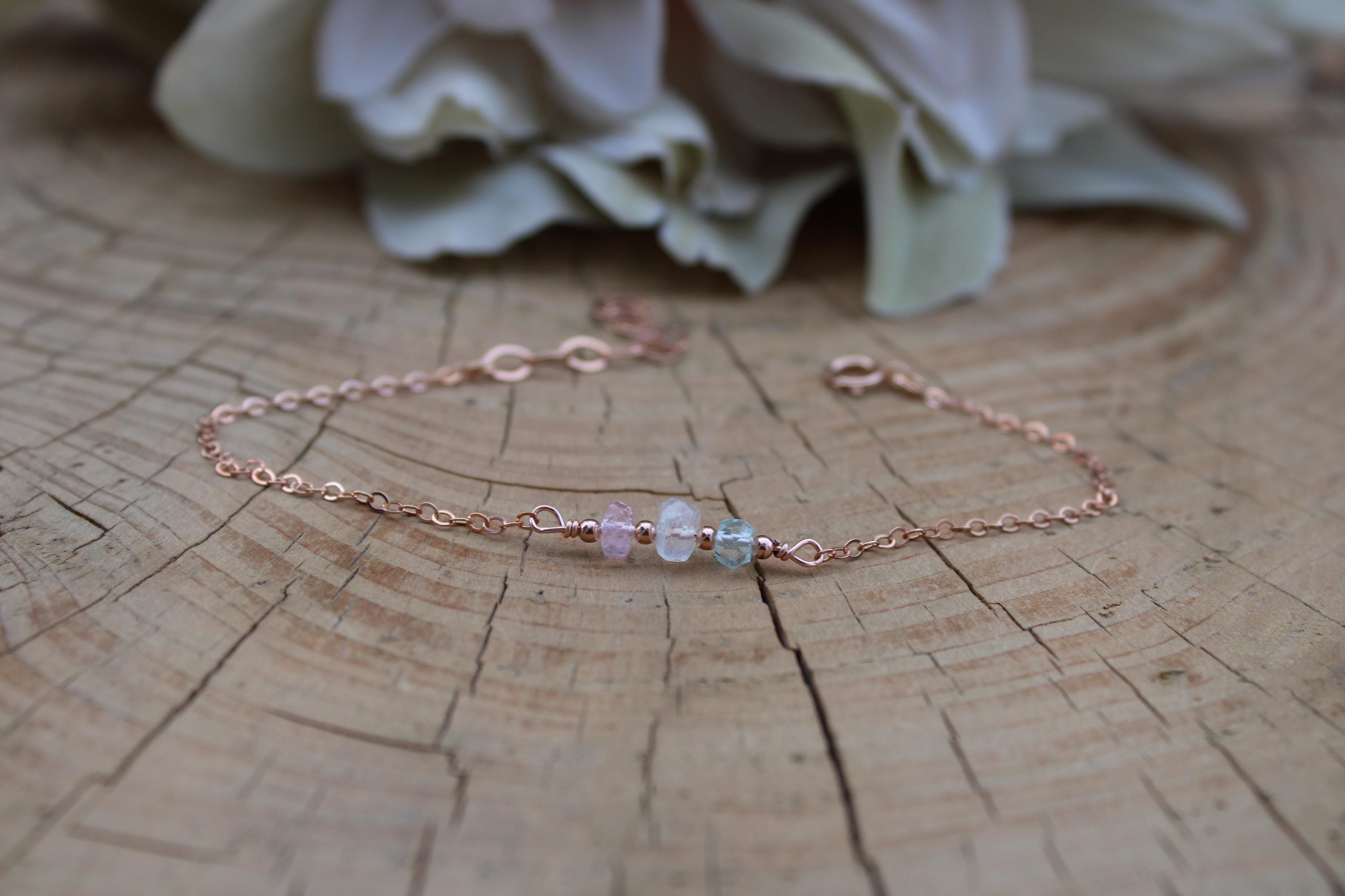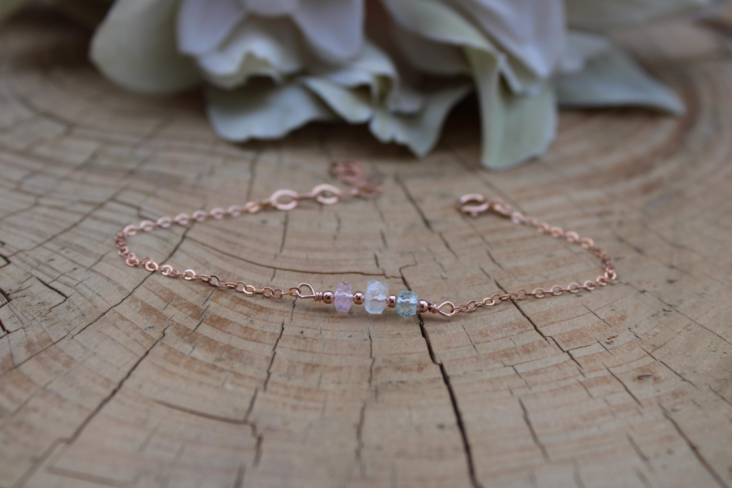 This dainty bracelet features the gentle essence of morganite, moonstone and aquamarine. You can customise your bracelet by choosing the chain of your choice.