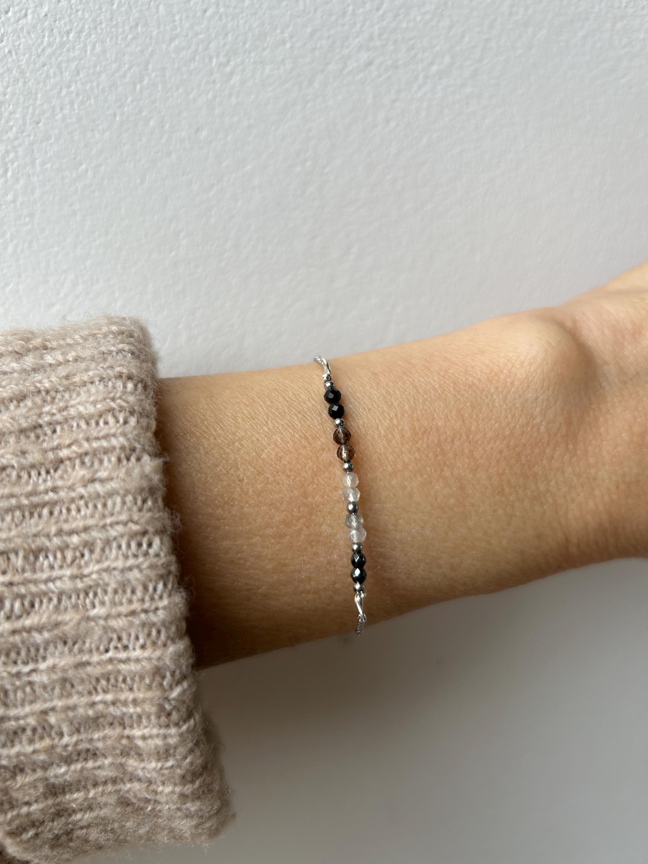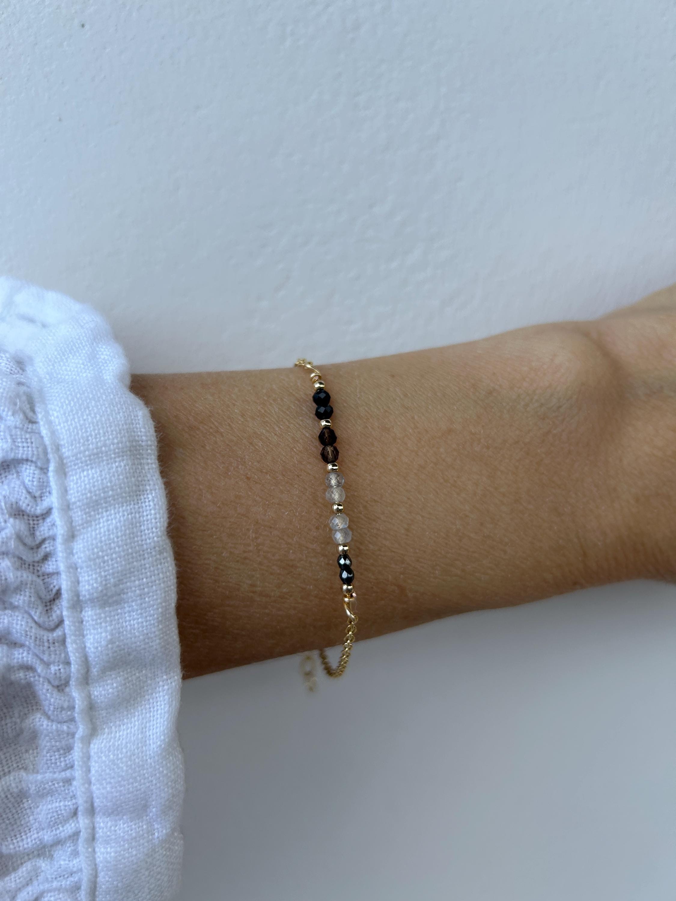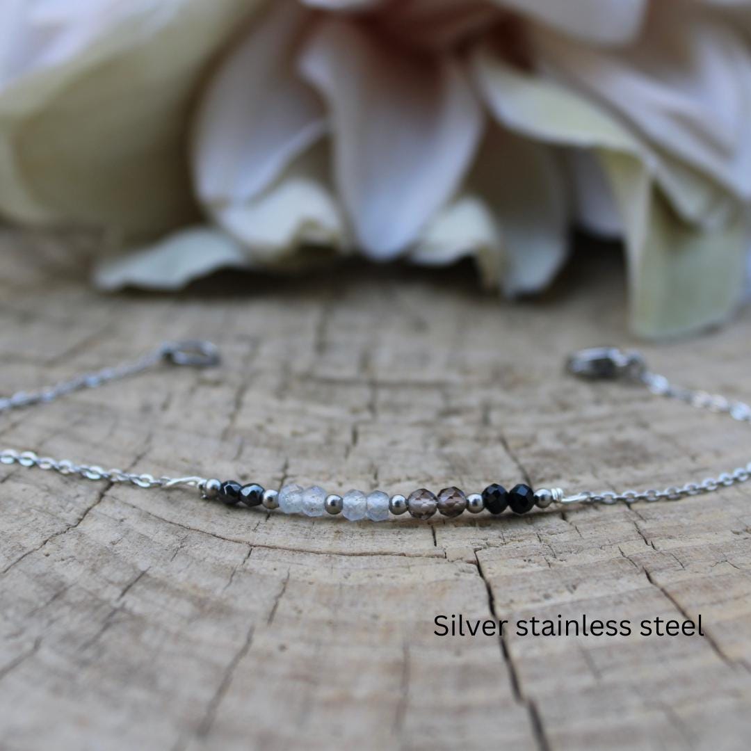•The gemstones included are hematite, labradorite, grey moonstone, smoky quartz and black tourmaline.