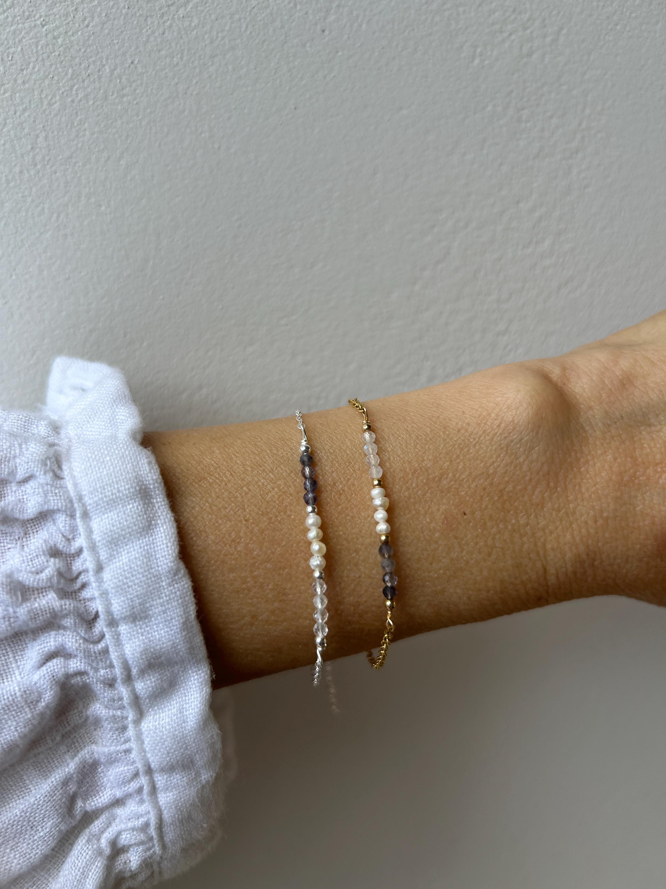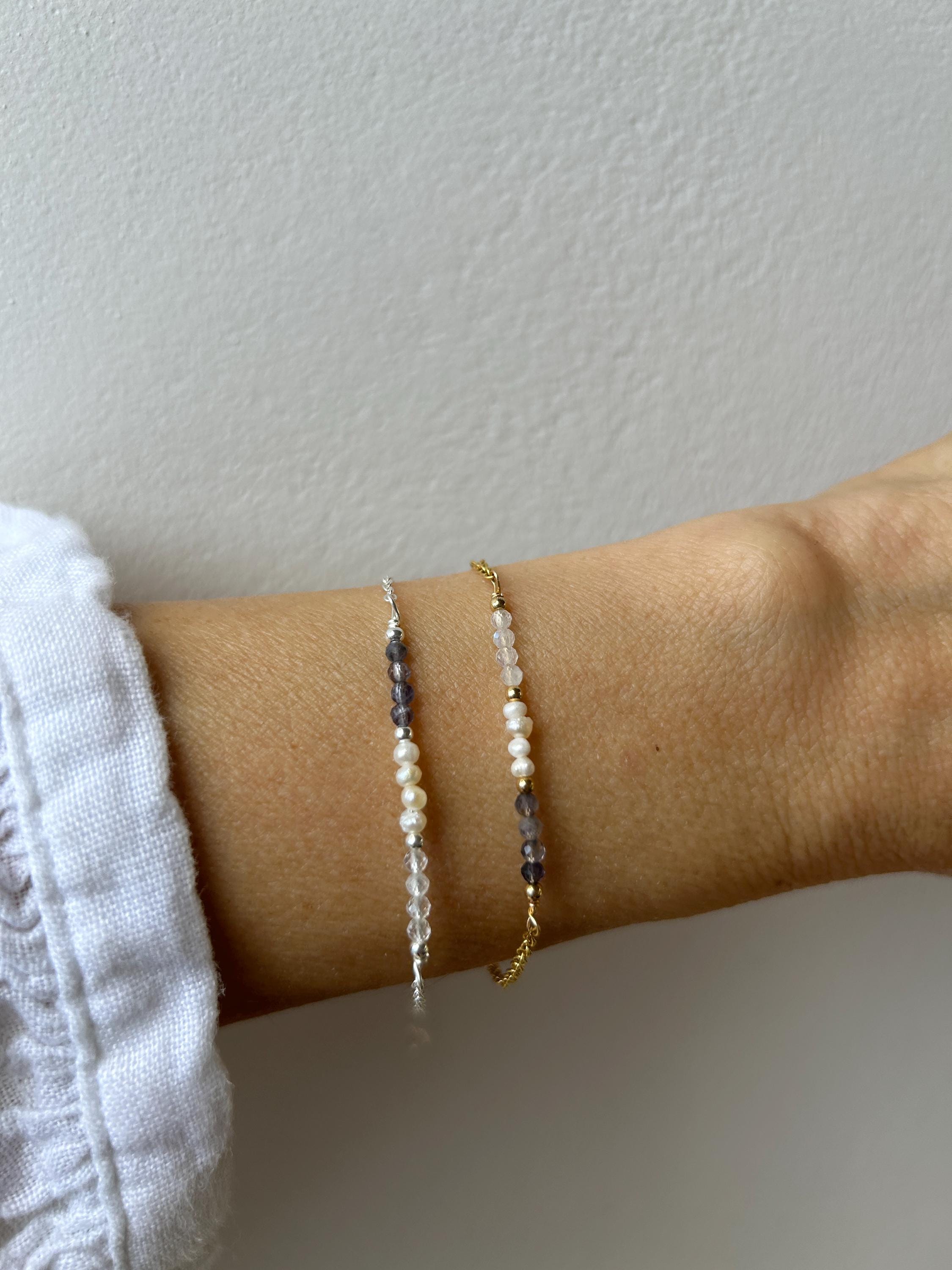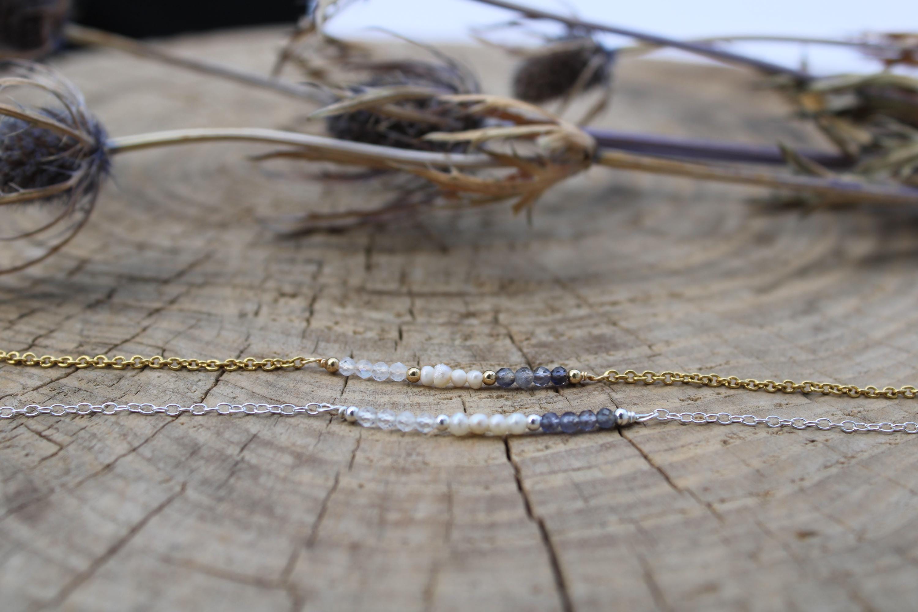 •Made with a line up of AAA quality micro faceted gemstones. These are very small measuring around 2.5mm. These include iolite and moonstone and tiny freshwater pearls.