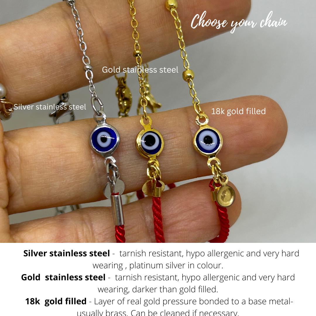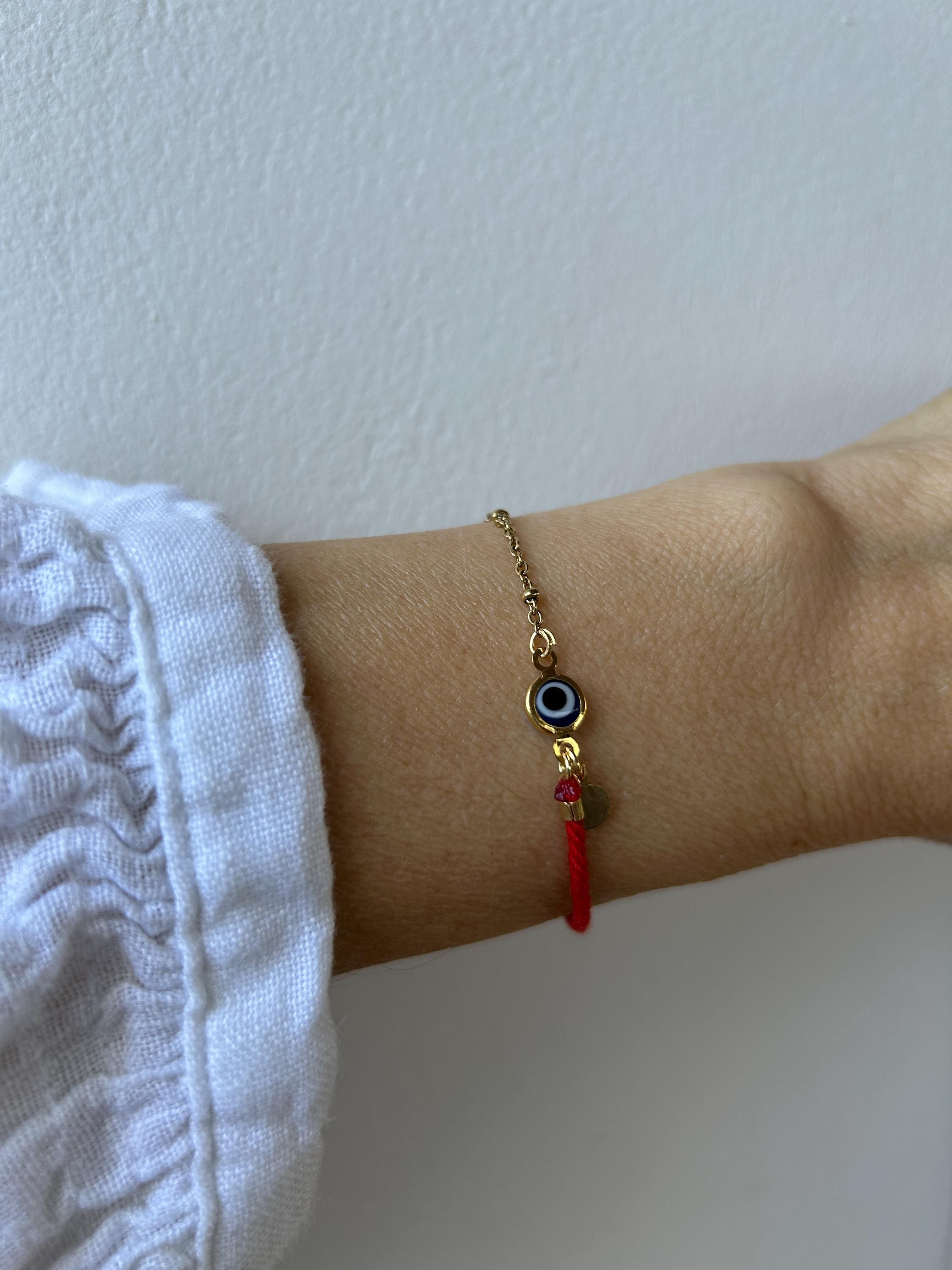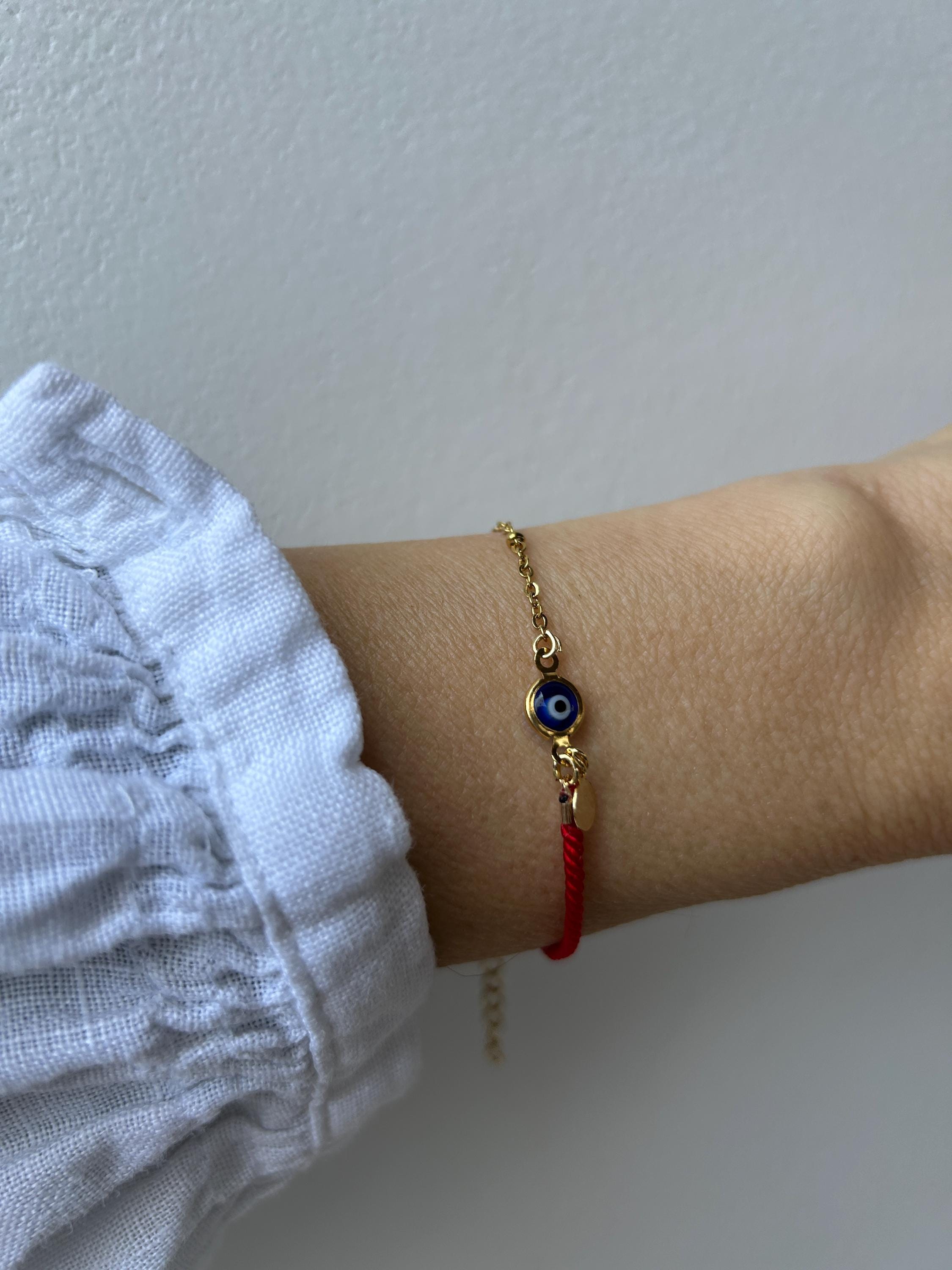 Keep yourself protected with this evil eye bracelet that also combines a red string .