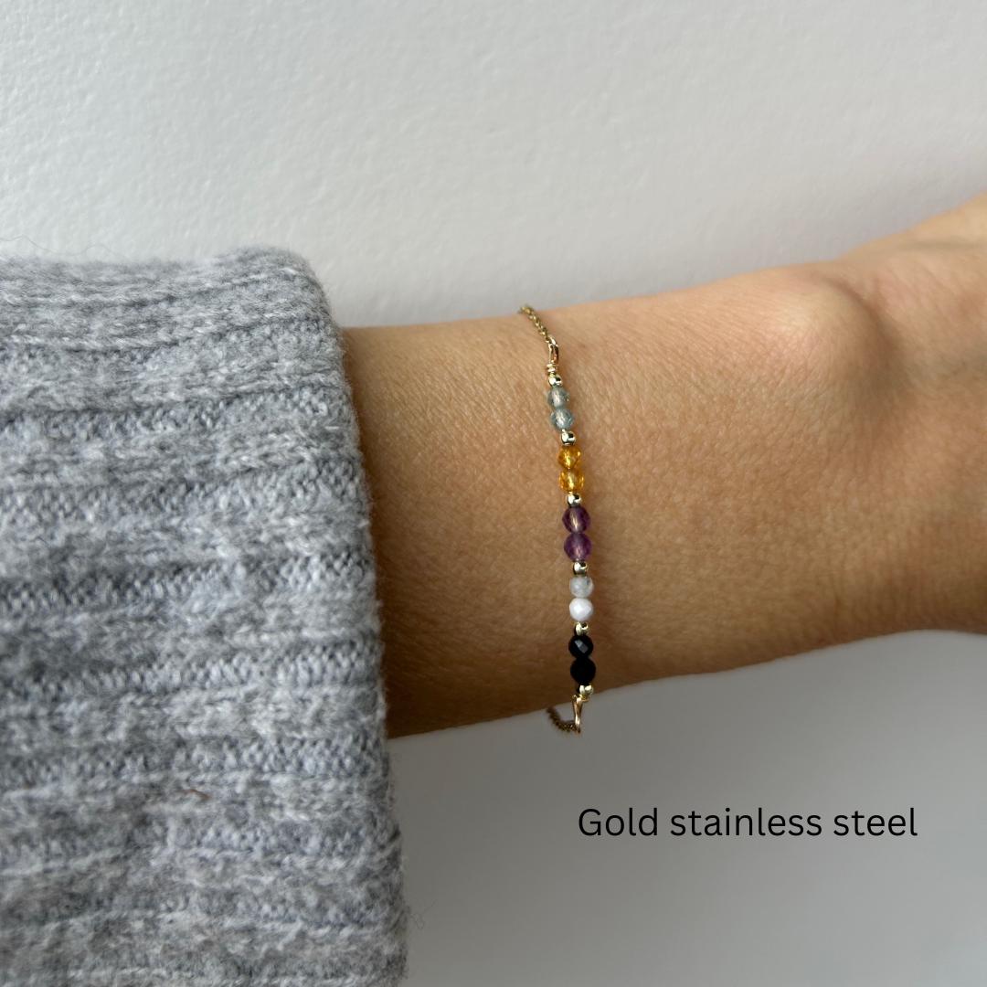 This little bracelet combines crystals that are associated with protection, blocking negative energy and are believed to have a calming influencing.