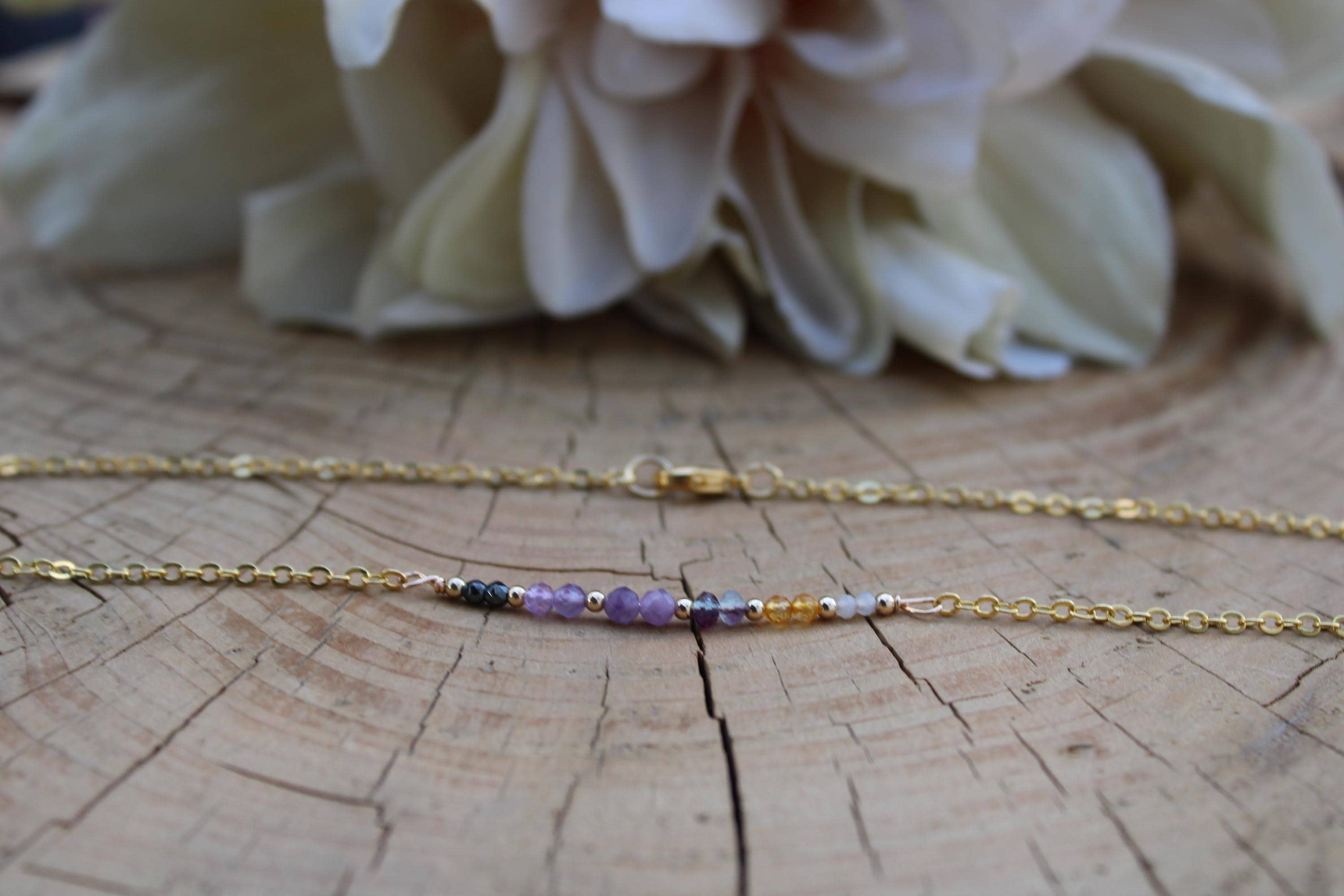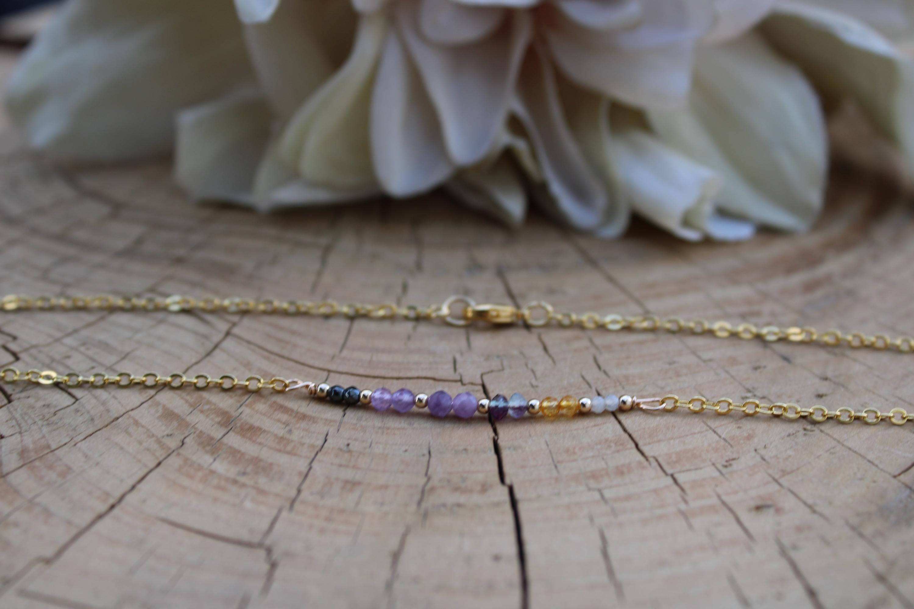 Beautiful crystals are combined with a delicate chain to create this lovely necklace with powerful metaphysical properties. It contains crystals ending in "ite" which are generally water unsafe crystals so please keep this in mind before placing an order.
