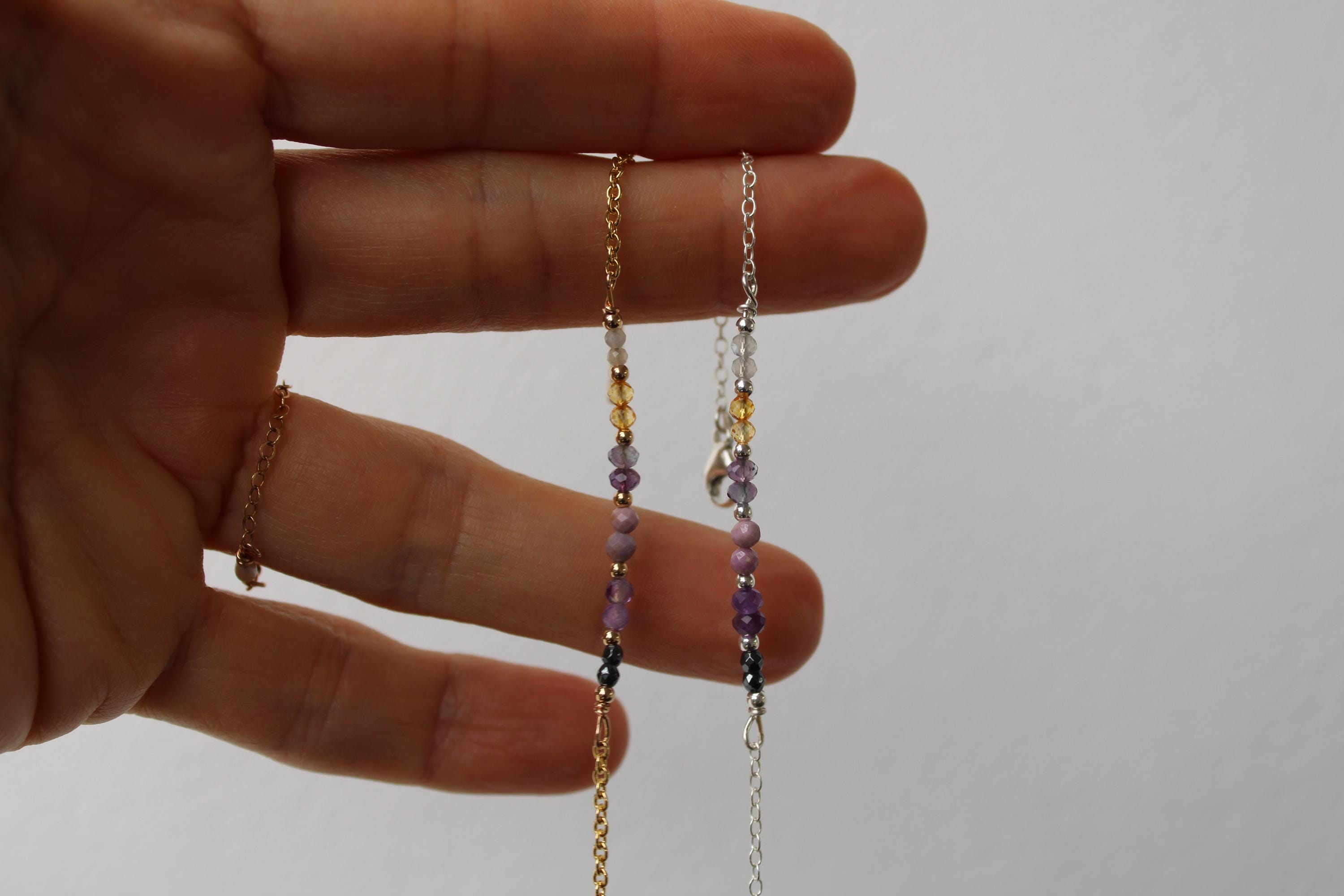 Beautiful crystals are combined with a delicate chain to create this lovely necklace with powerful metaphysical properties. It contains crystals ending in "ite" which are generally water unsafe crystals so please keep this in mind before placing an order.