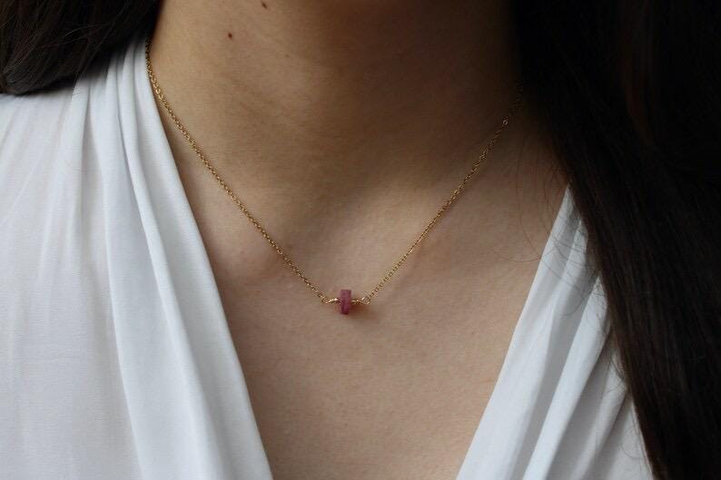Raw pink tourmaline is combined with a delicate chain to create this lovely protection necklace.