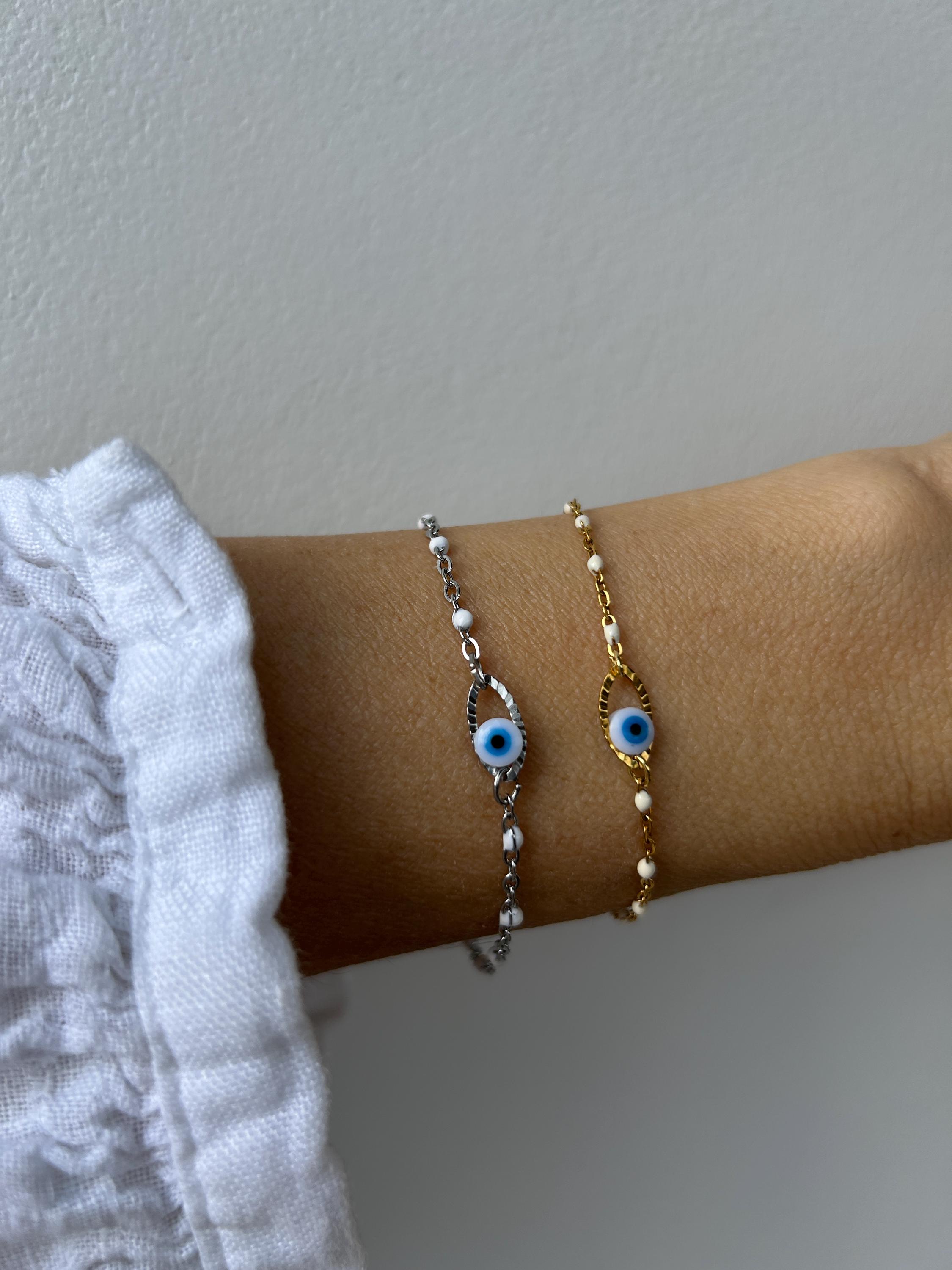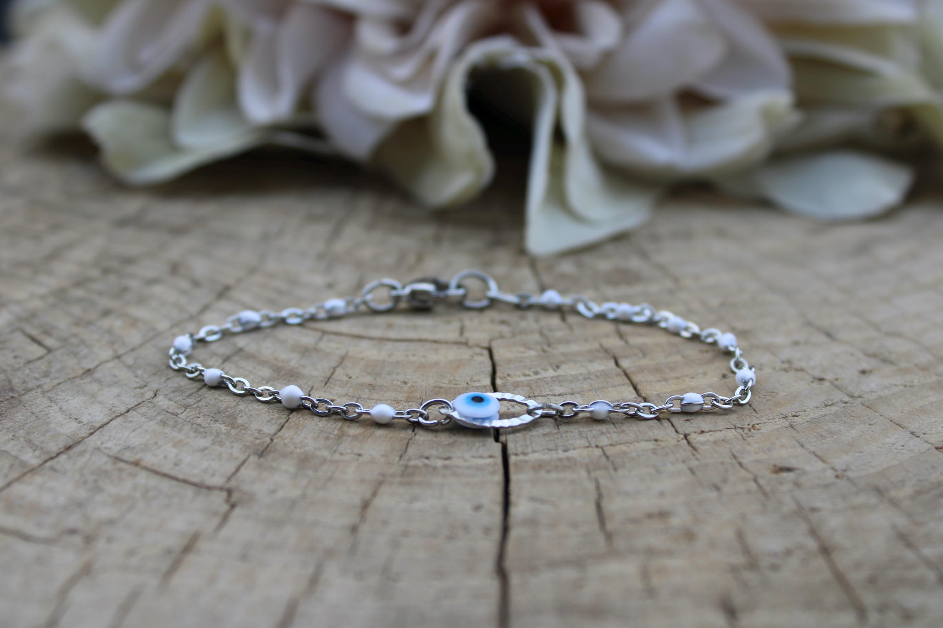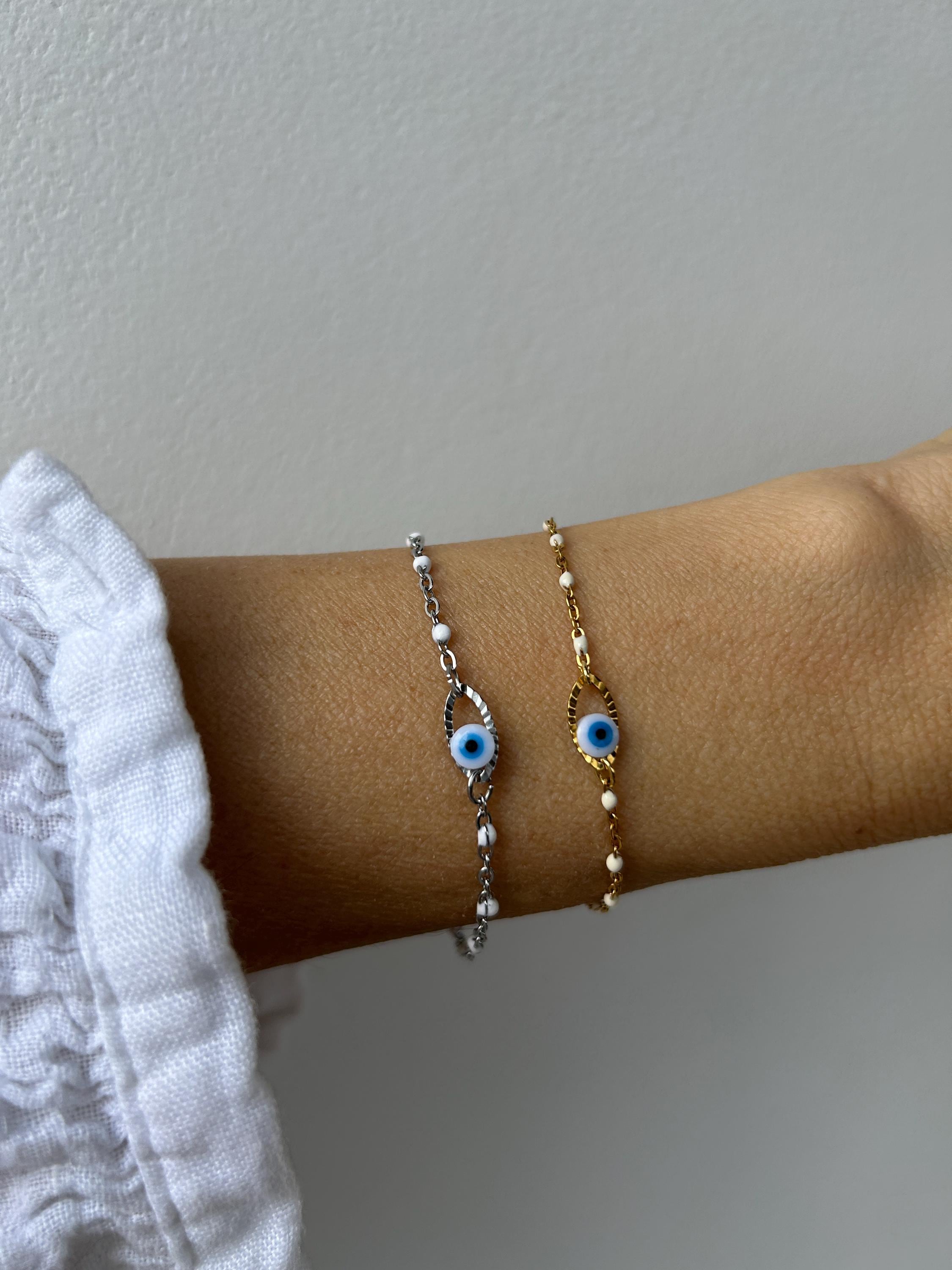Brush away negative energy and jealous prying eyes with this dainty evil eye bracelet!
