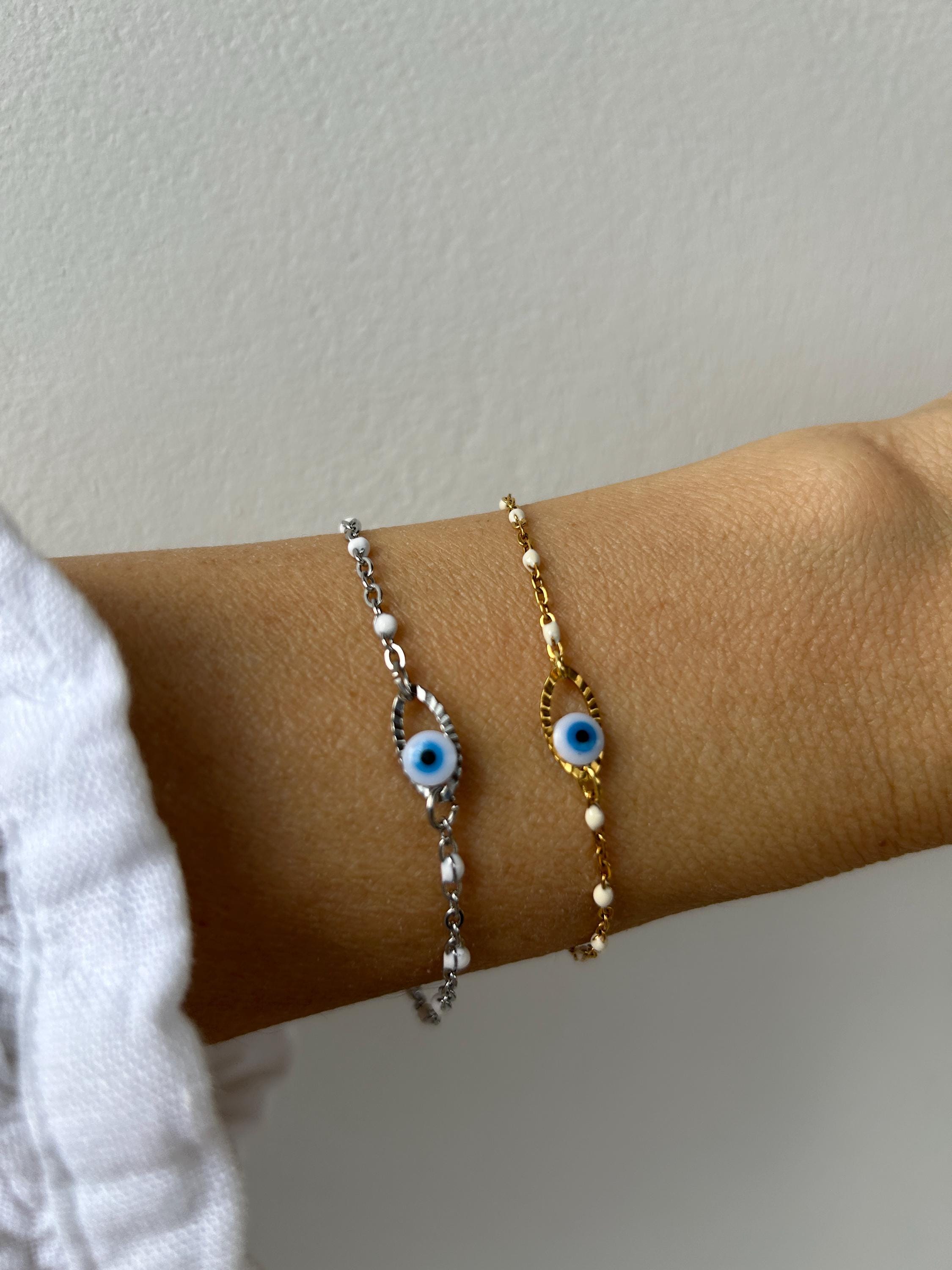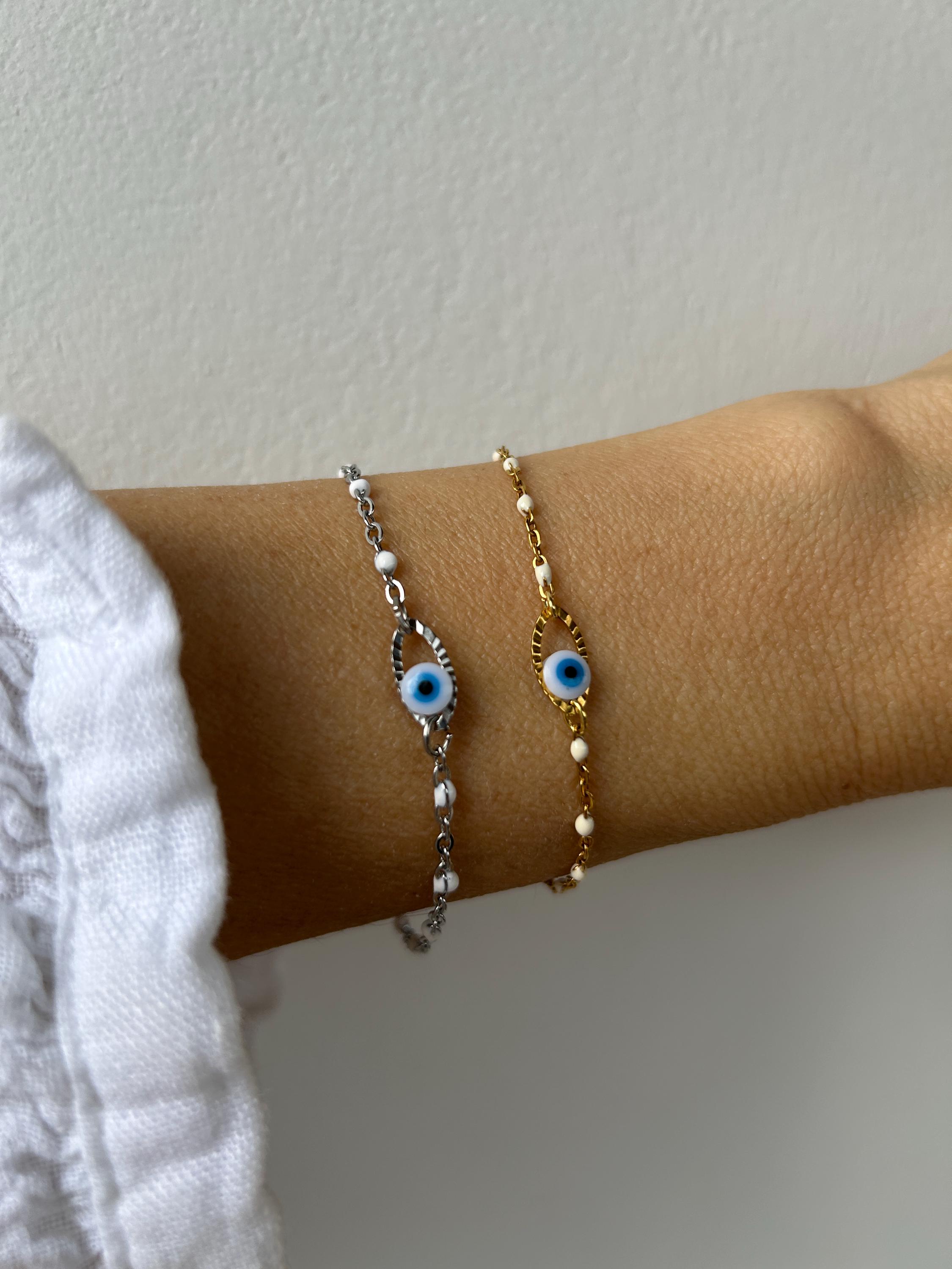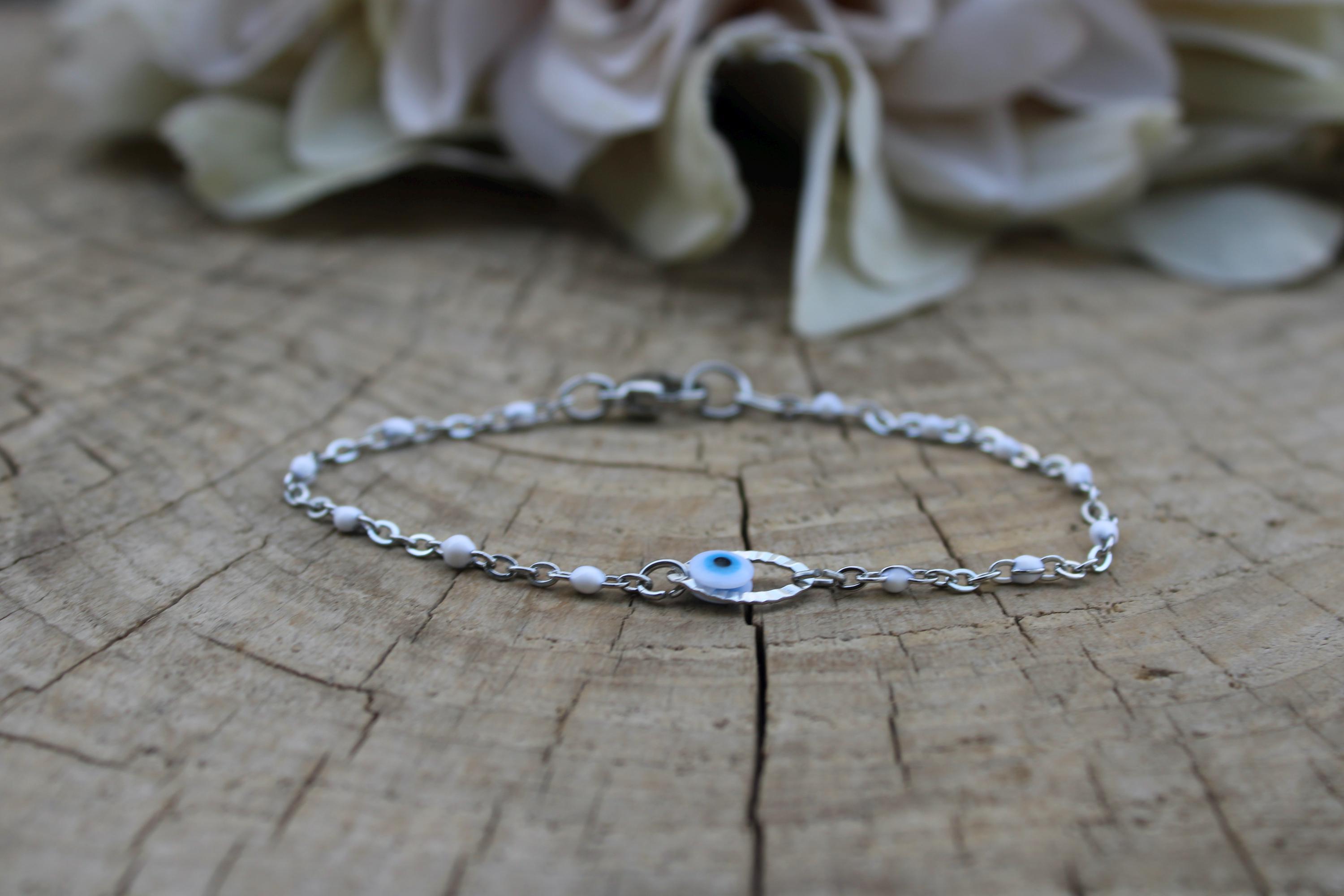 Brush away negative energy and jealous prying eyes with this dainty evil eye bracelet!