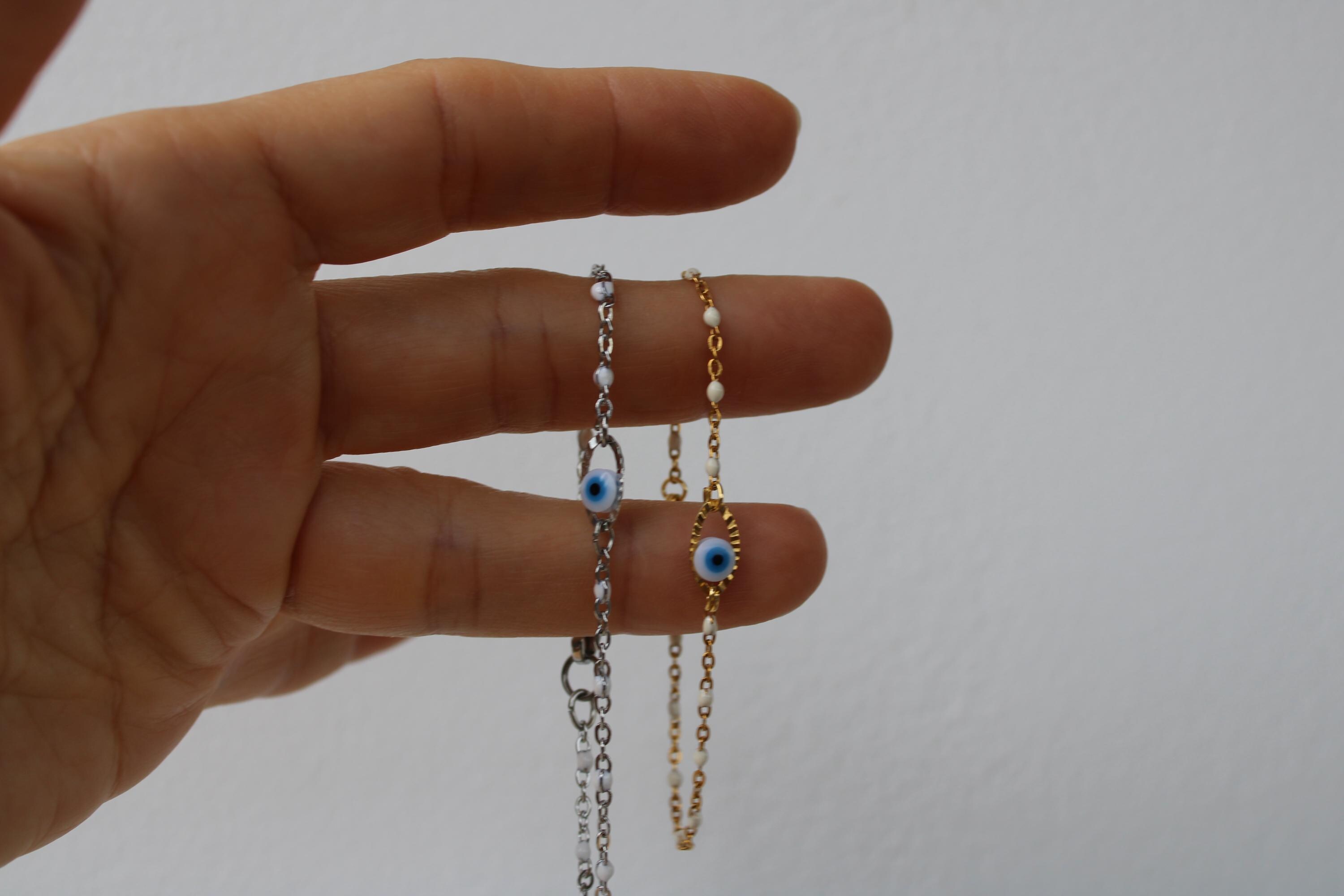 •It features a stainless steel enamel evil eye charm. This measures around 20mm. The enamel eye actually has grooves and moves in between the oval link.