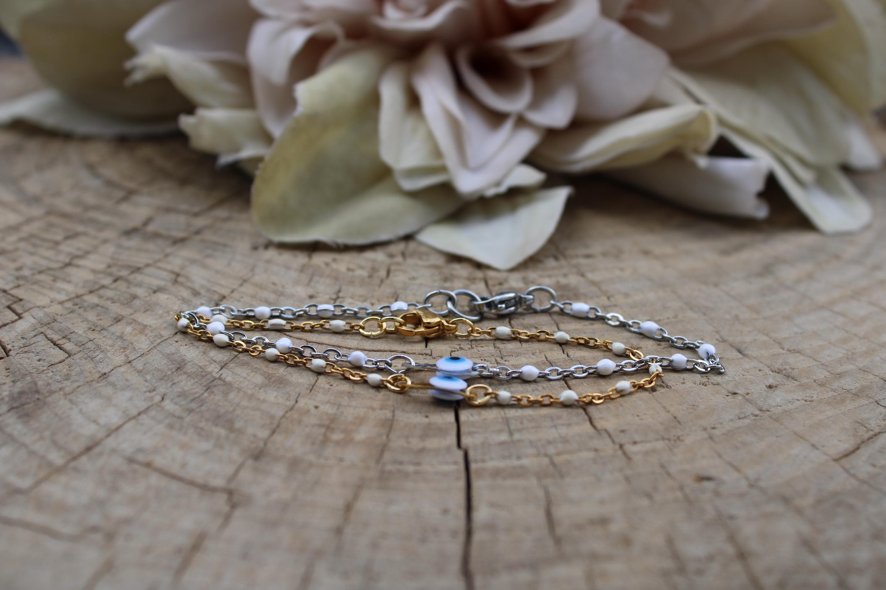 •On a white enamel beaded stainless steel chain. Choose between gold or silver.