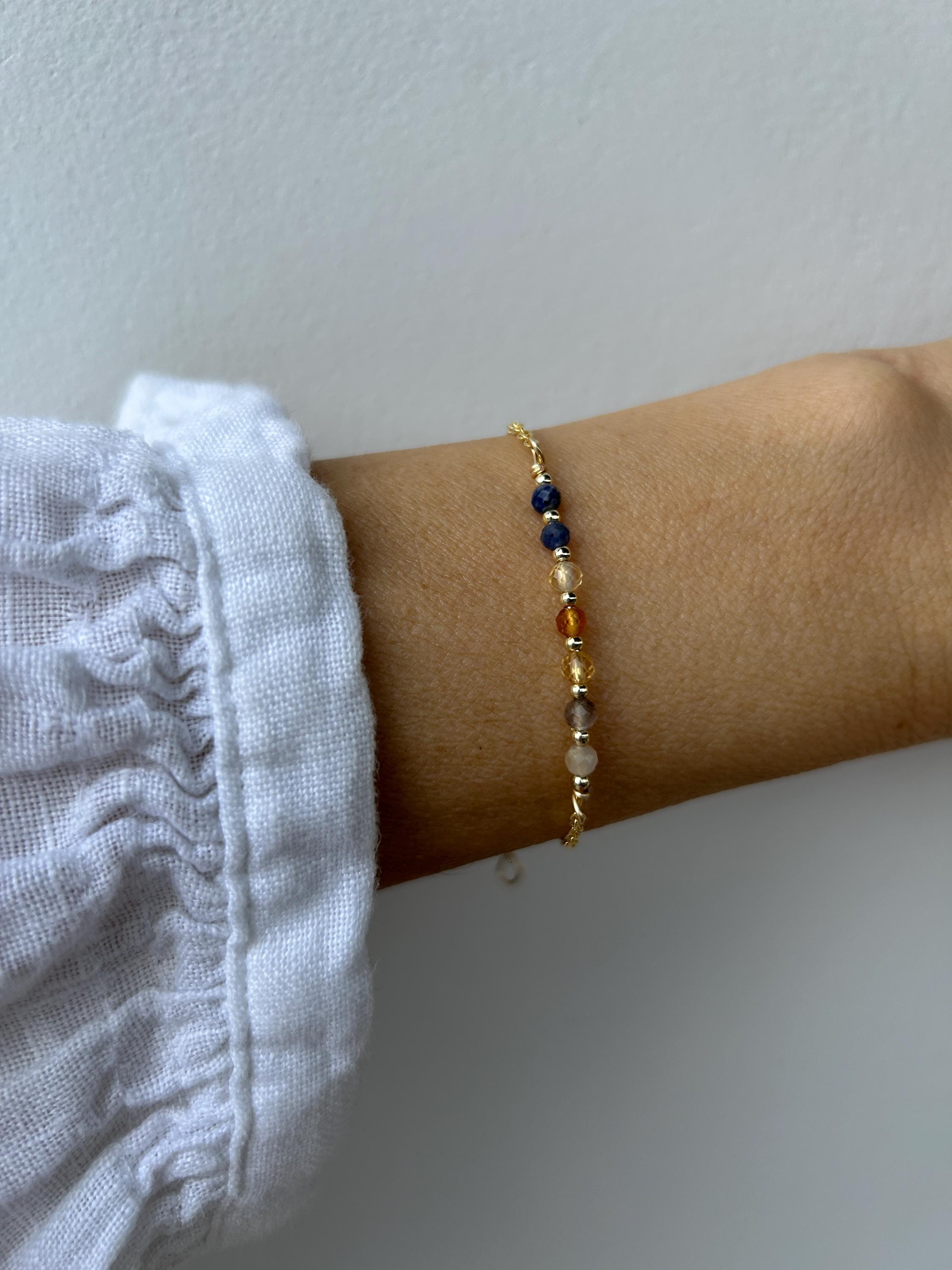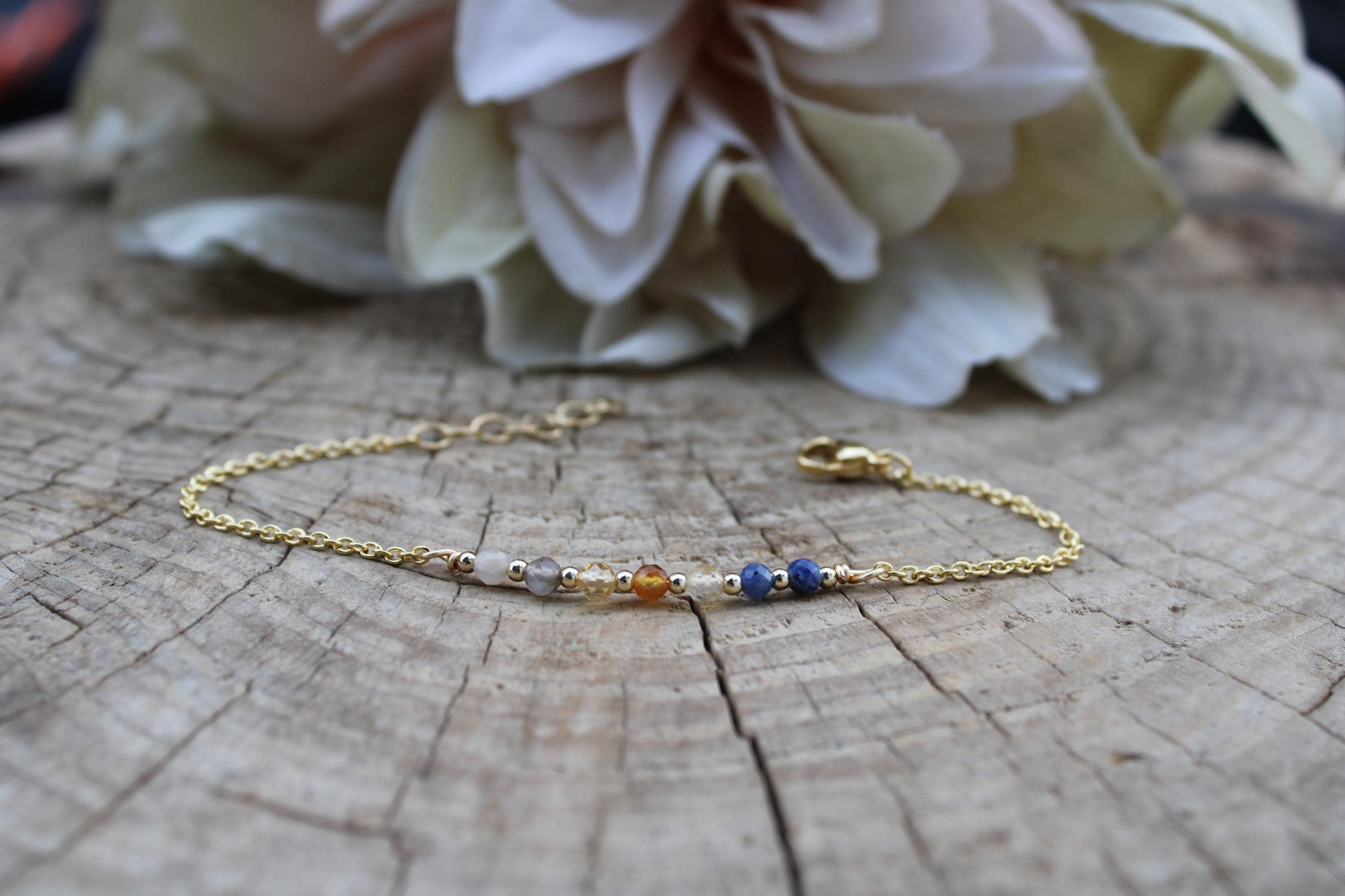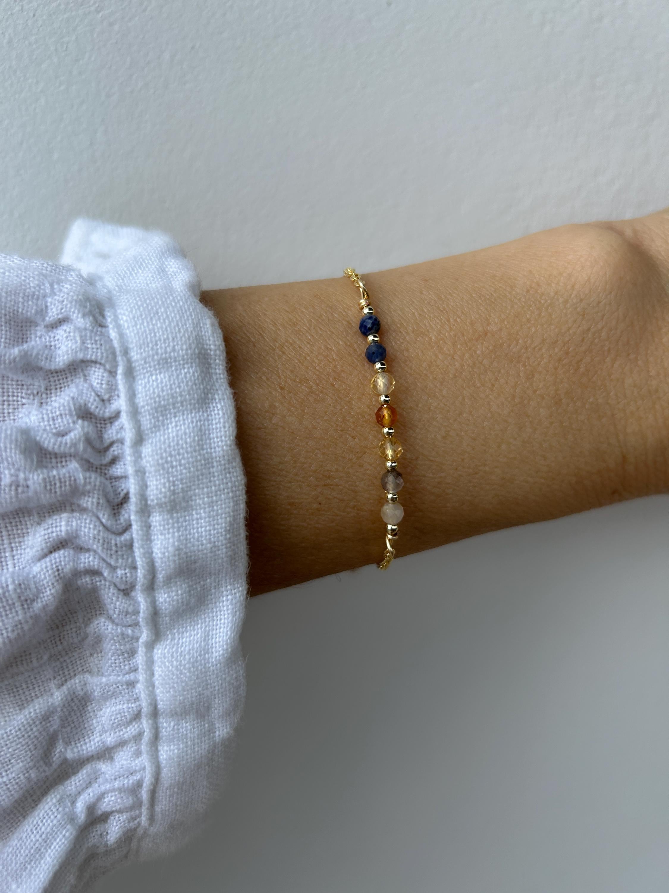 Beautiful crystals are combined with a delicate chain to create this lovely bracelet with powerful metaphysical properties. As it contains crystals ending in "ite" which are generally water unsafe crystals so please keep this in mind before placing an order.