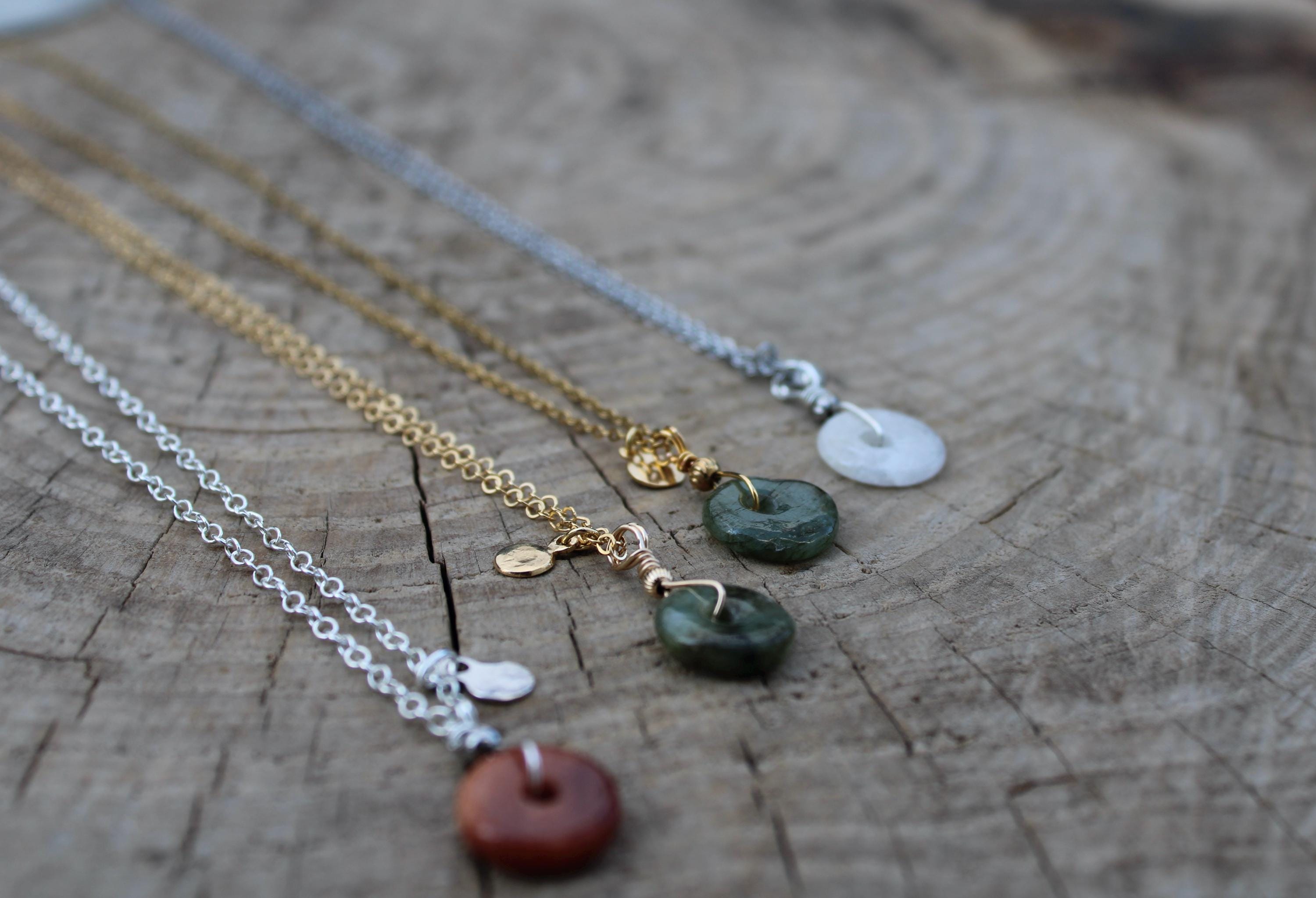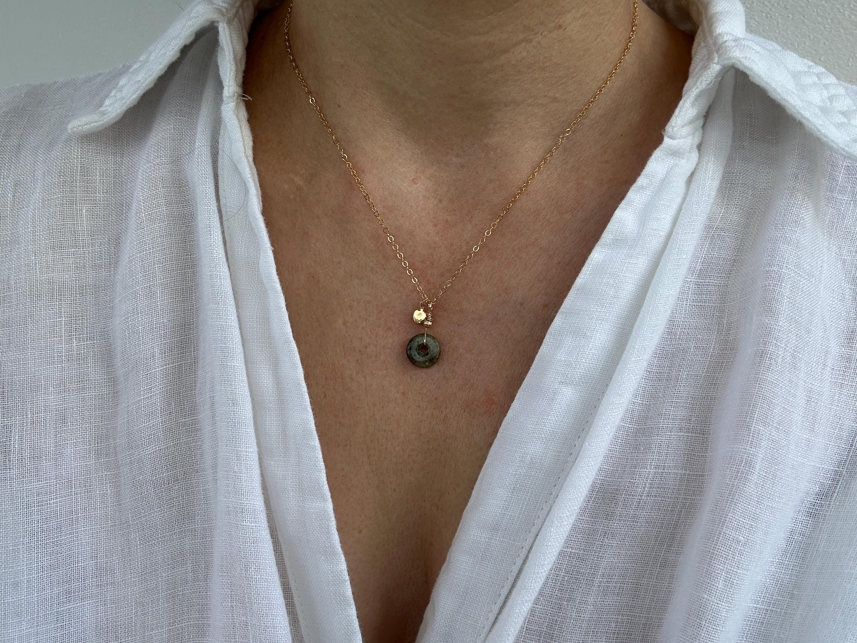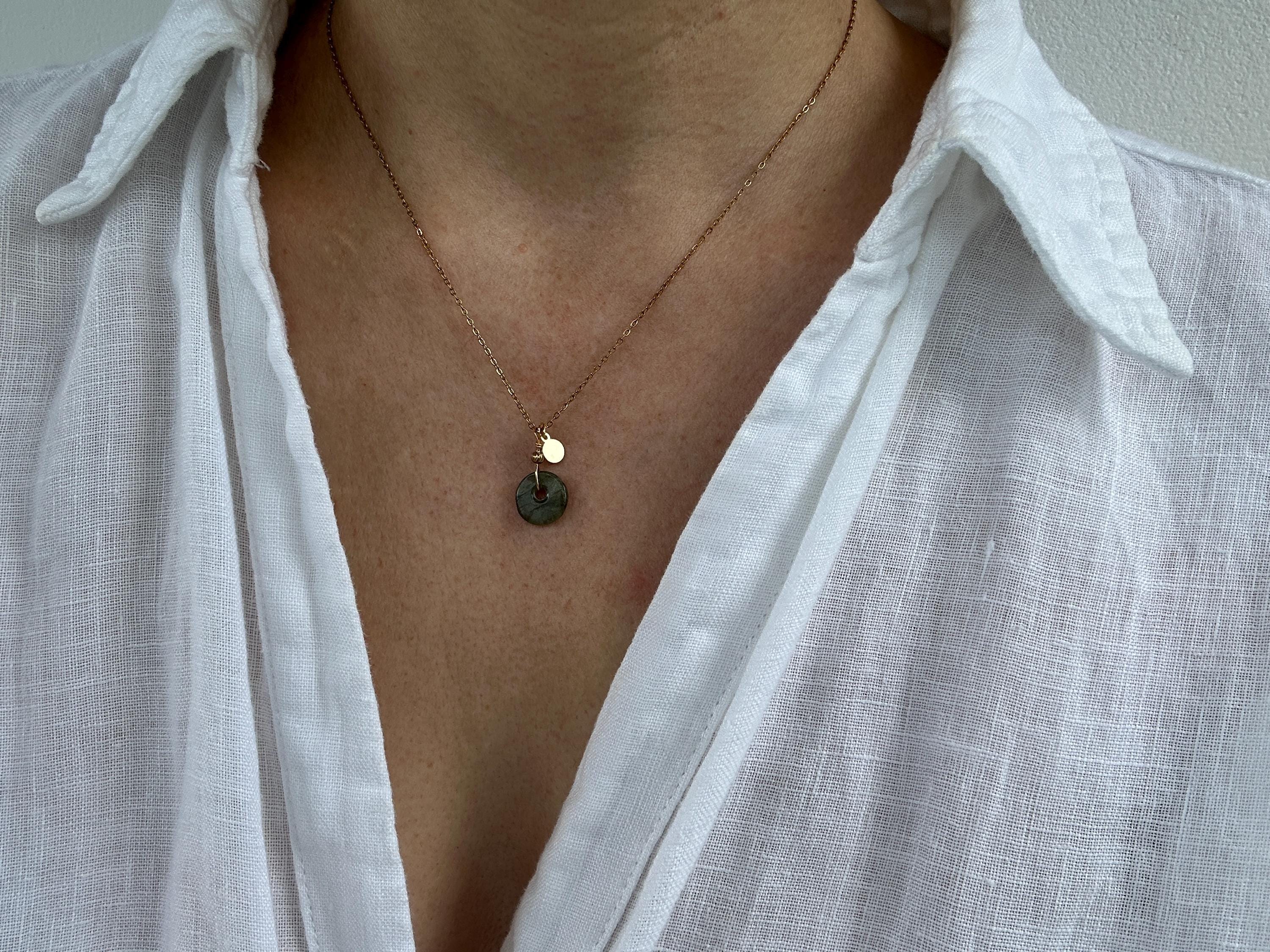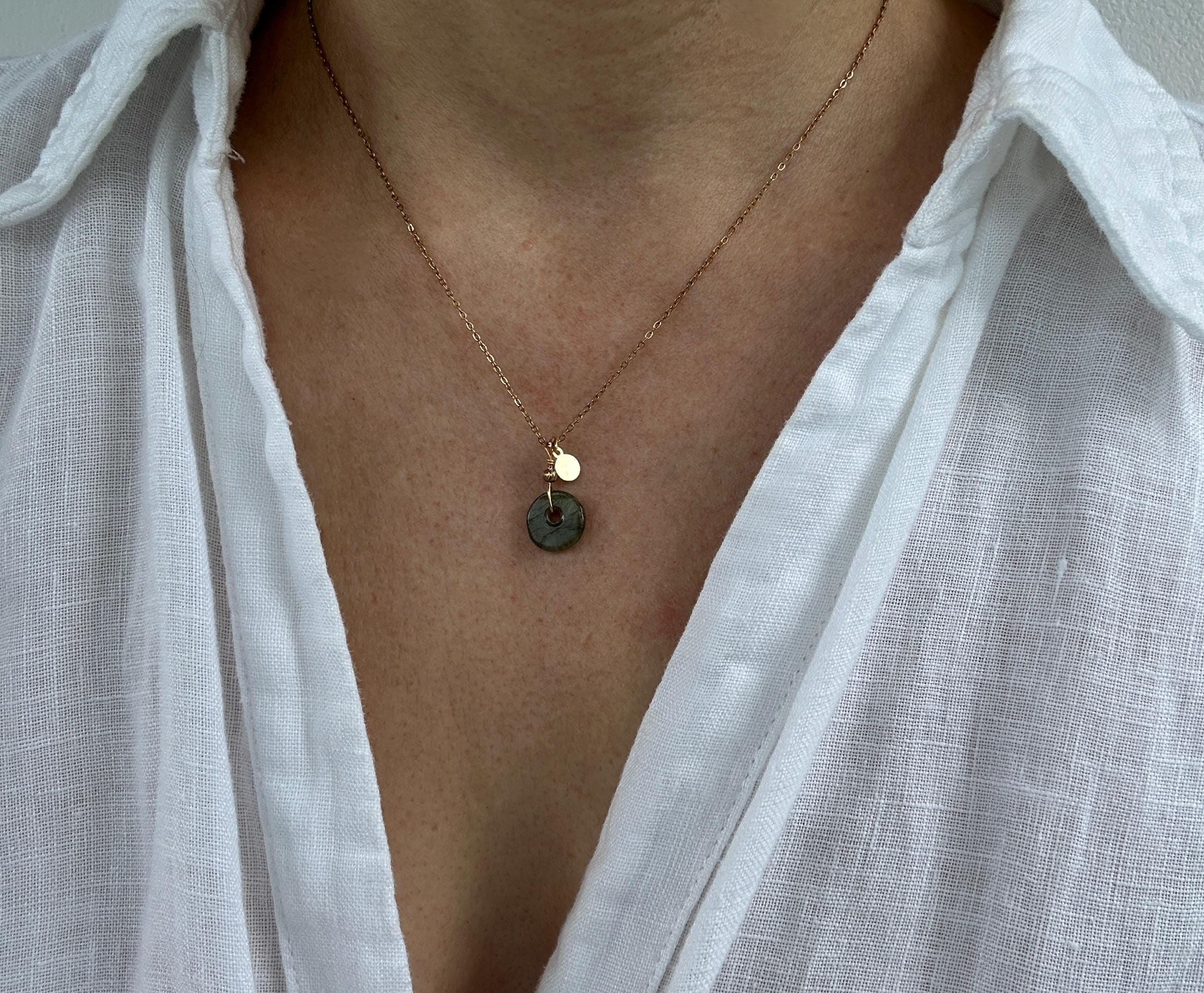 This necklace is features a genuine Burmese jade donut that is associated with good luck and prosperity. Personalise it by choosing the jade colour and chain of your choice.