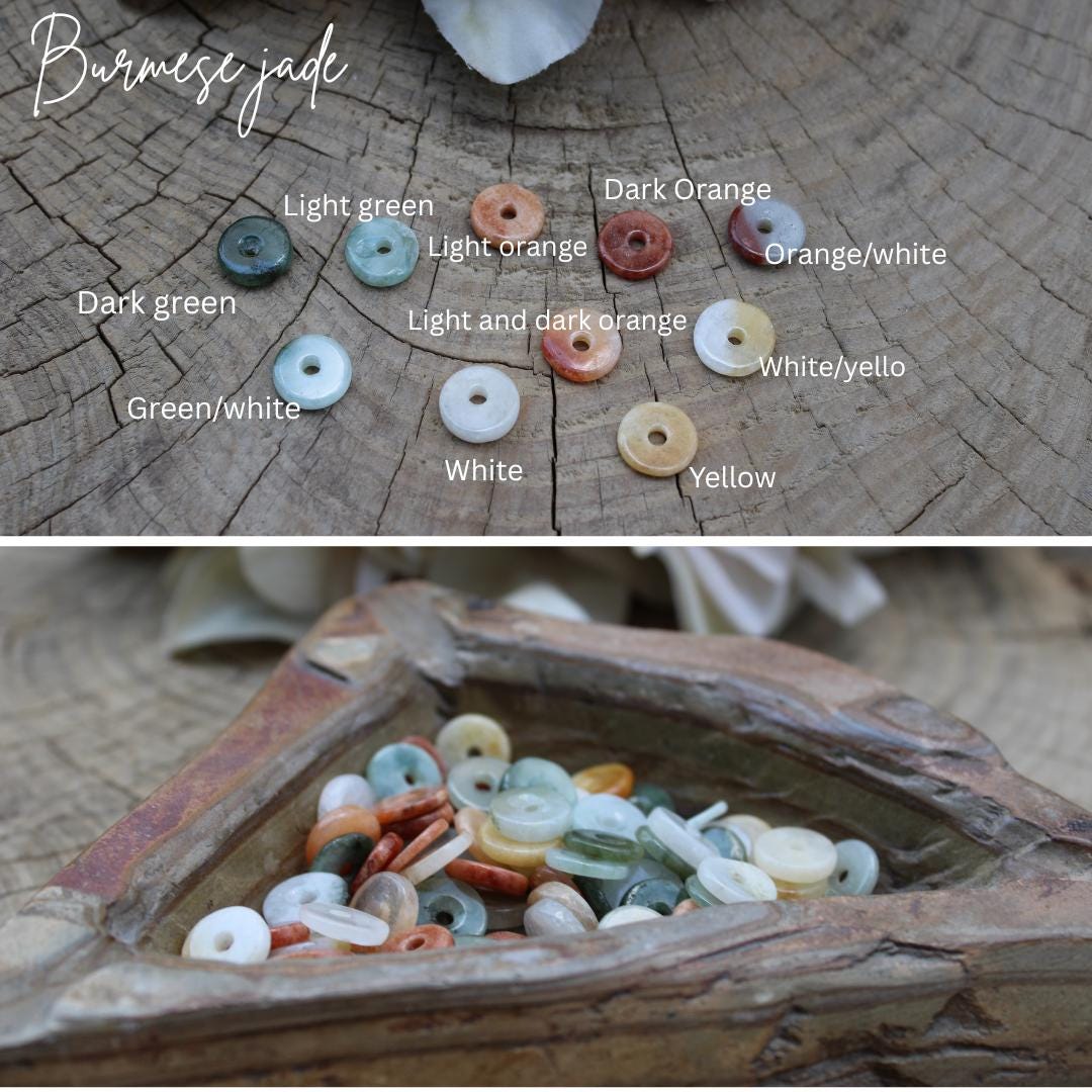 • Made with beautiful Burmese jade donut beads measuring around 9mm. These are available in a variety in colours and combinations and each stone is unique. See reference photo and state in the personalisation section which one you prefer.