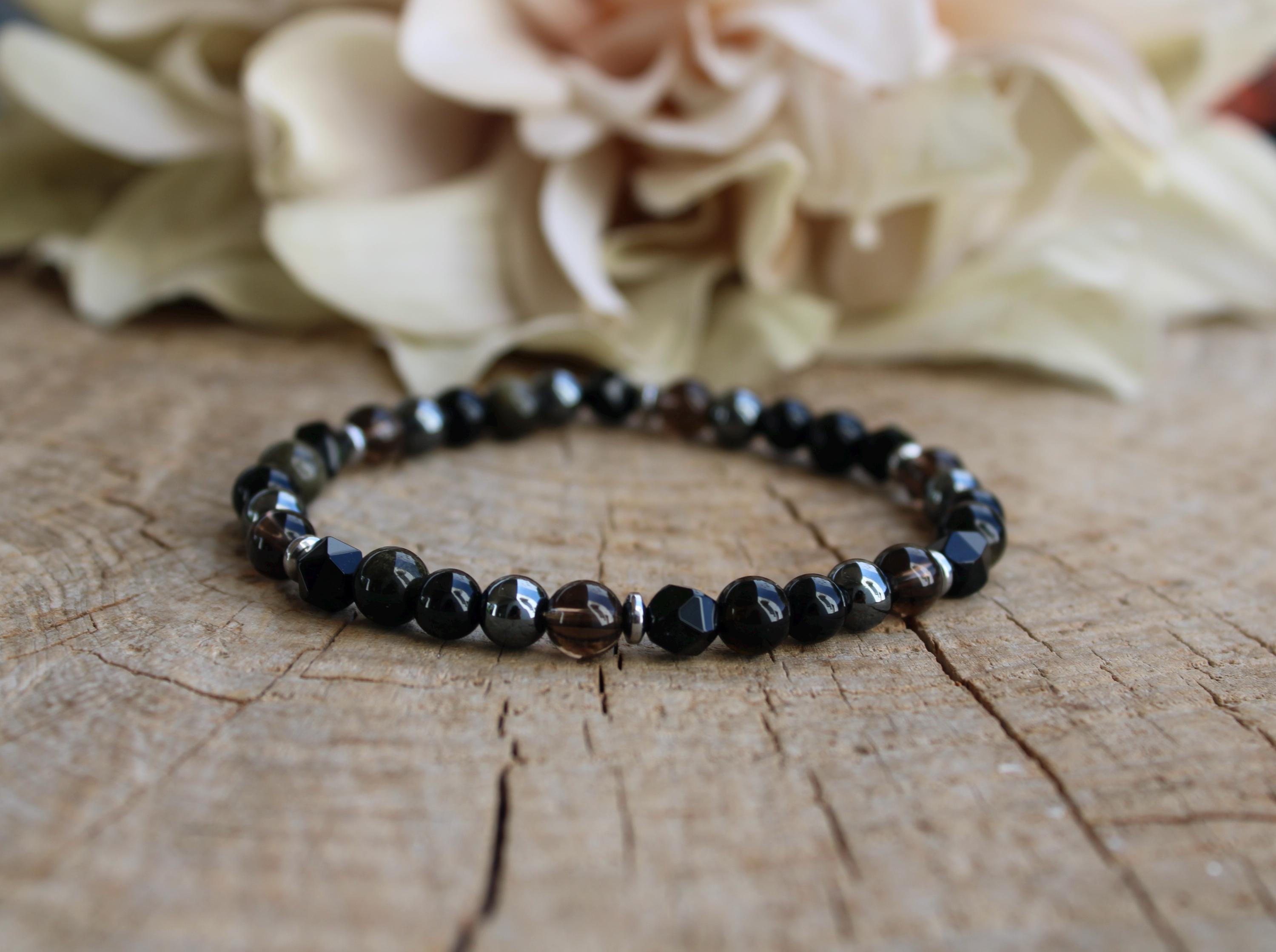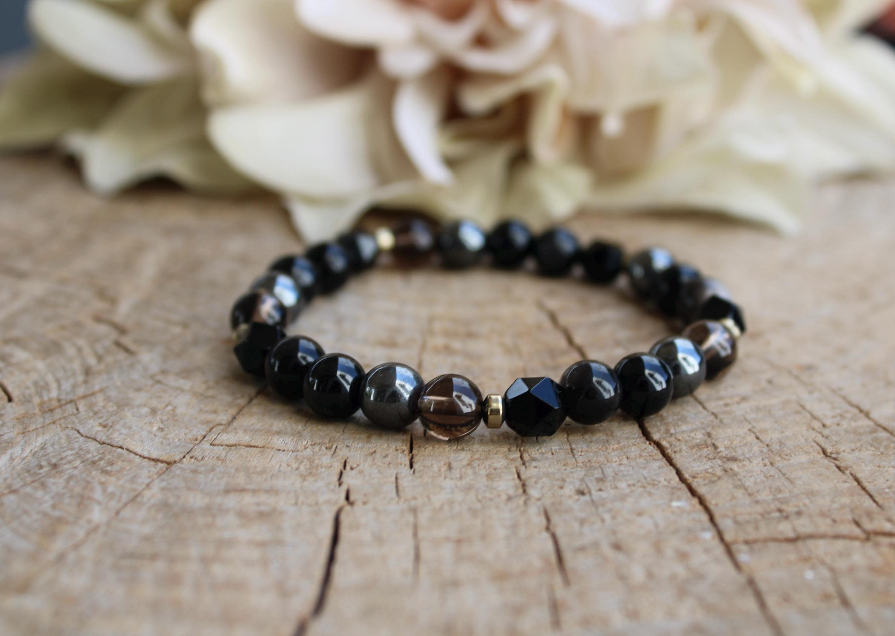 •These include starcut black onyx, gold sheen obsidian, black tourmaline, gunmetal hematite and smoky quartz. Choose between 6 or 8mm beads.