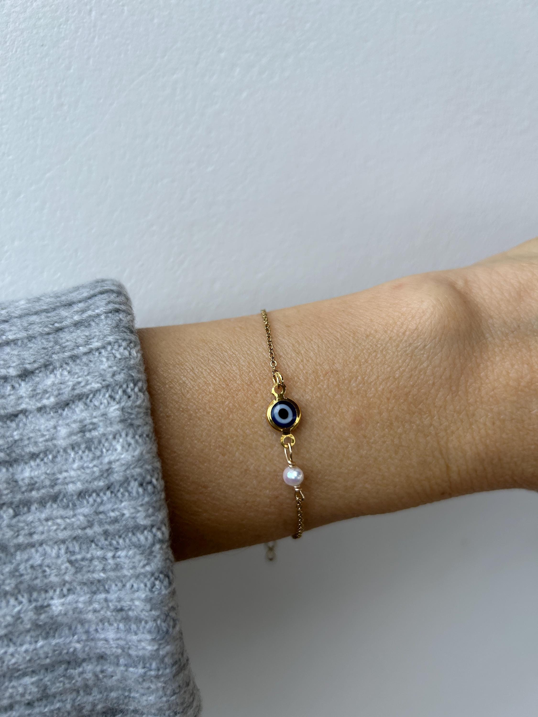 Brush away negative energy and jealous prying eyes with this dainty evil eye bracelet!