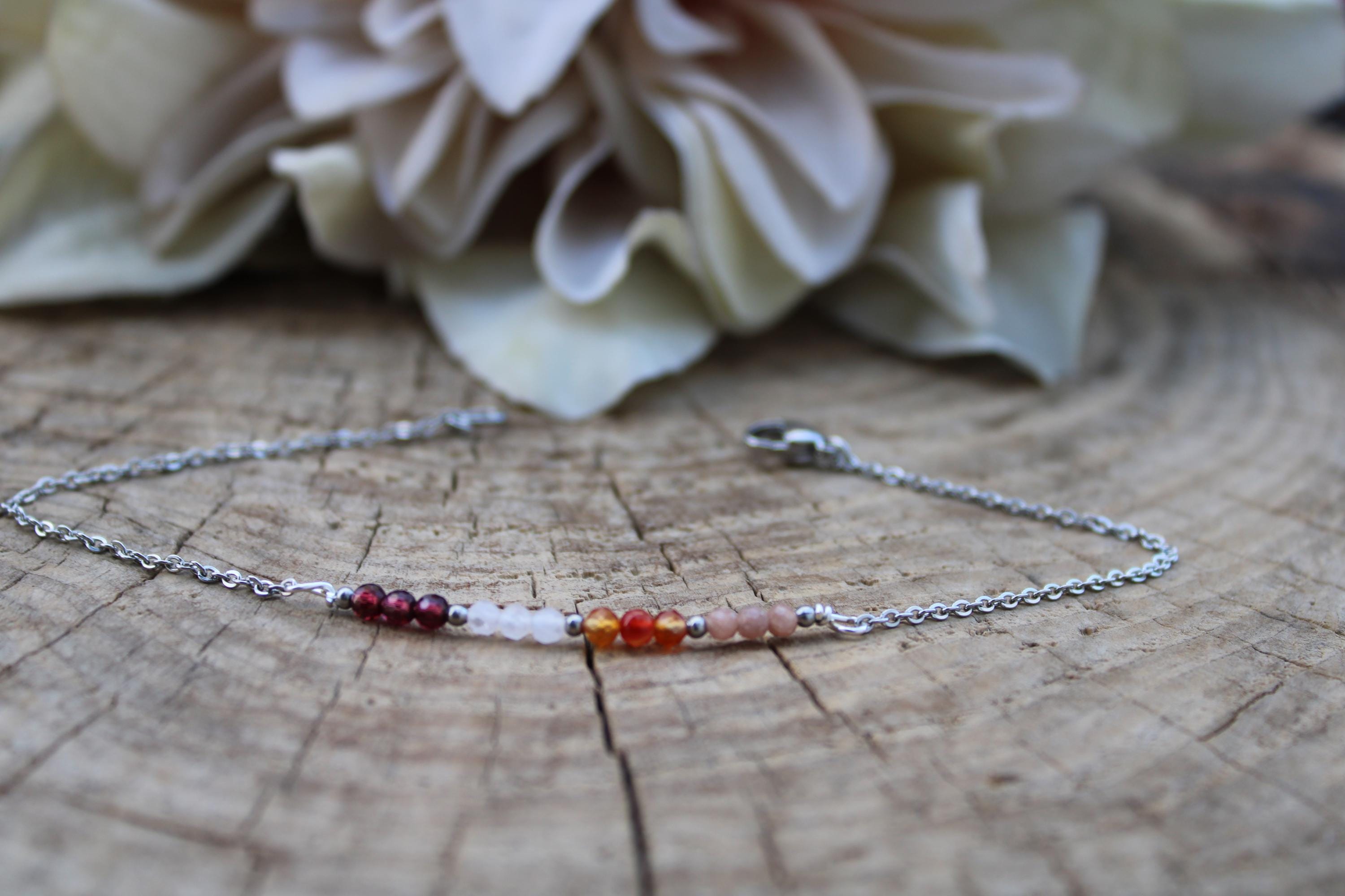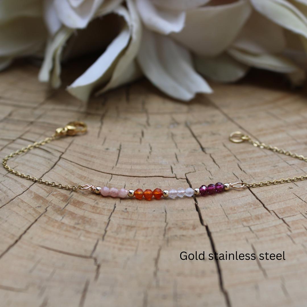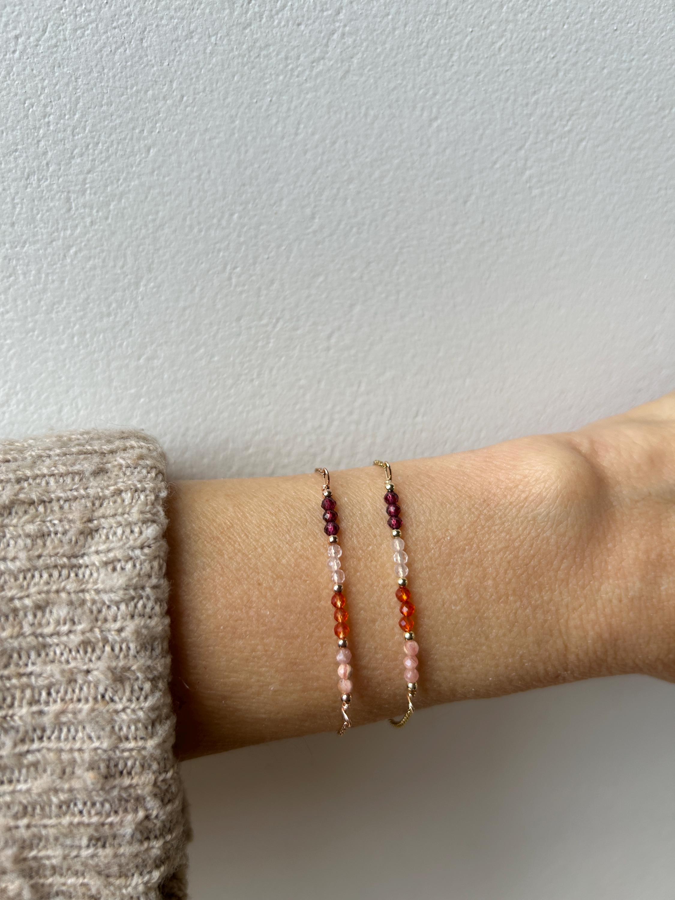 This little bracelet combines four different gemstones in beautiful hues of pink, peach and orange that are have powerful metaphysical properties.