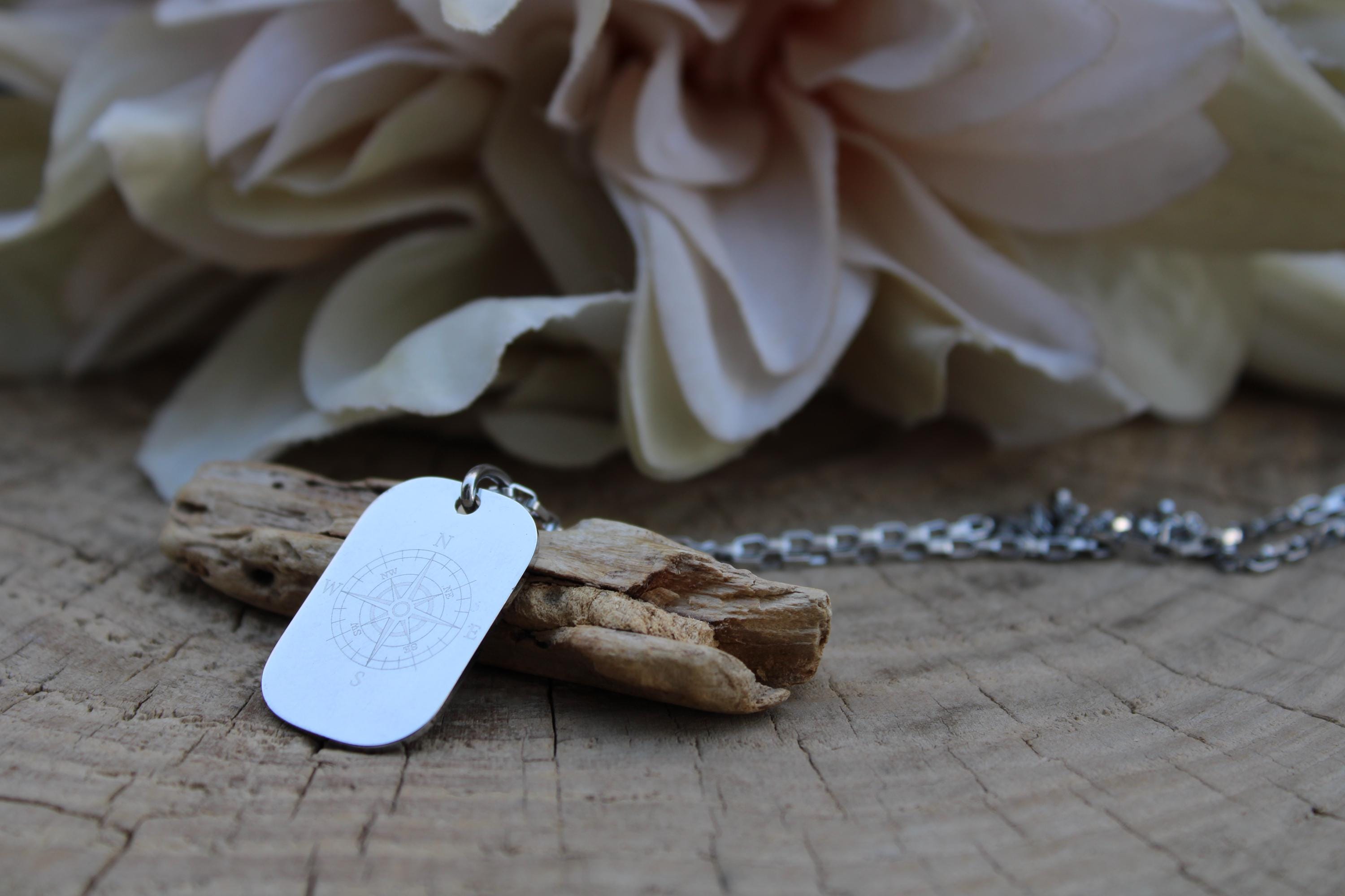 •This design features a rectangular stainless steel North Star compass pendant measuring 25 x 16mm.