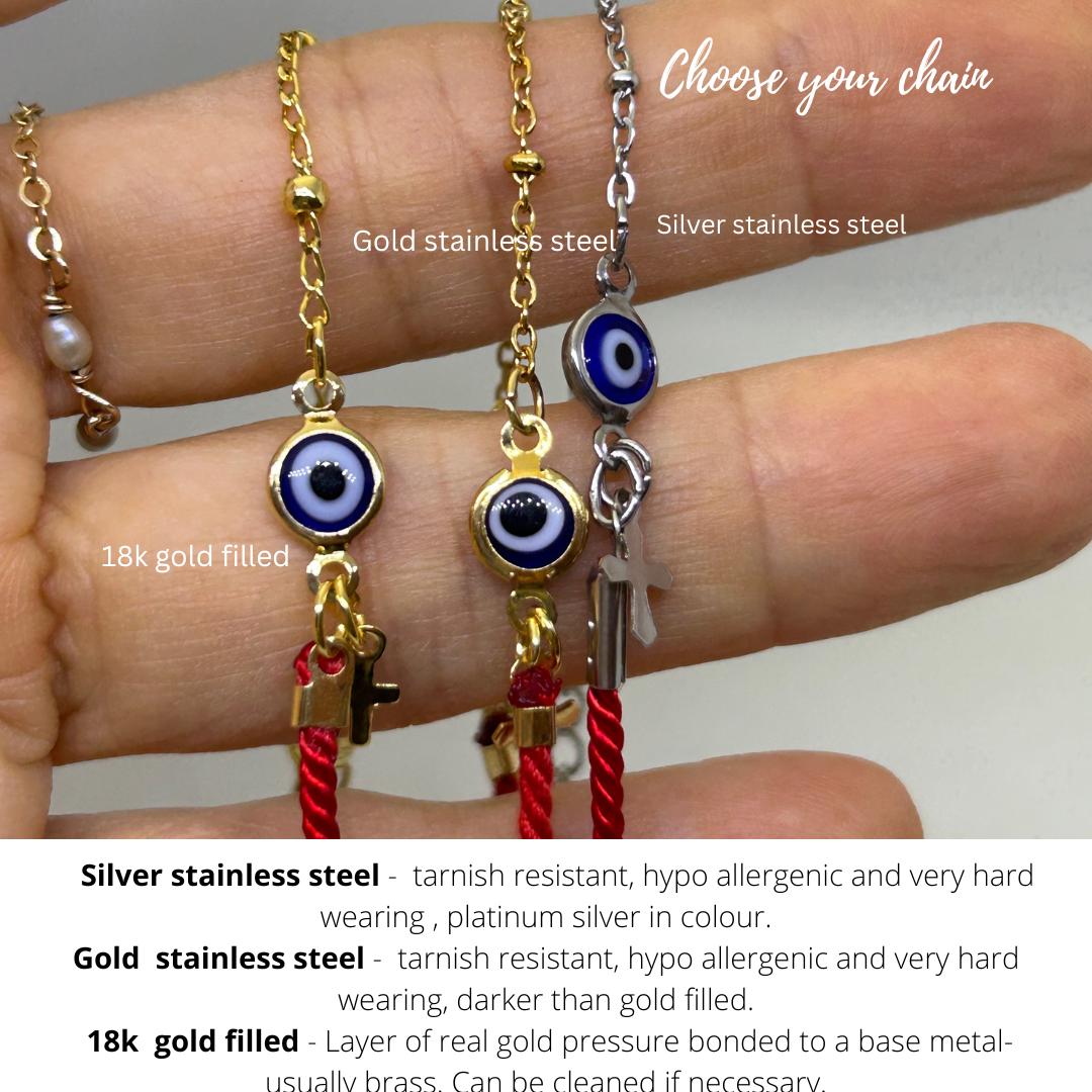 Keep yourself protected with this evil eye bracelet that also combines a red string .