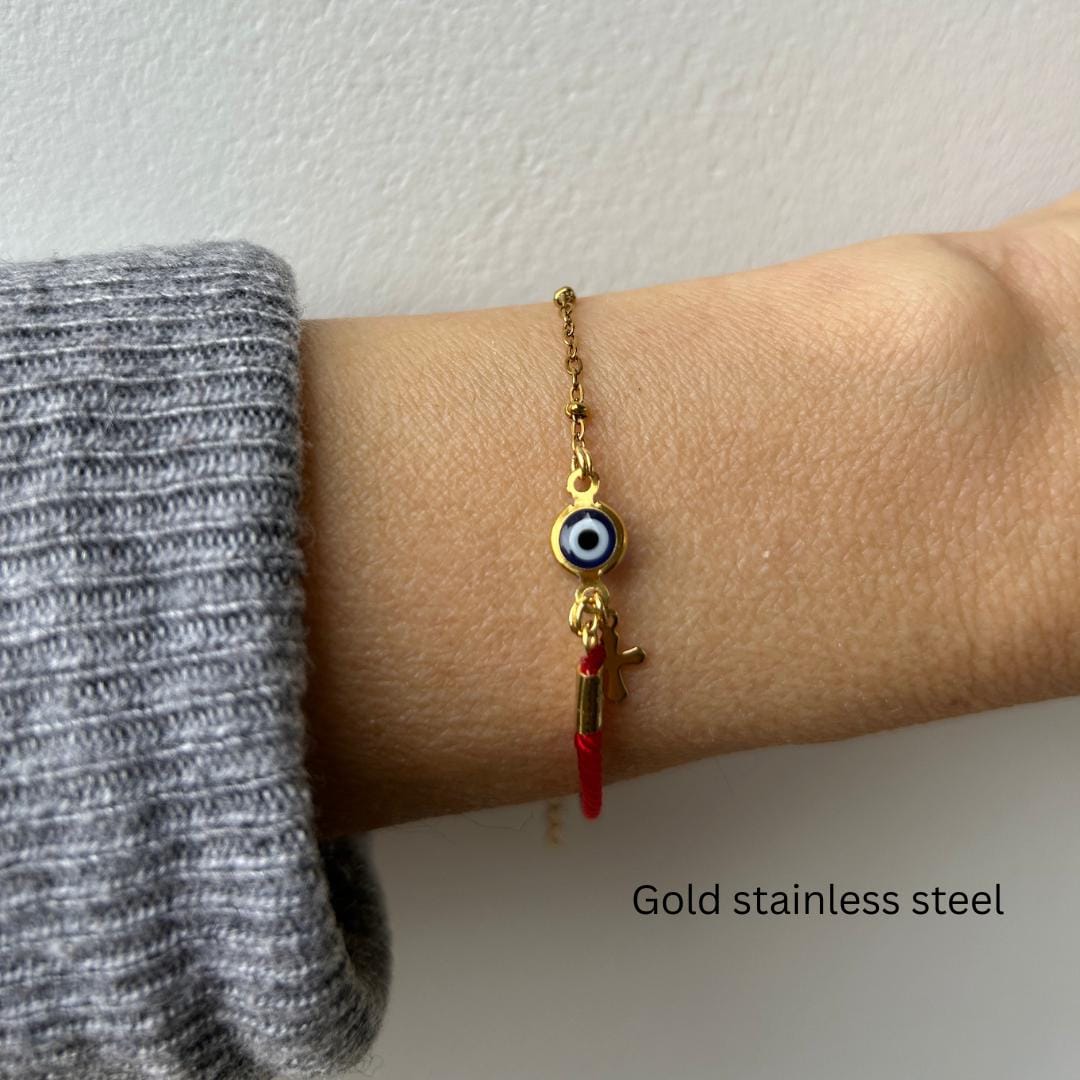 Keep yourself protected with this evil eye bracelet that also combines a red string .