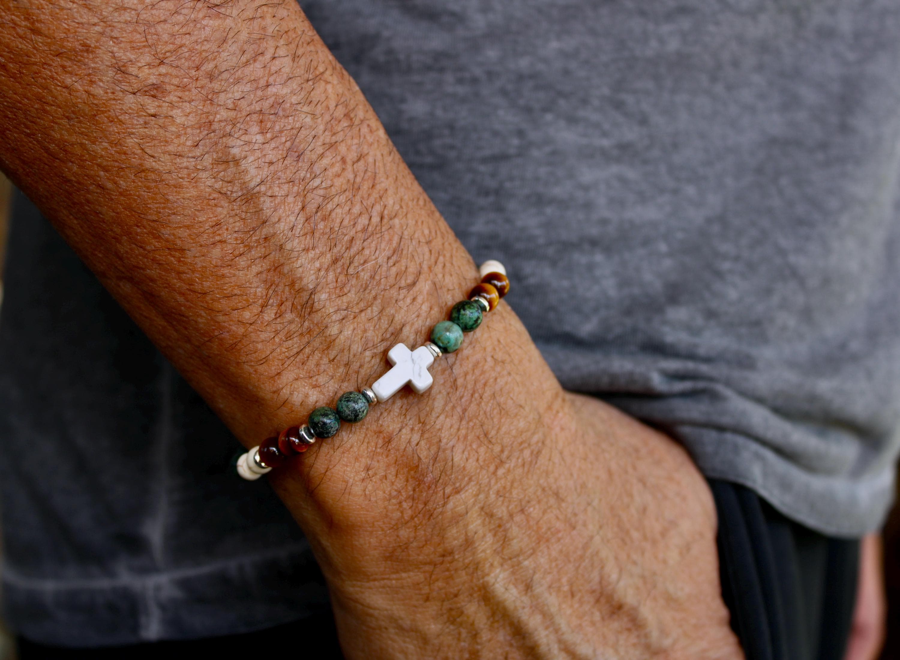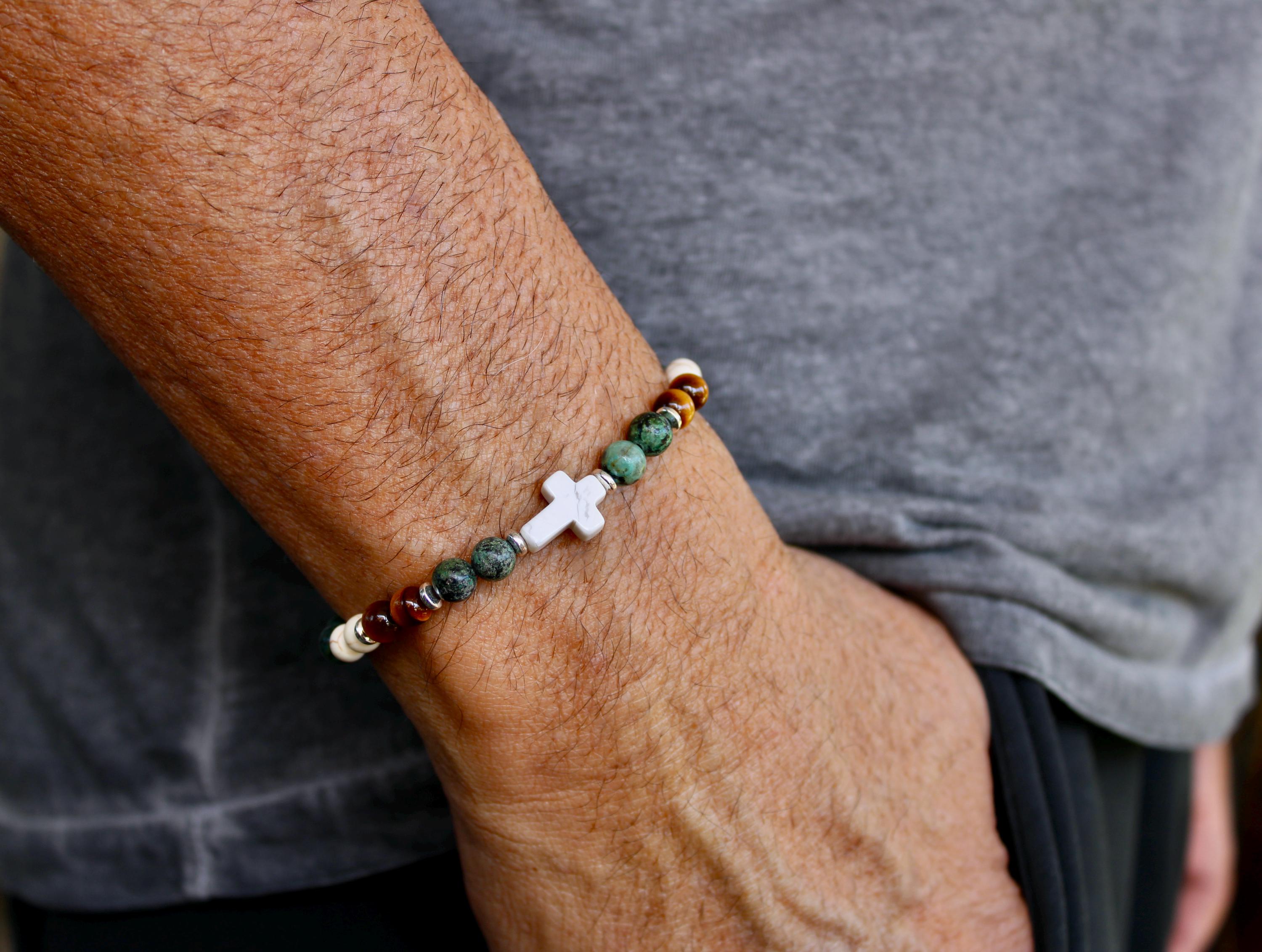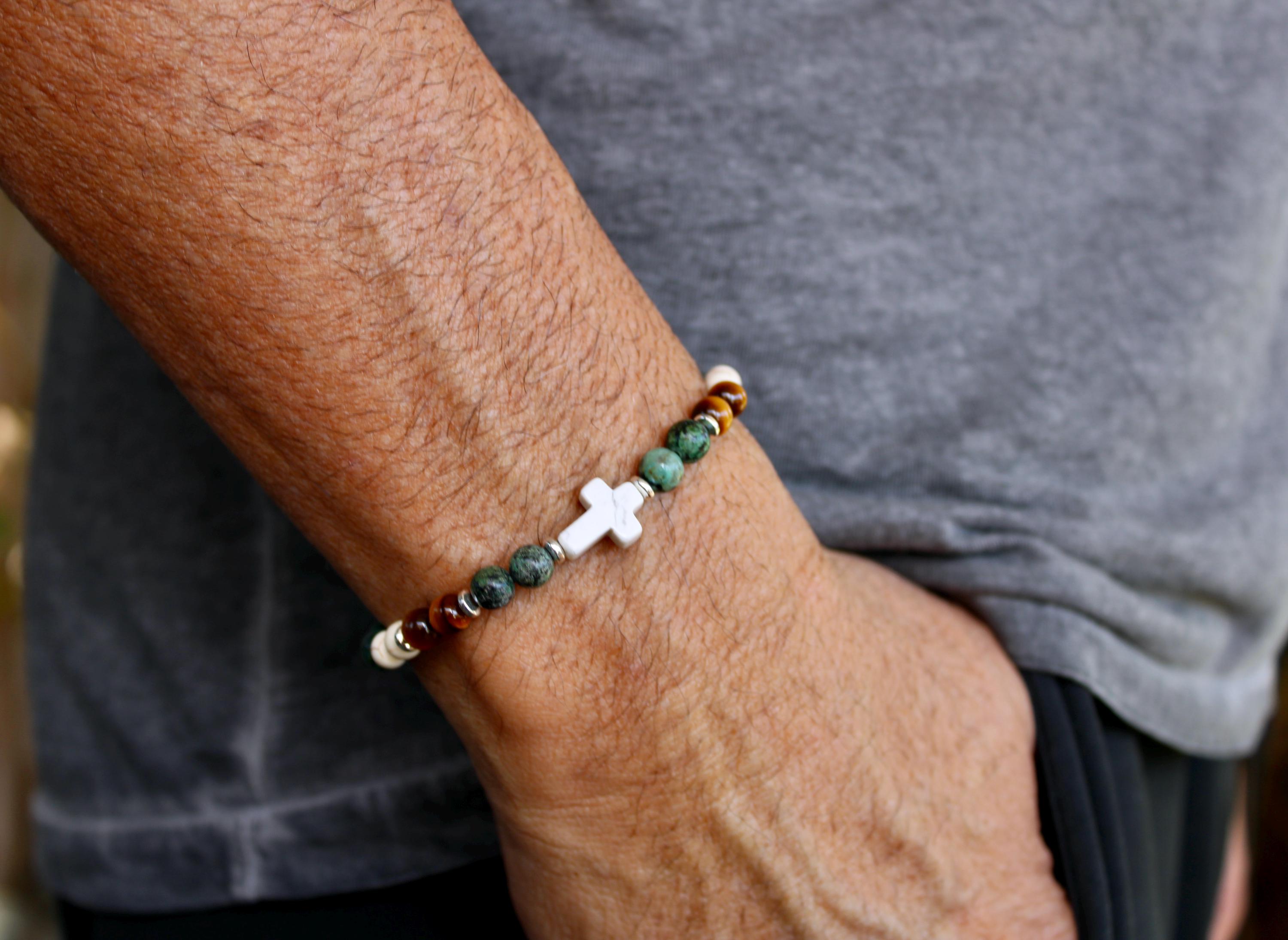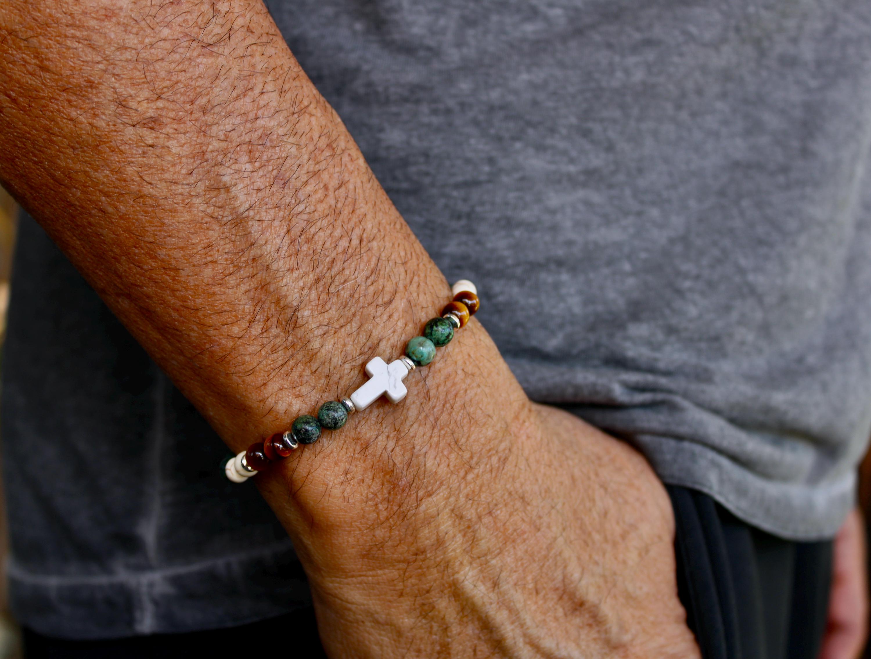 This gemstone beaded cross bracelet will make a great addition to your wrist game.