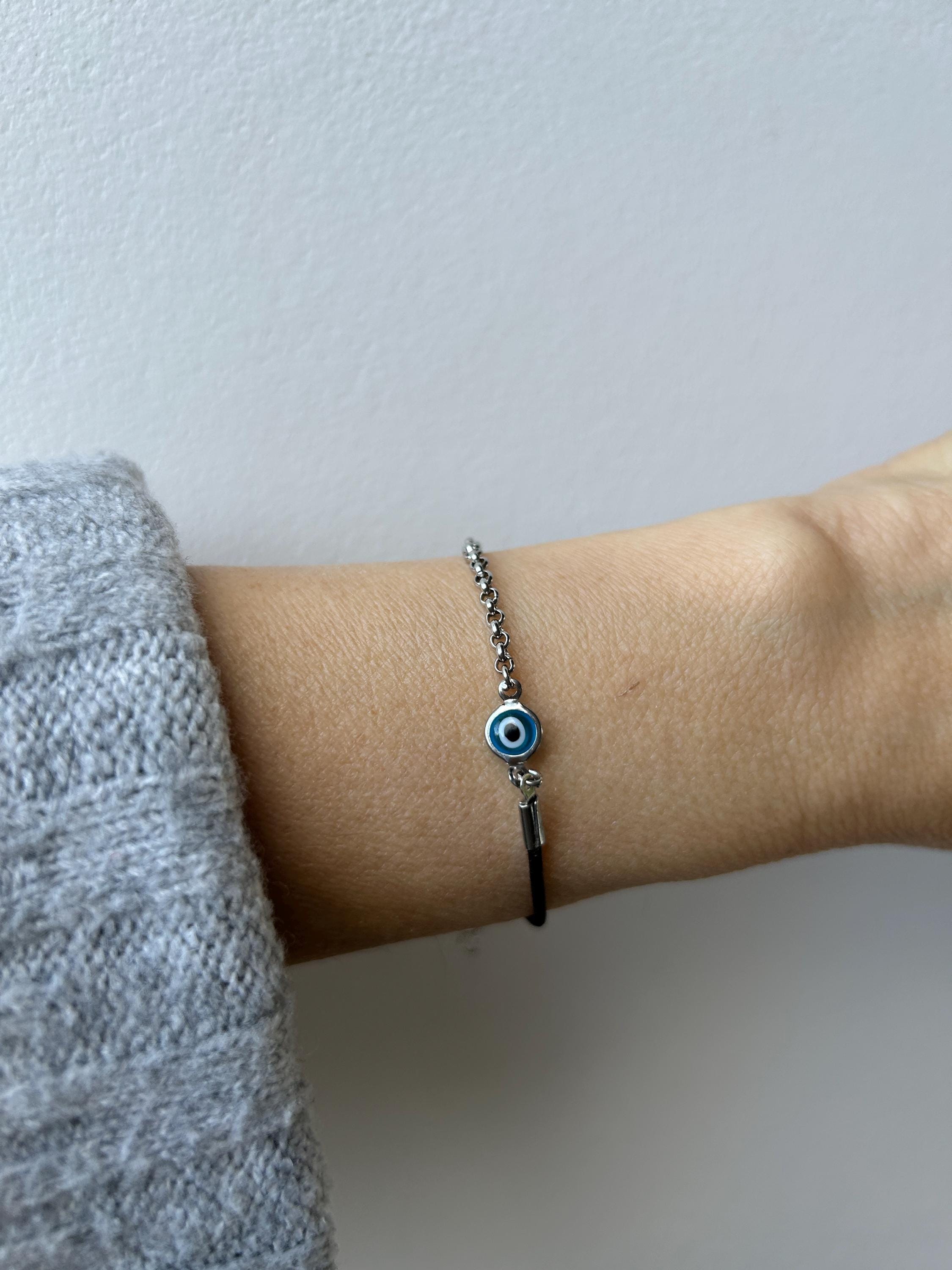 •The focal point is a stainless steel evil eye charm available in navy blue, white, turquoise, green, white , black and red. Eye is 6mm wide.