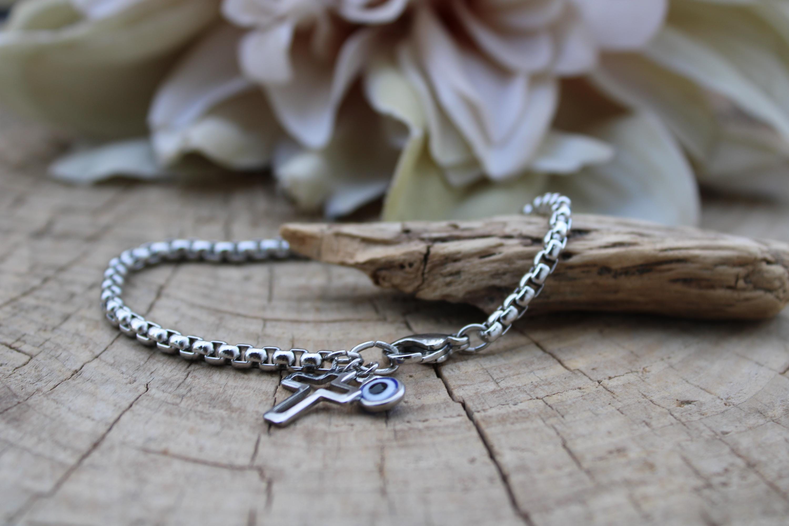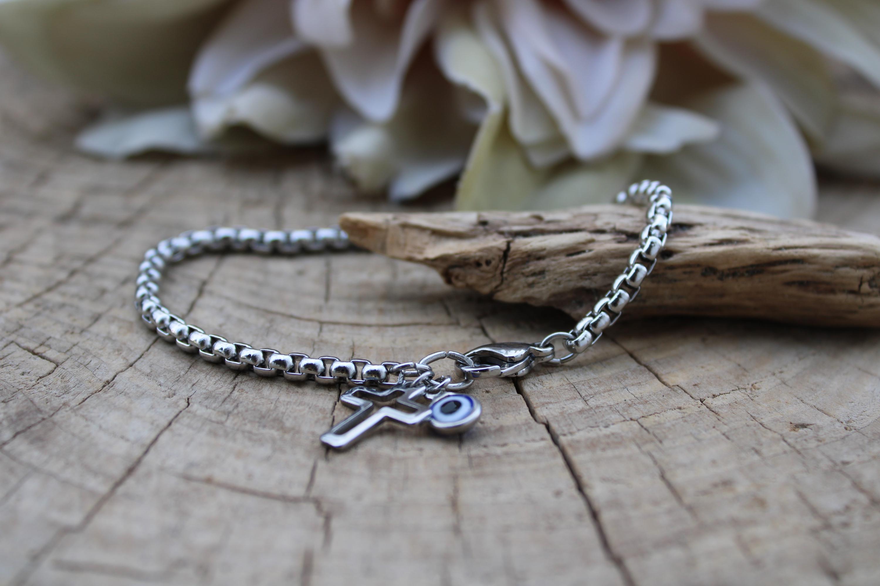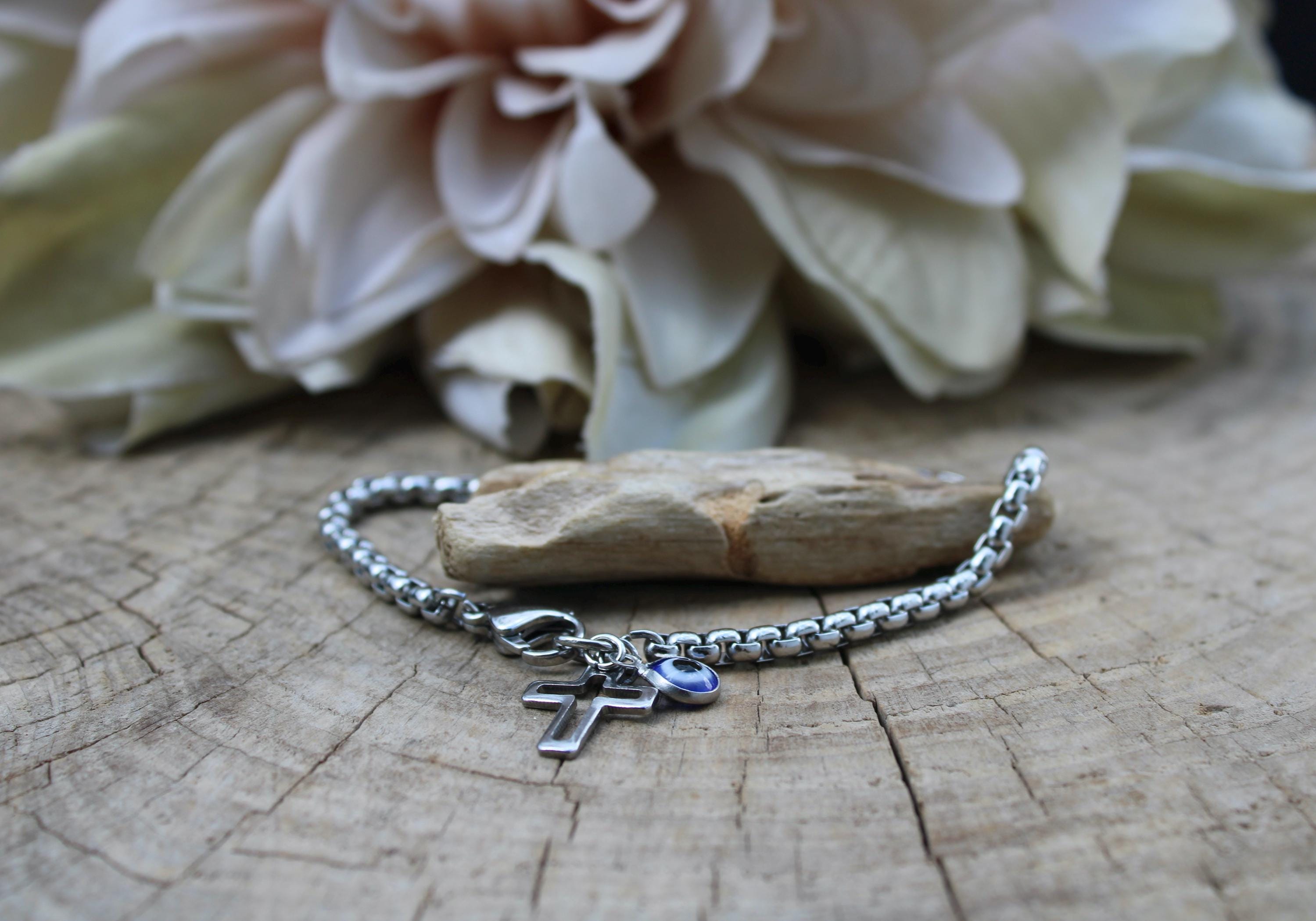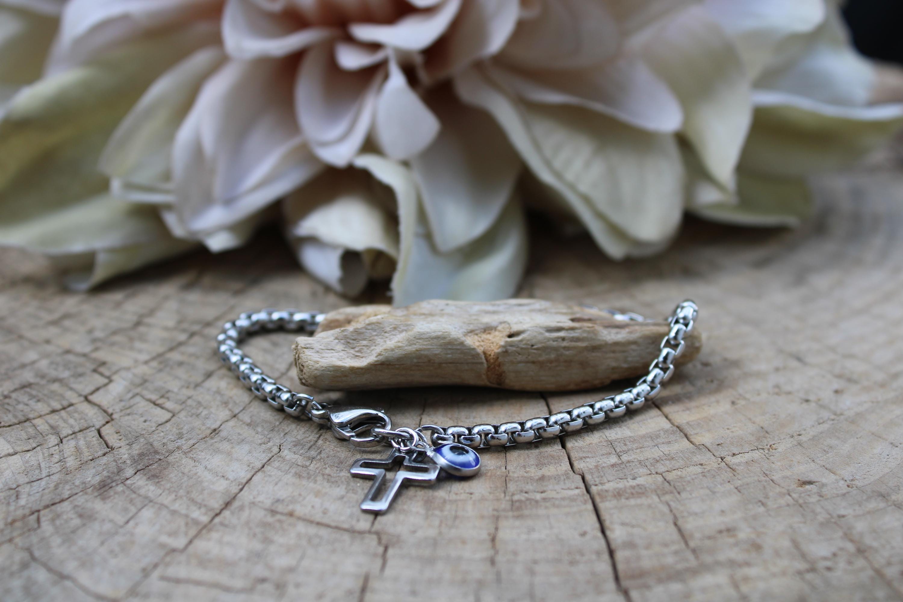 The simple cross and evil eye bracelet makes a great everyday staple.