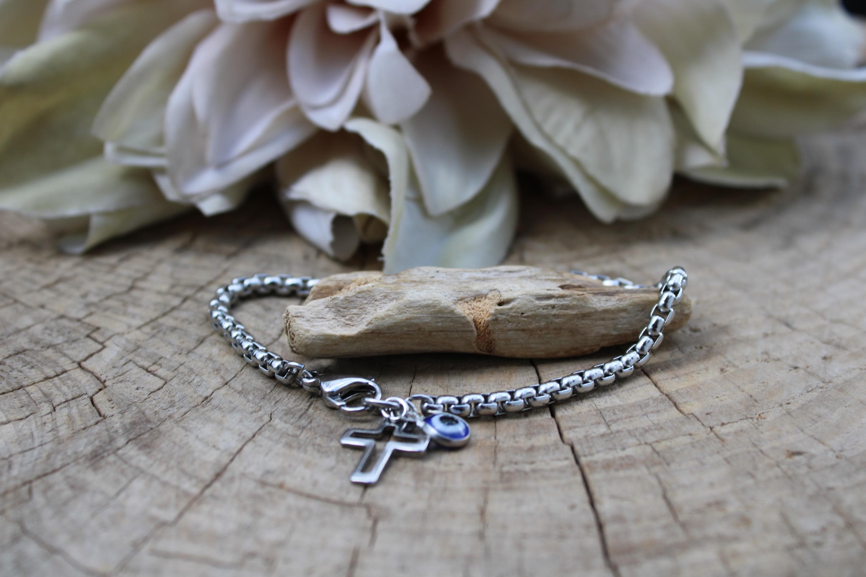 •It features a small stainless steel cross measuring 14 x 10mm and a 6mm stainless steel eye charm.