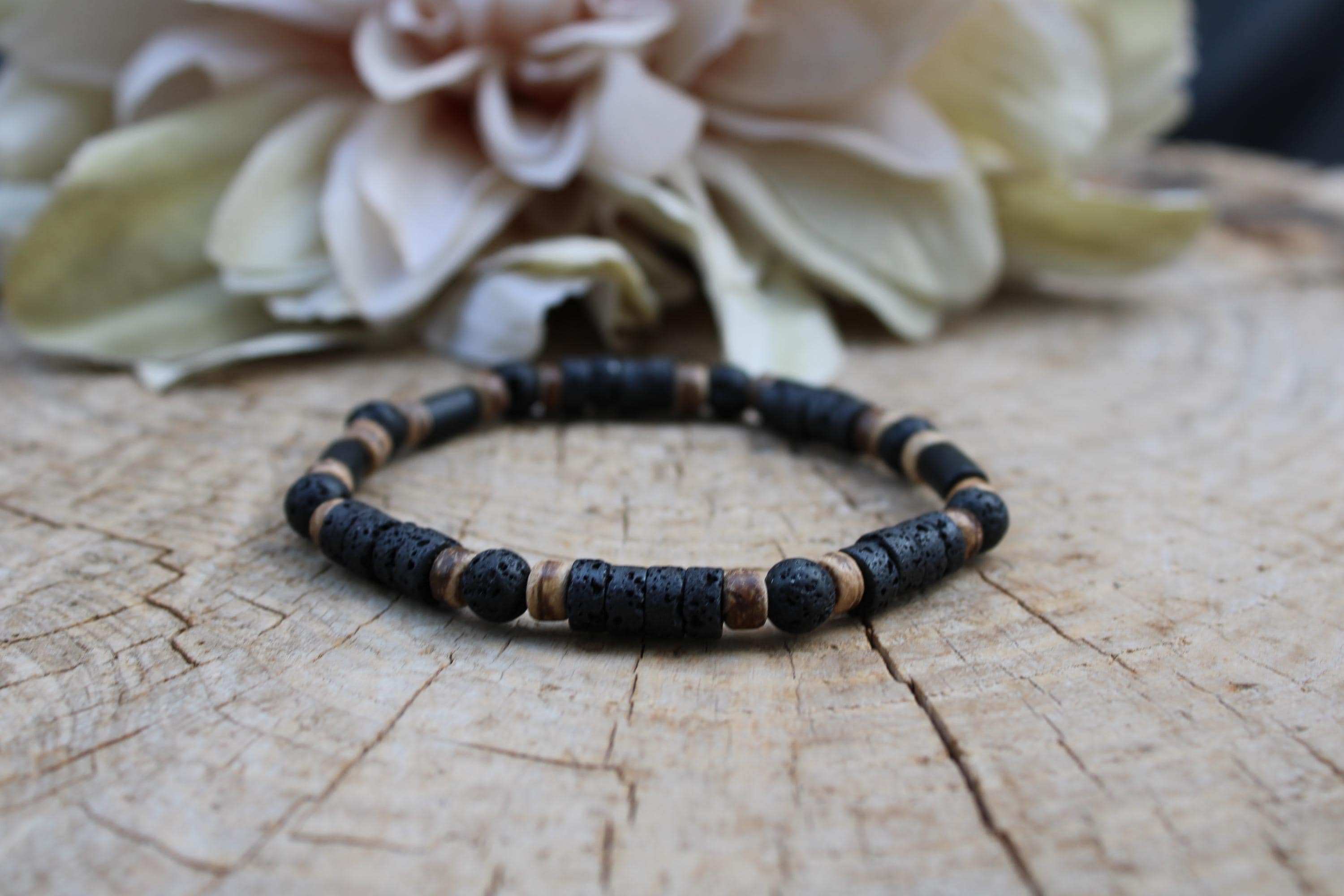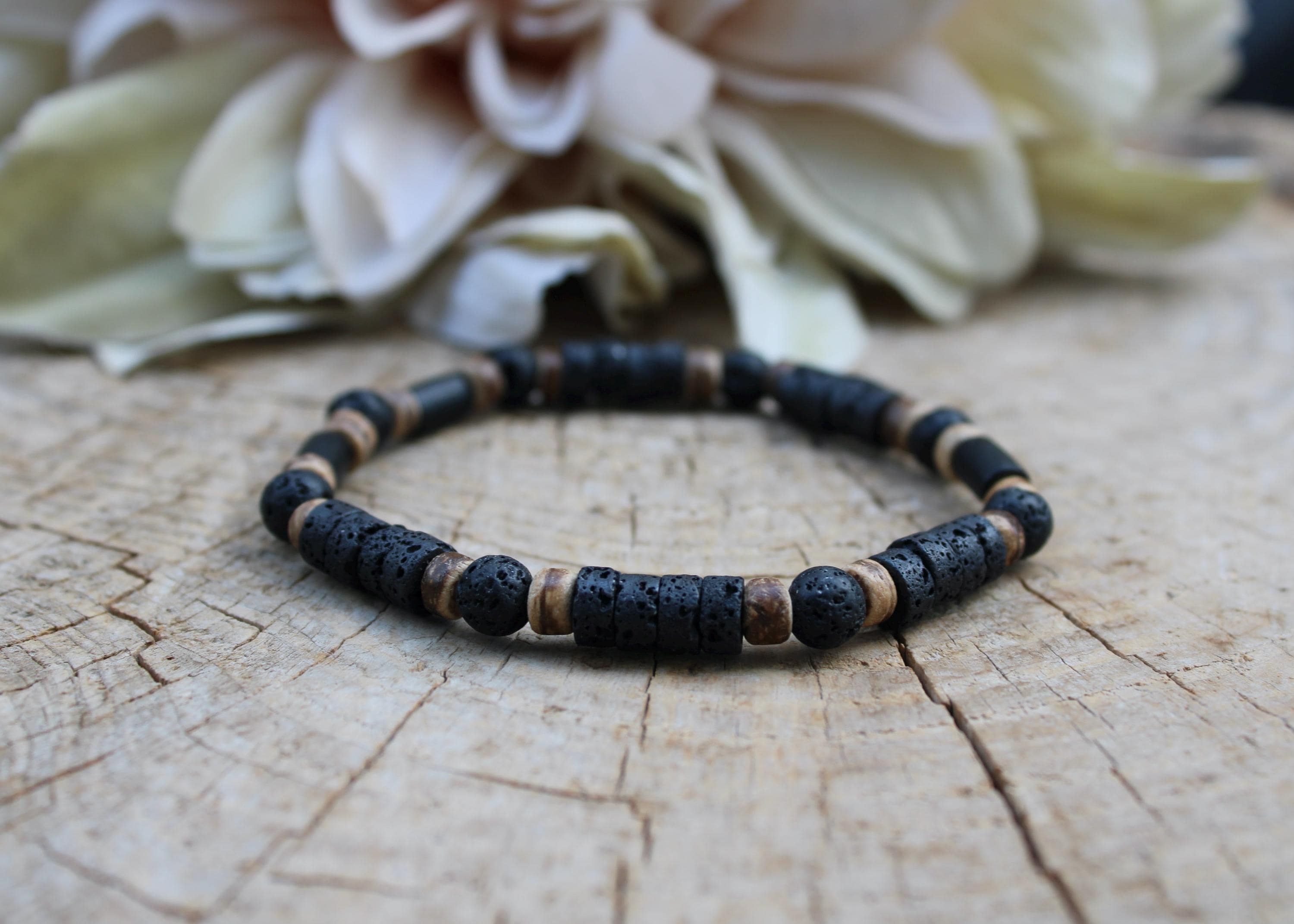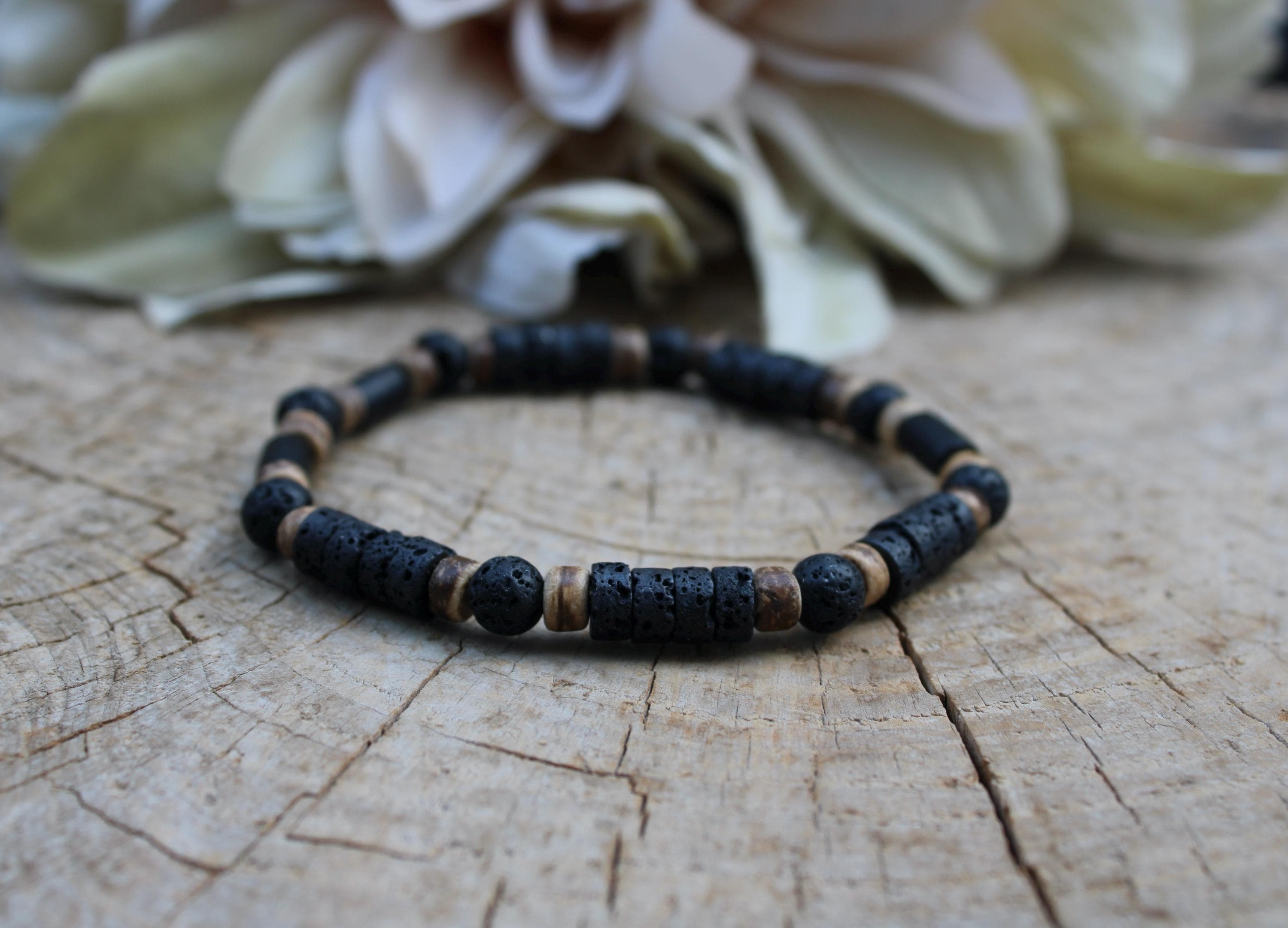 This bracelet features lava rock which is associated with grounding and courage. As it contains coconut beads it is not waterproof so please keep this in mind before placing an order.