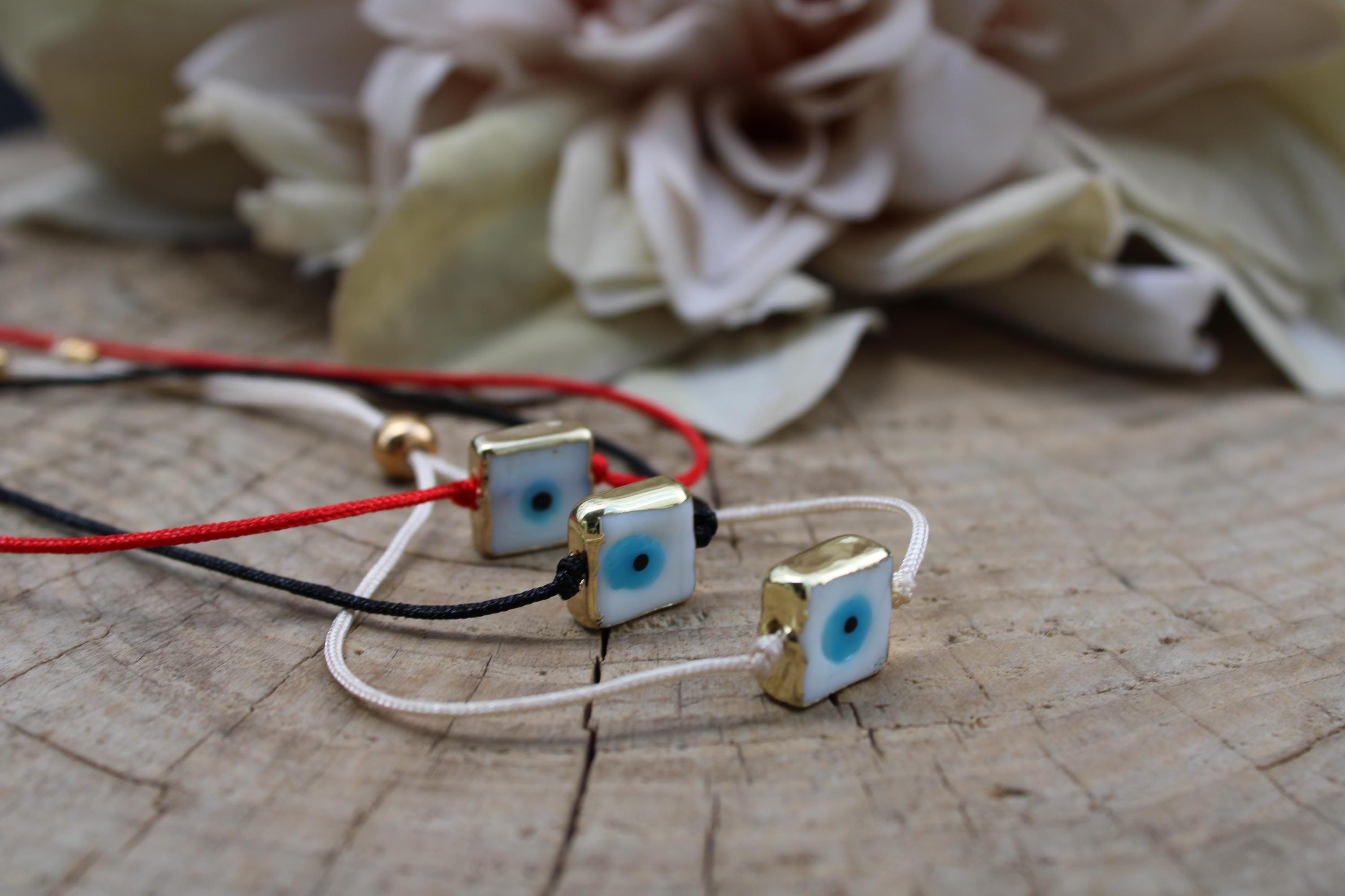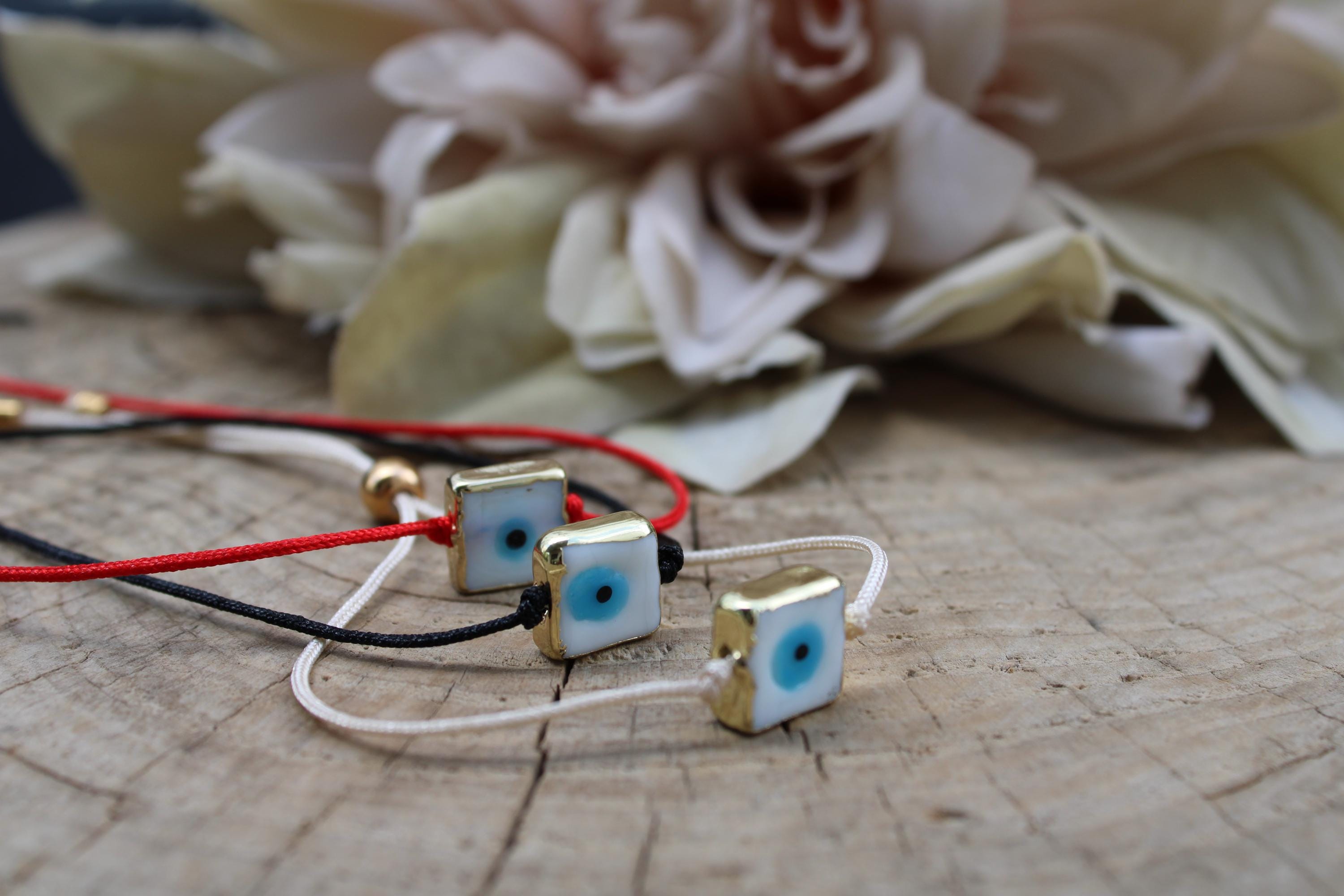 •It features a square enamel and brass evil eye charm measuring 10mm.