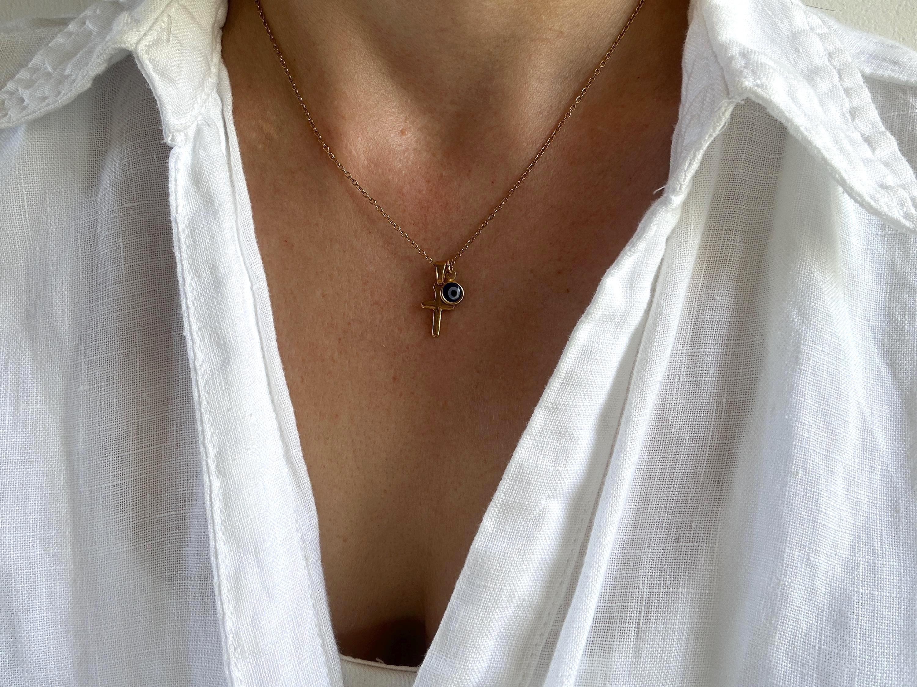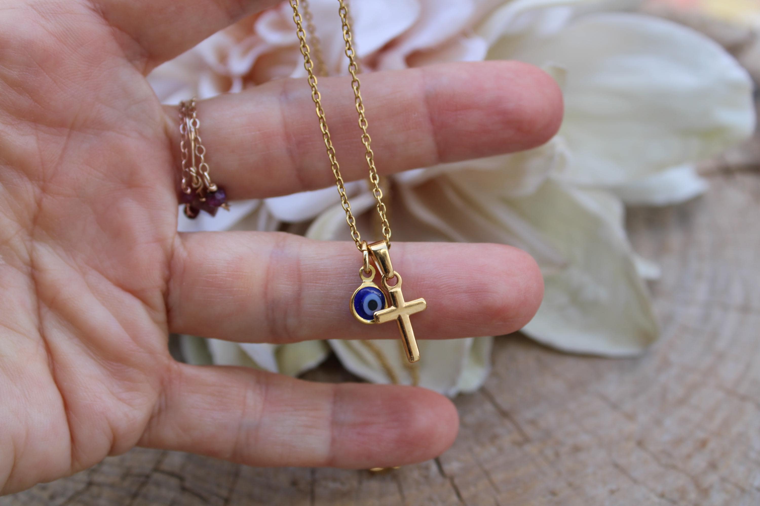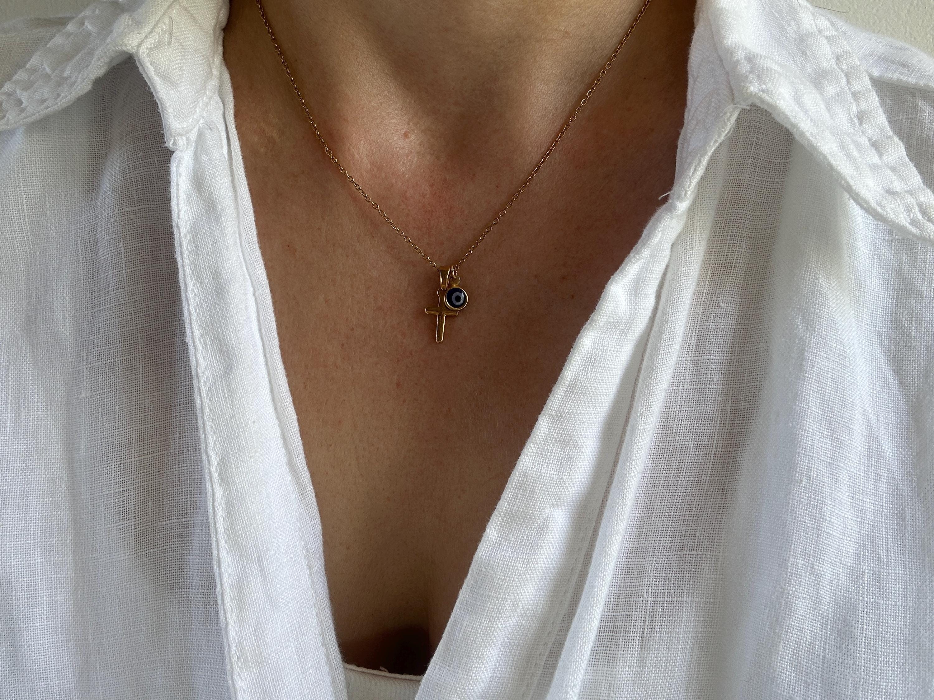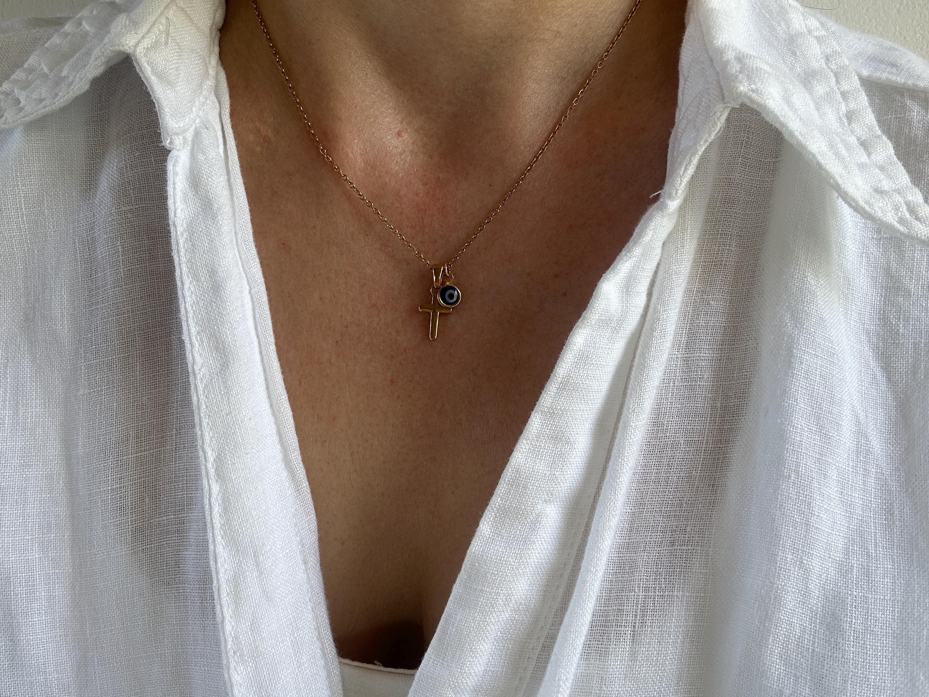 This necklace combines a stainless steel cross and a small evil eye charm.