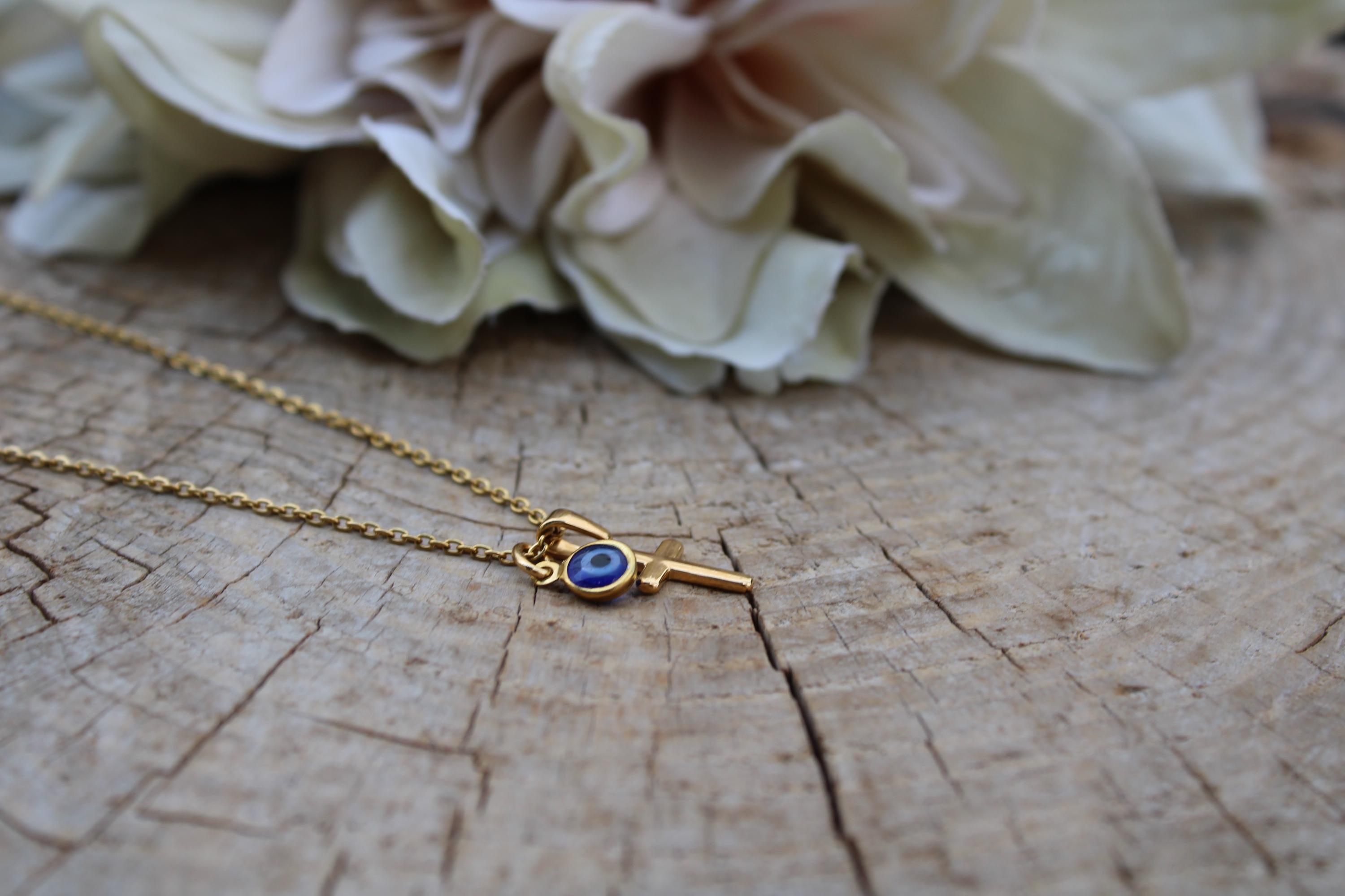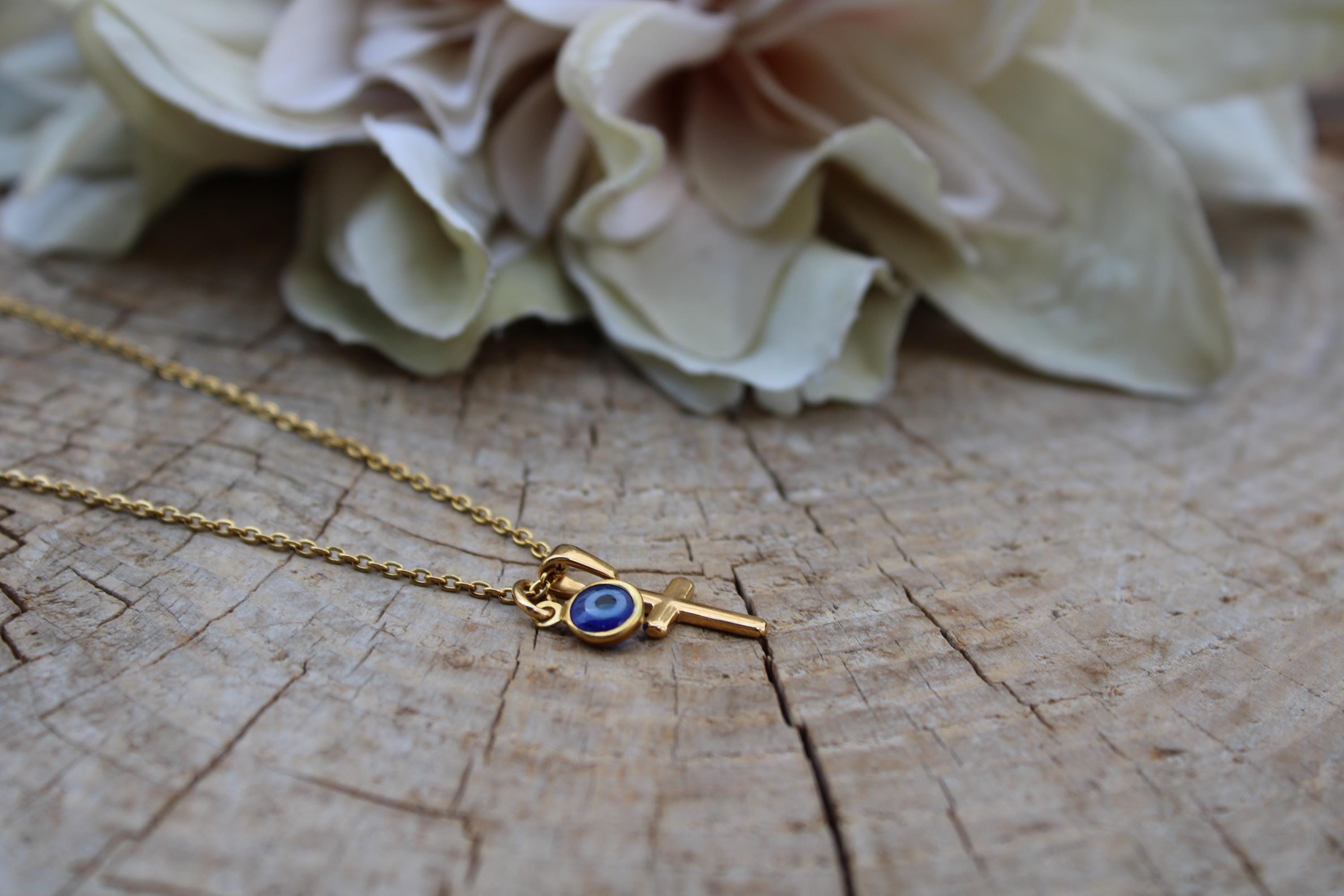 •It features a tarnish resistant stainless steel cross measuring 16x 9mm and a 6mm gold stainless evil eye in traditional blue.