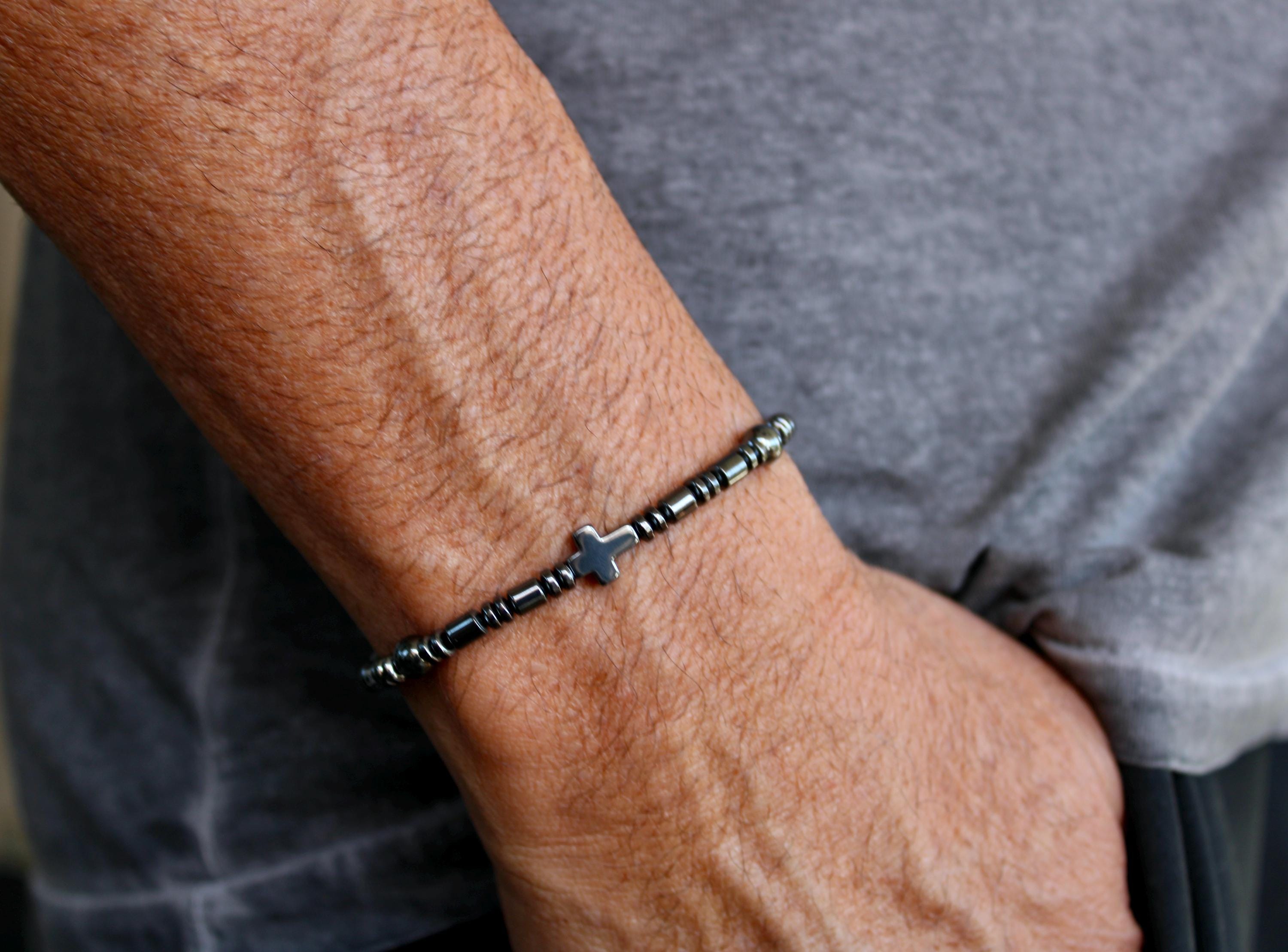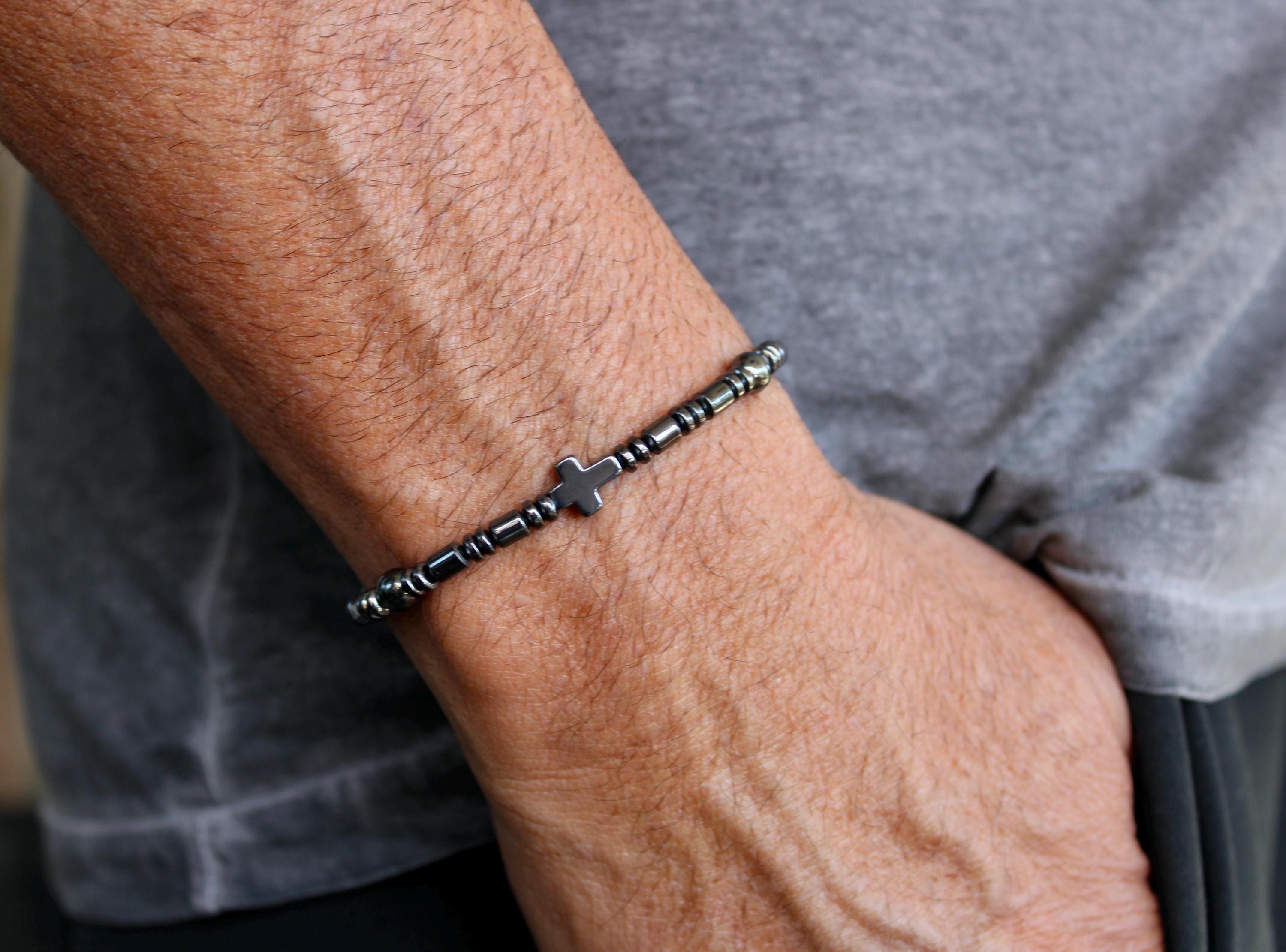 This simple beaded cross bracelet will make a great addition to your wrist game. Hematite has a wonderful gunmetal colour and is associated with protection and grounding.