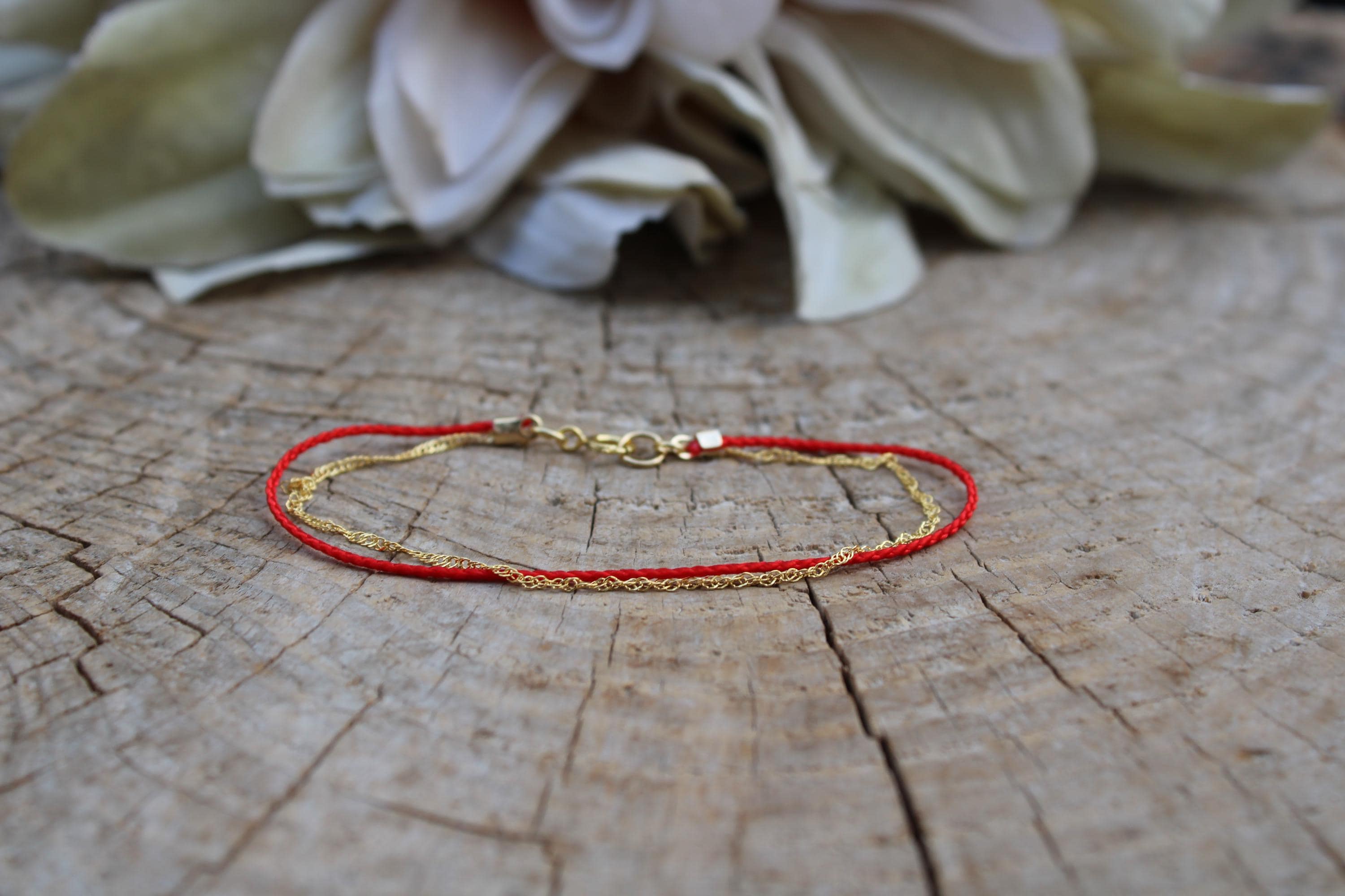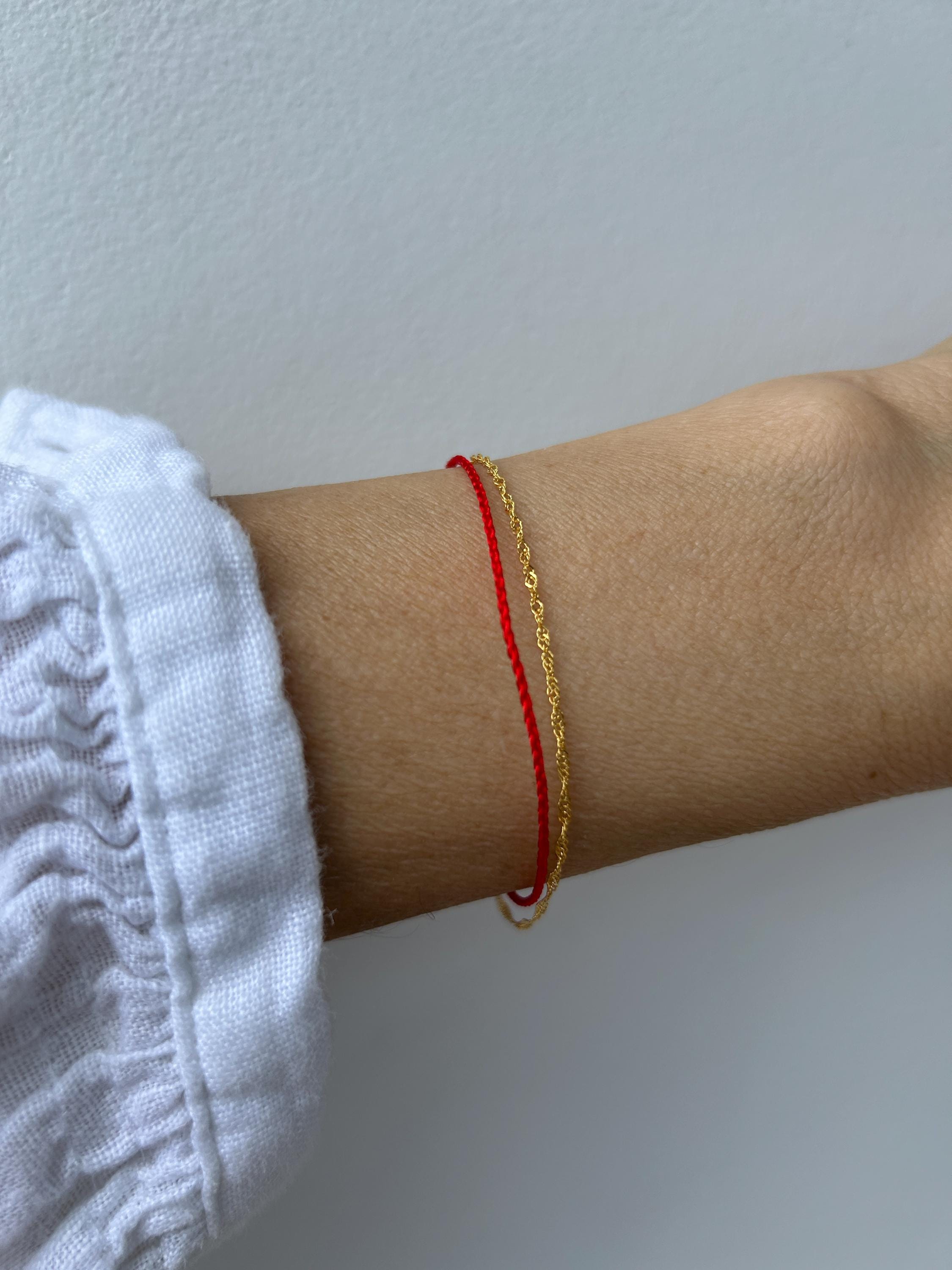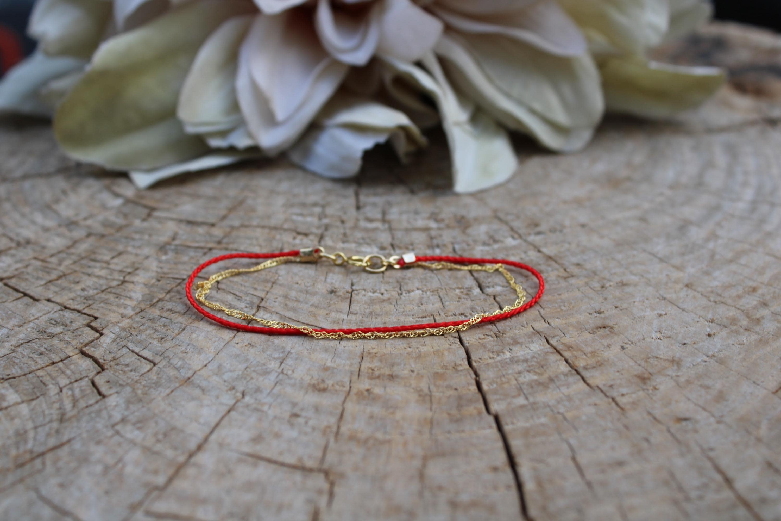 Keep yourself protected with this delicate red string bracelet that also combines a beautiful chain.