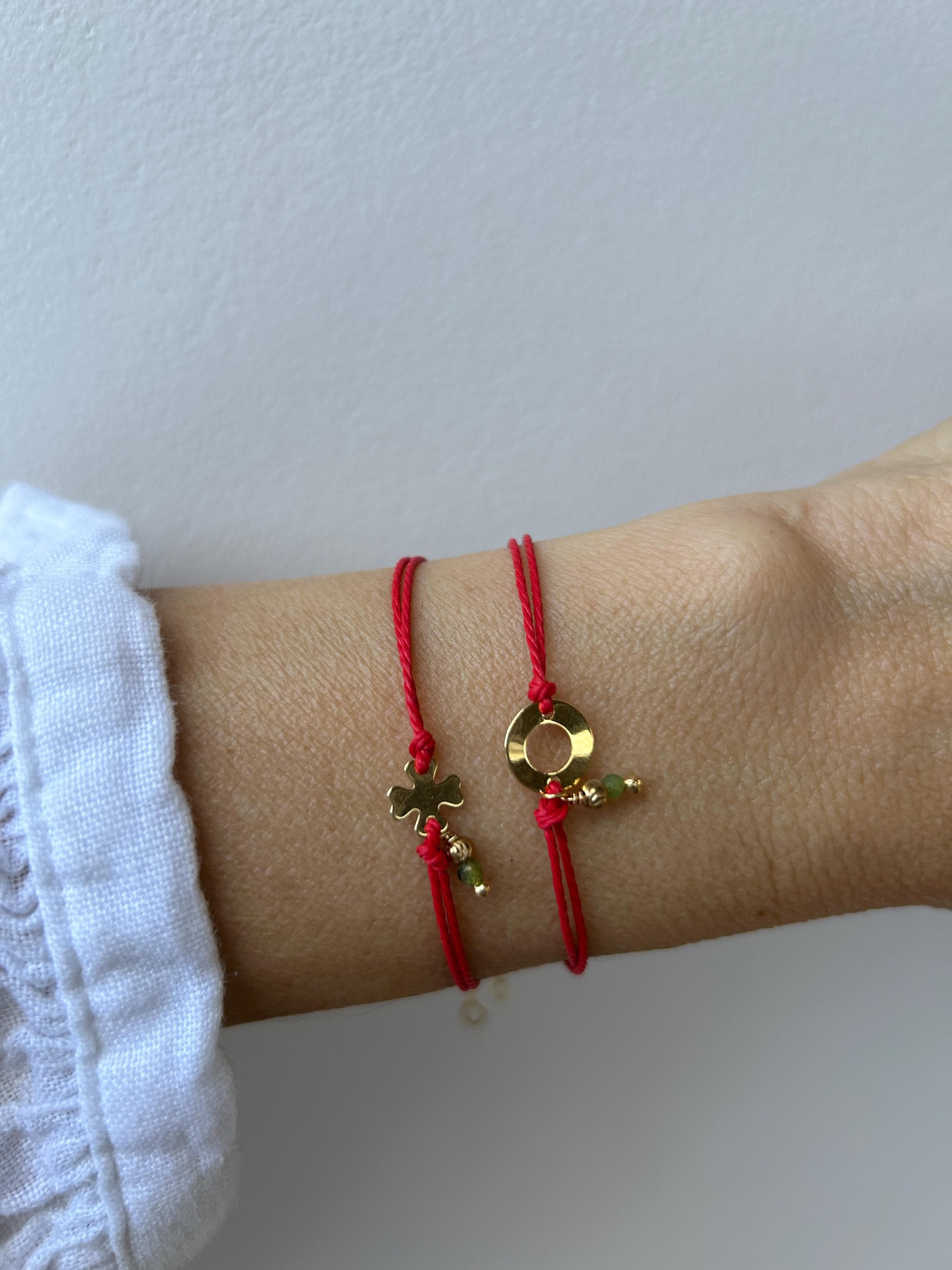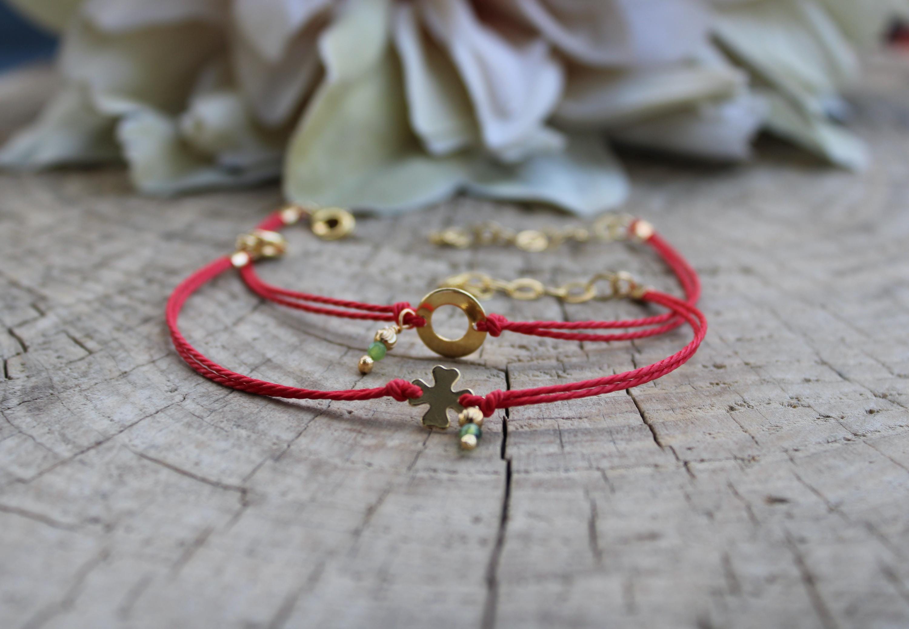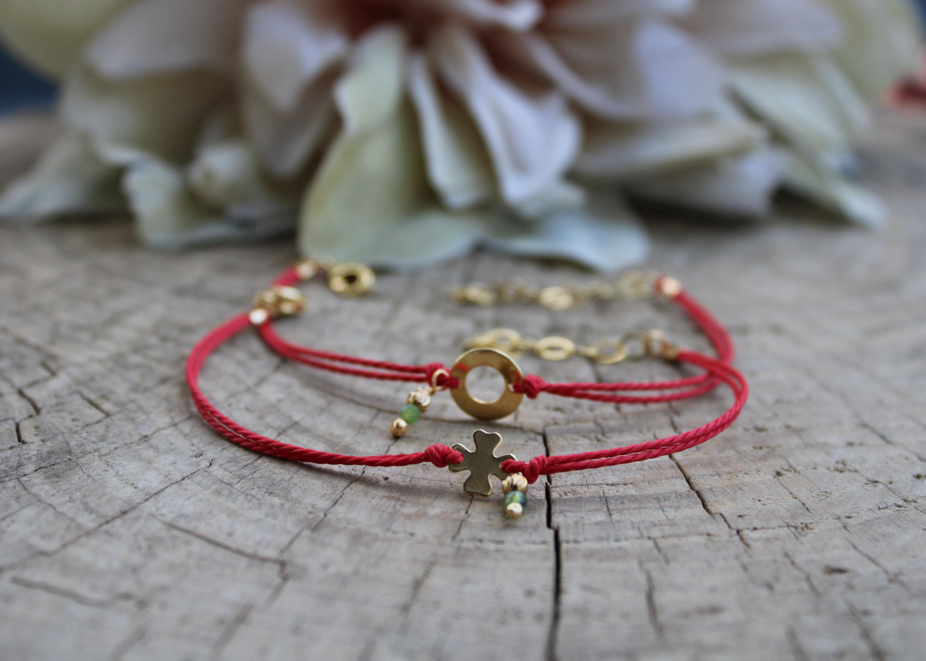 •Made with a waxed nylon cord and a gold filled charm. Choose between a circle charm or a four leaf clover.