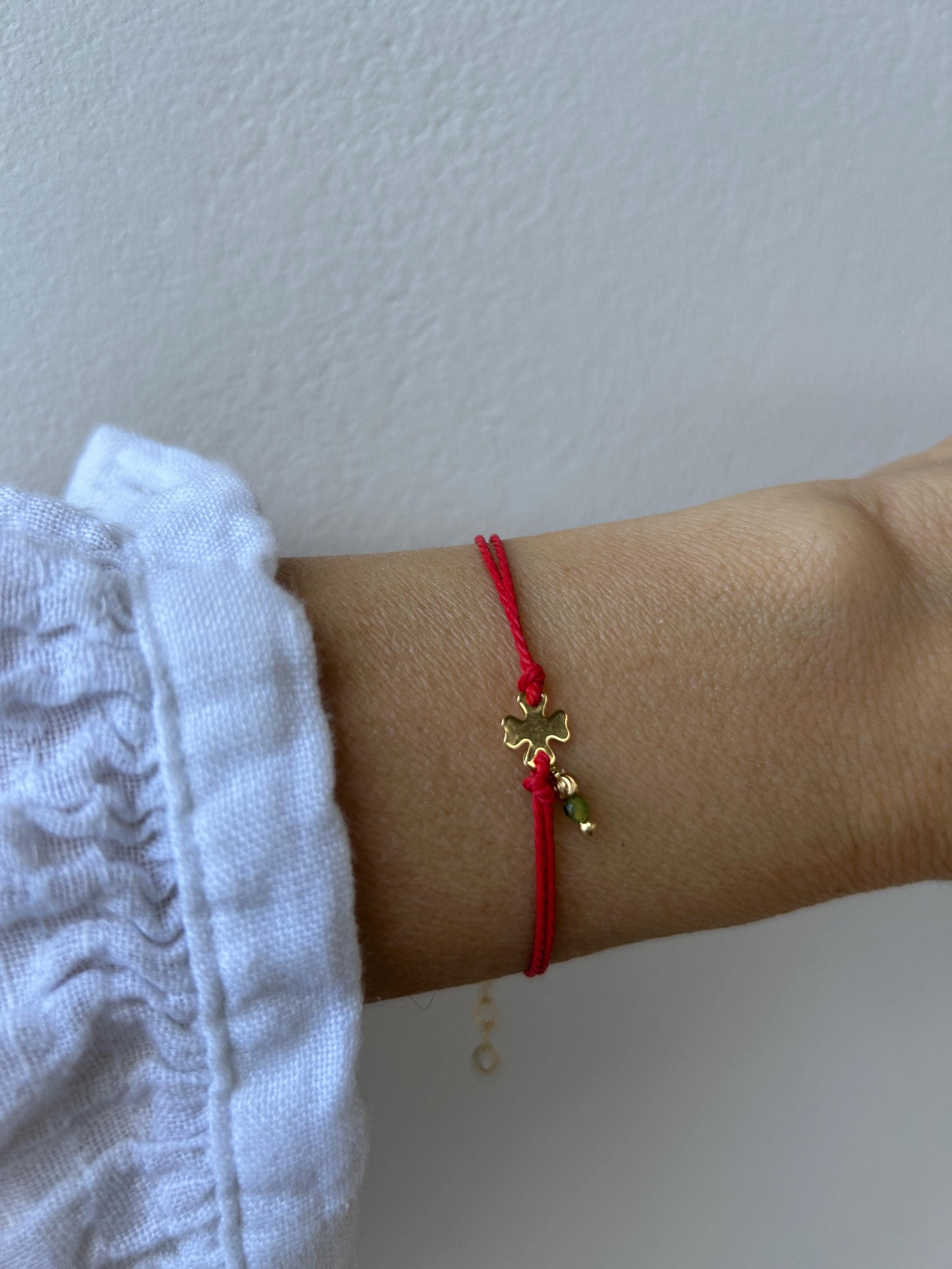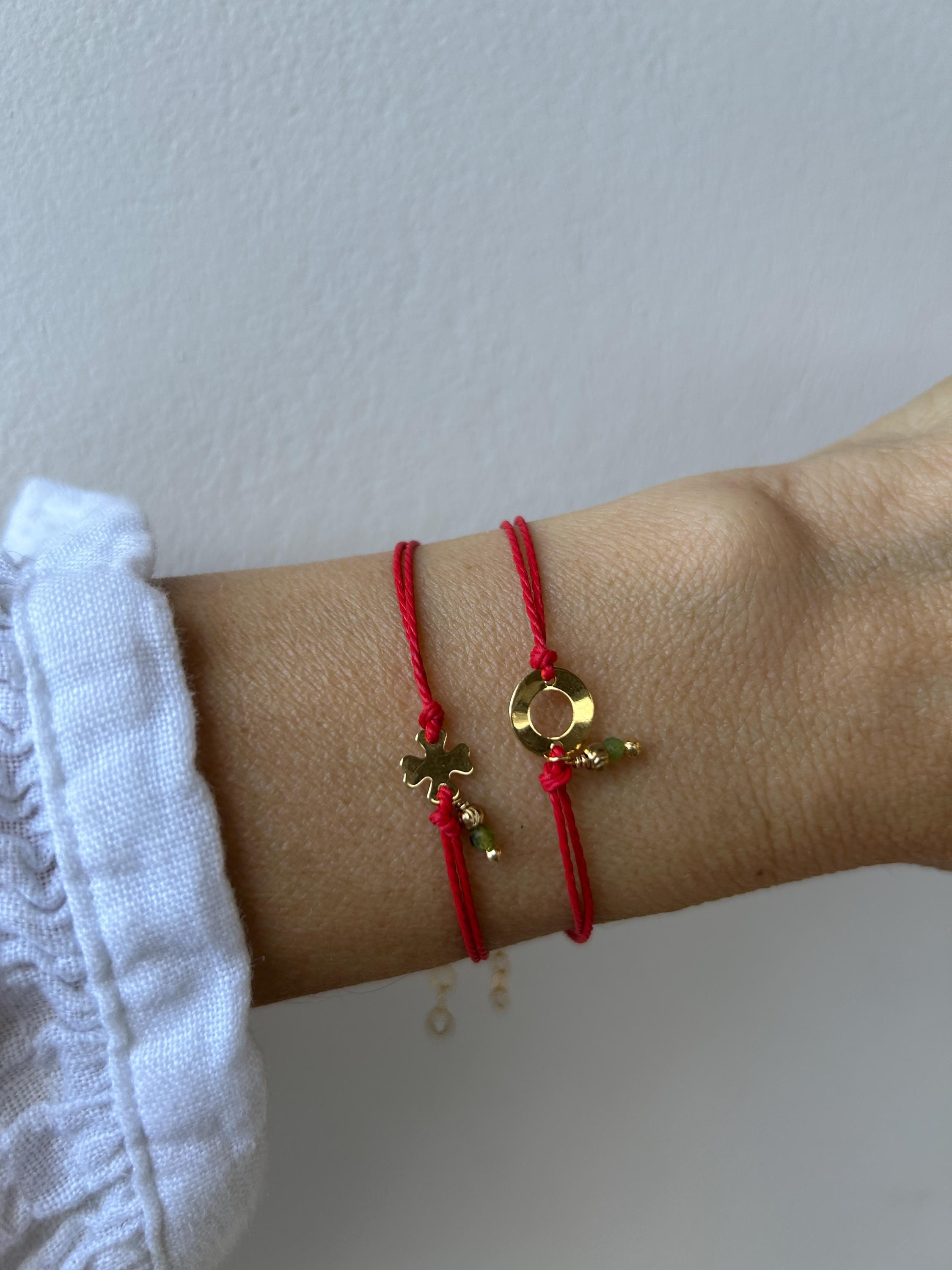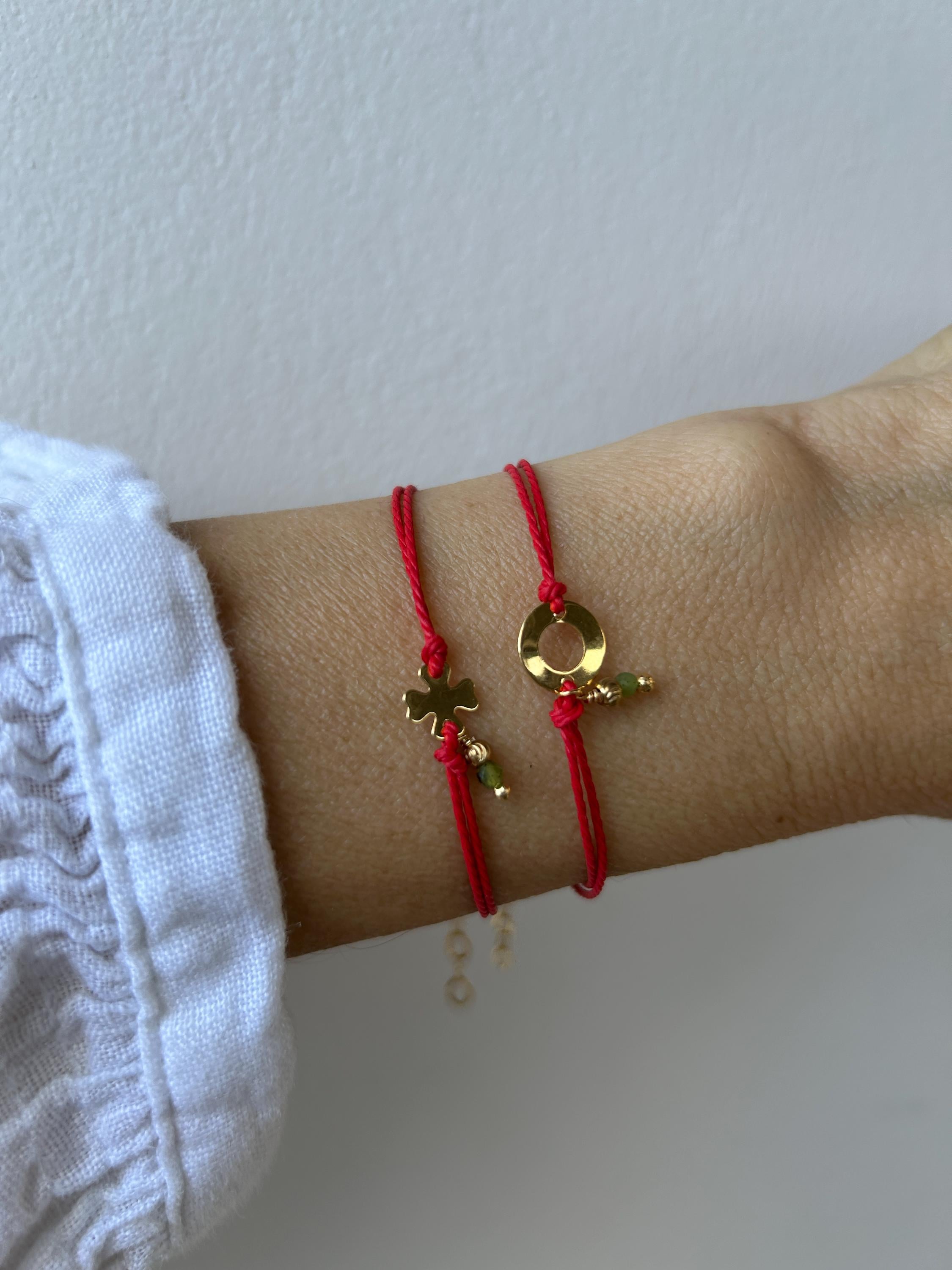 Keep yourself protected with this simple red string bracelet that also features a gold filled charm and a green jade gemstone.