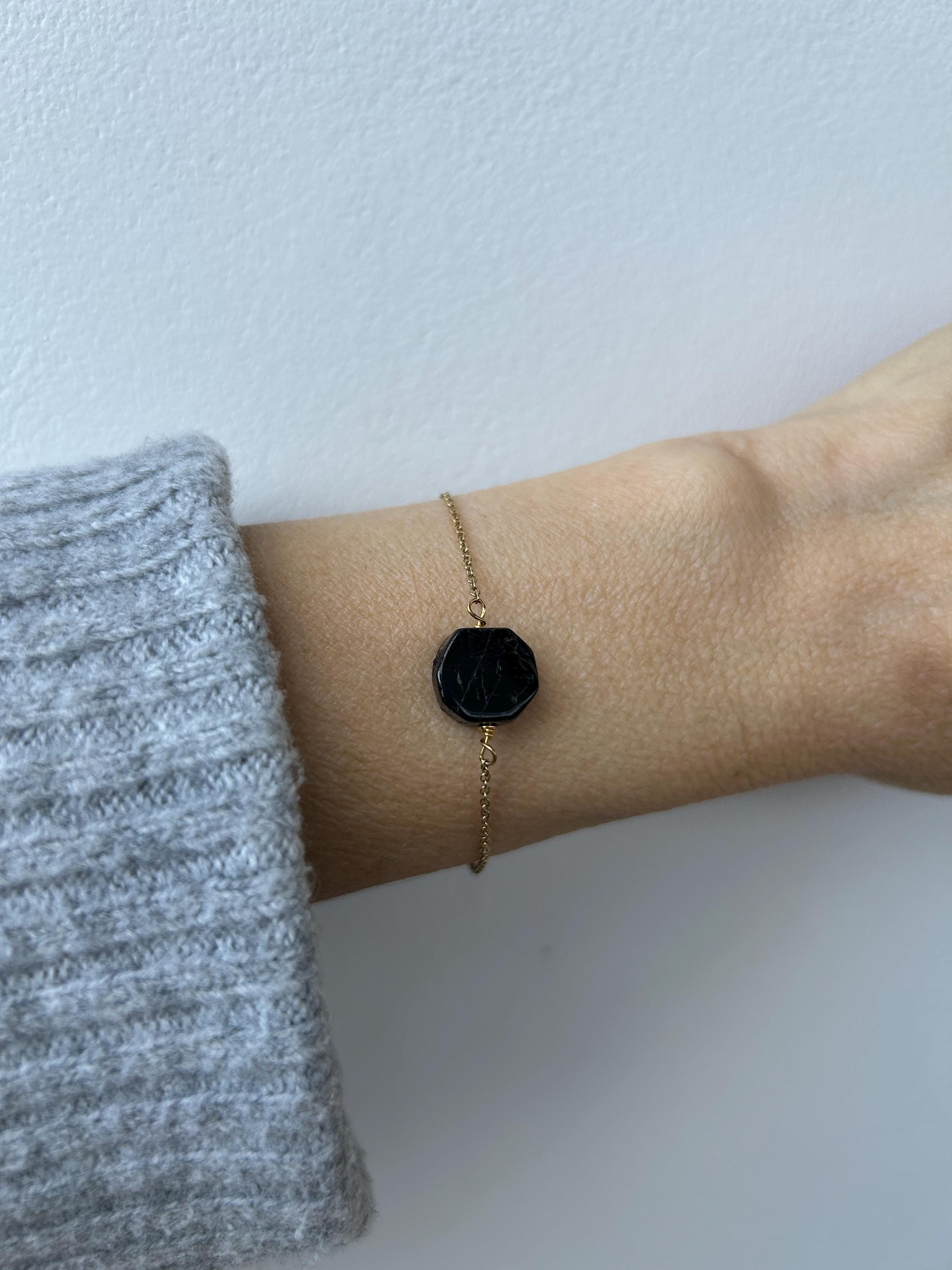 Raw black tourmaline is combined with a dainty stainless steel chain to create this protection bracelet.