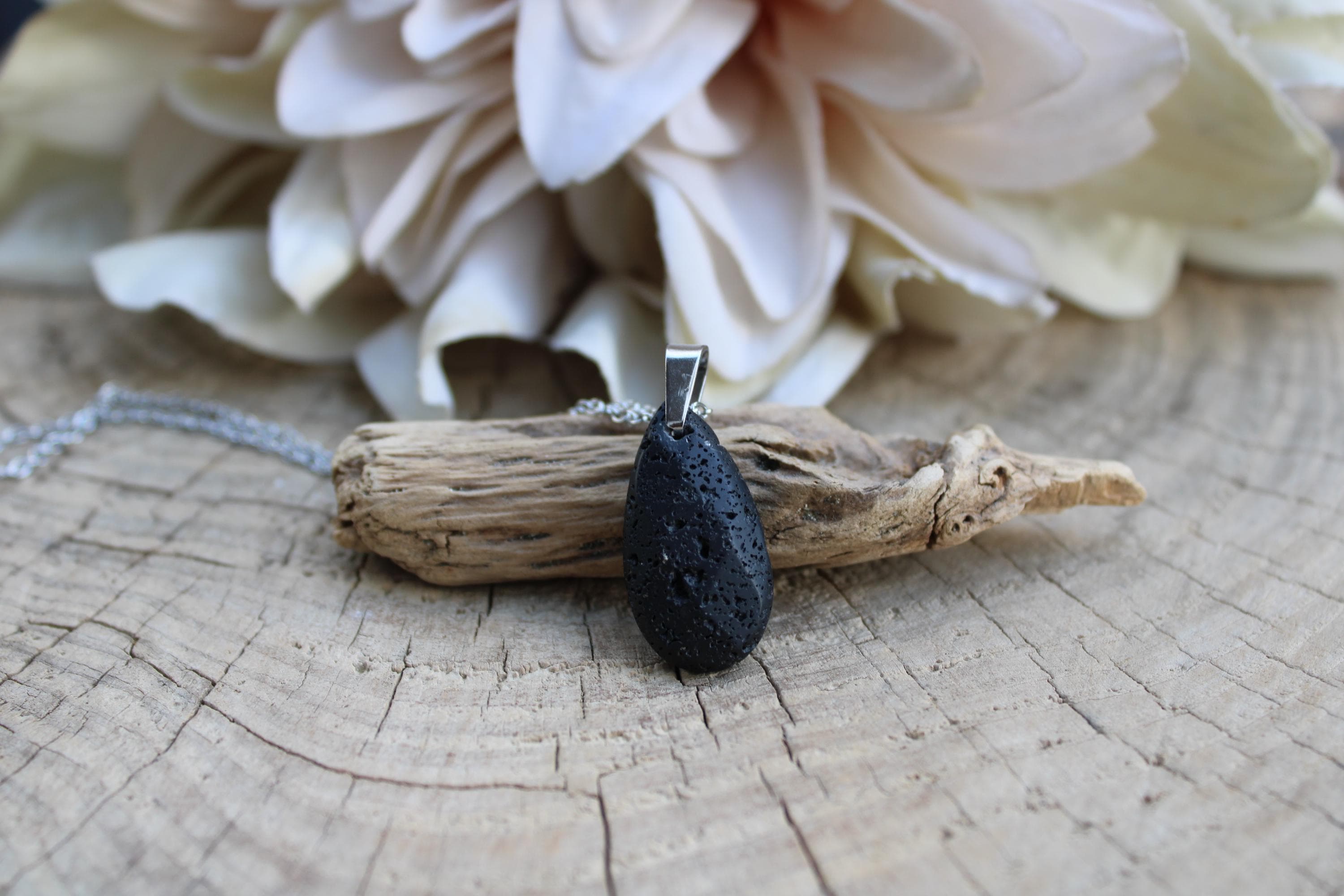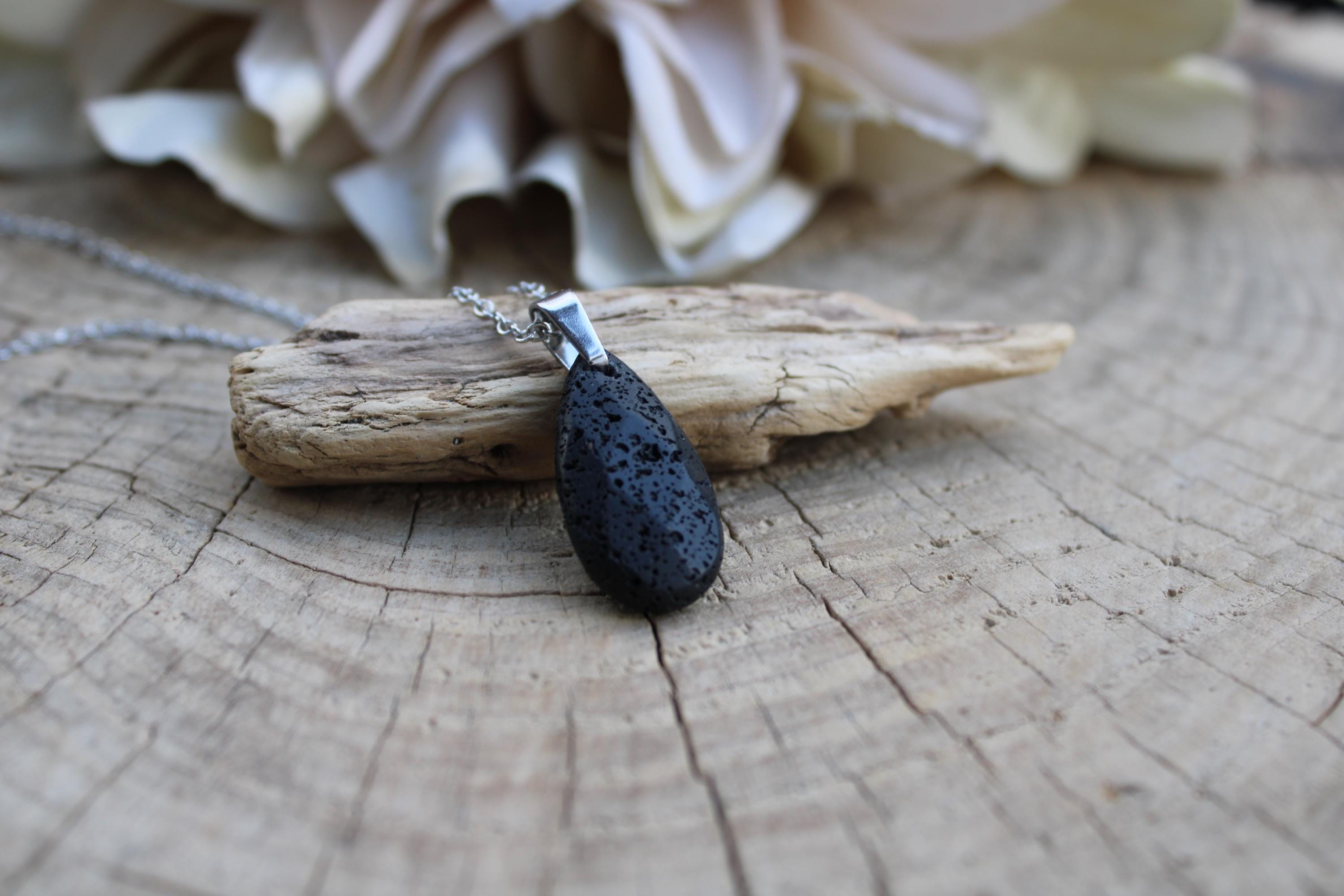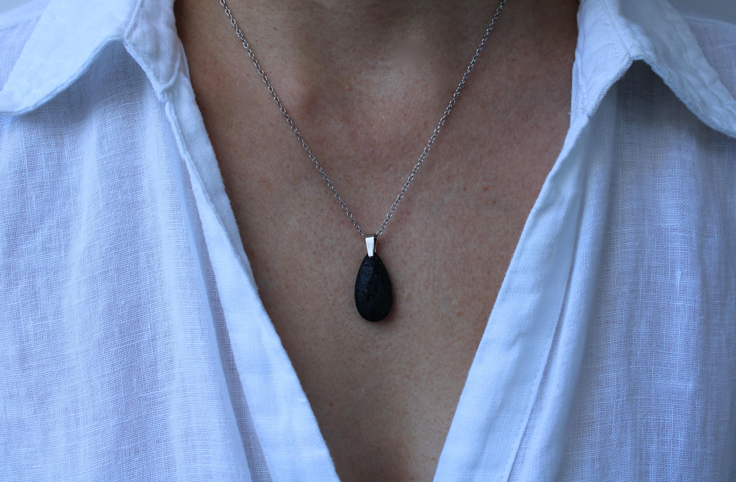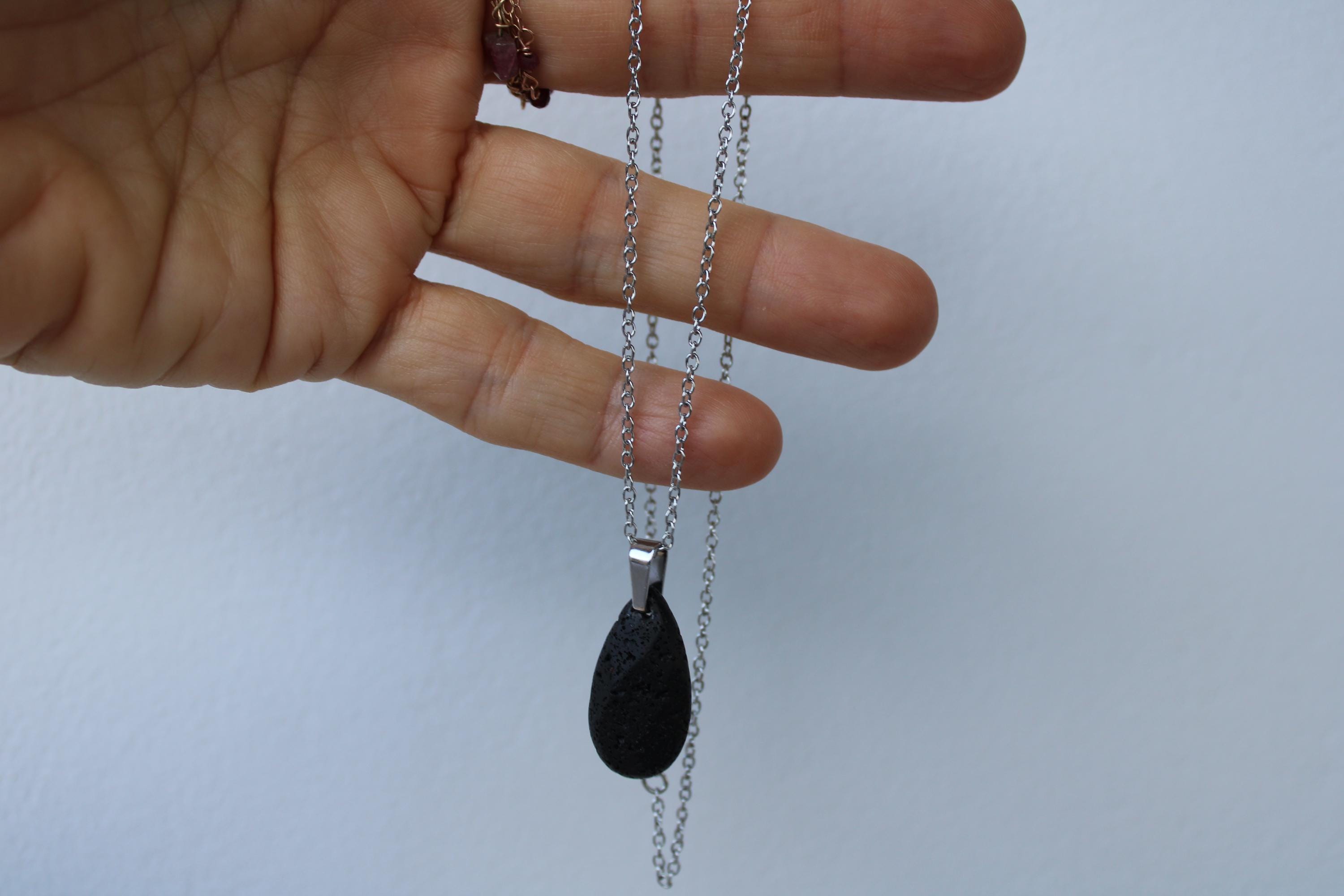 •It features a natural lava teardrop pendant measuring around 45mm long with the stainless steel bail.
