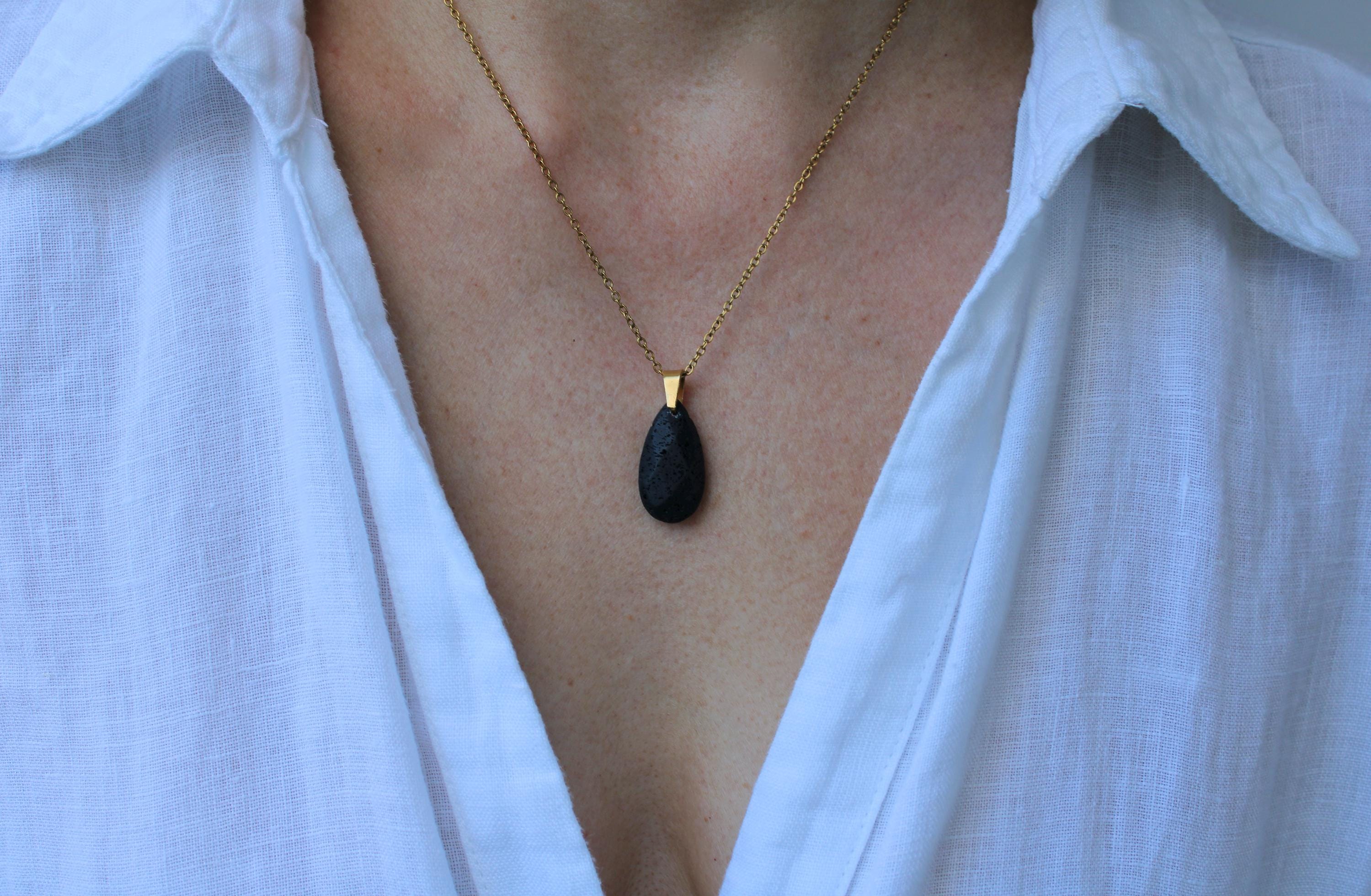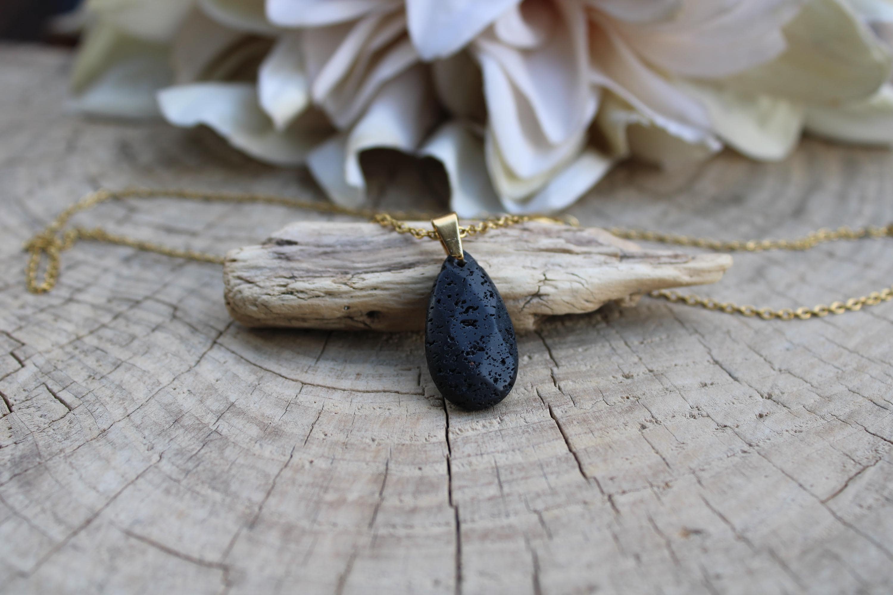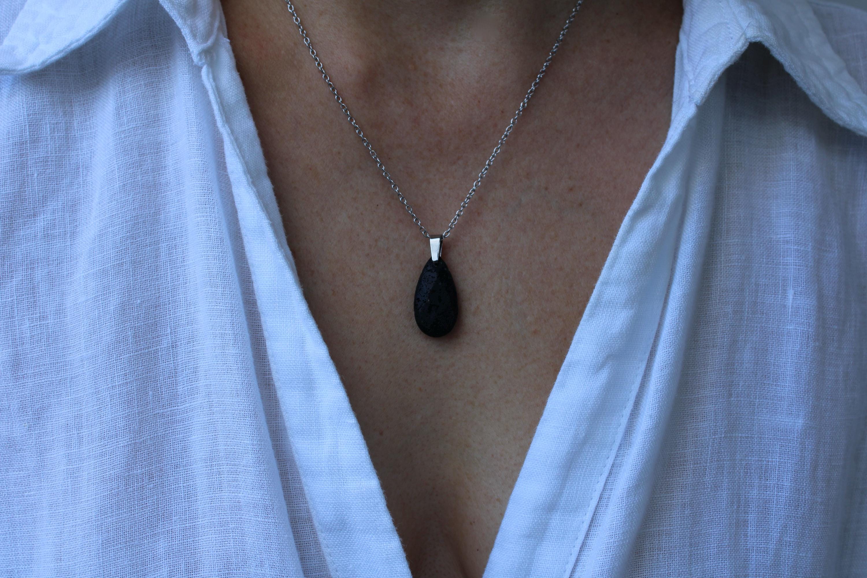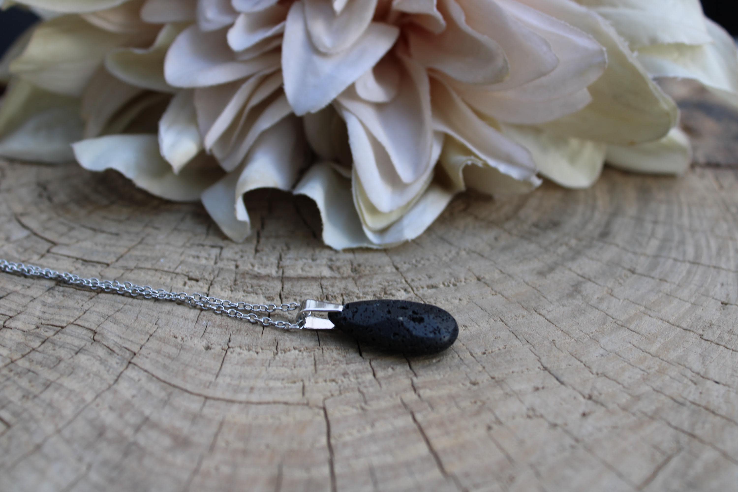 •It features a natural lava teardrop pendant measuring around 45mm long with the stainless steel bail.