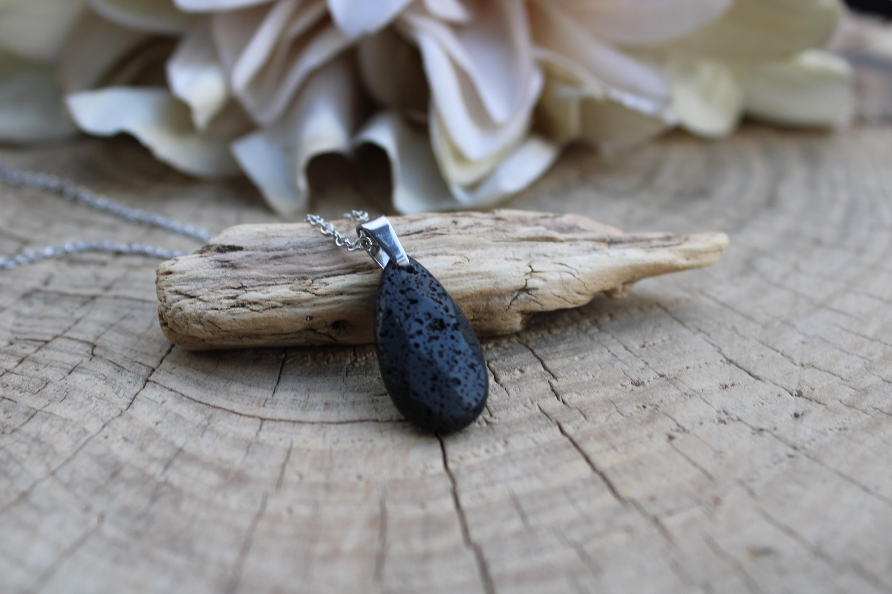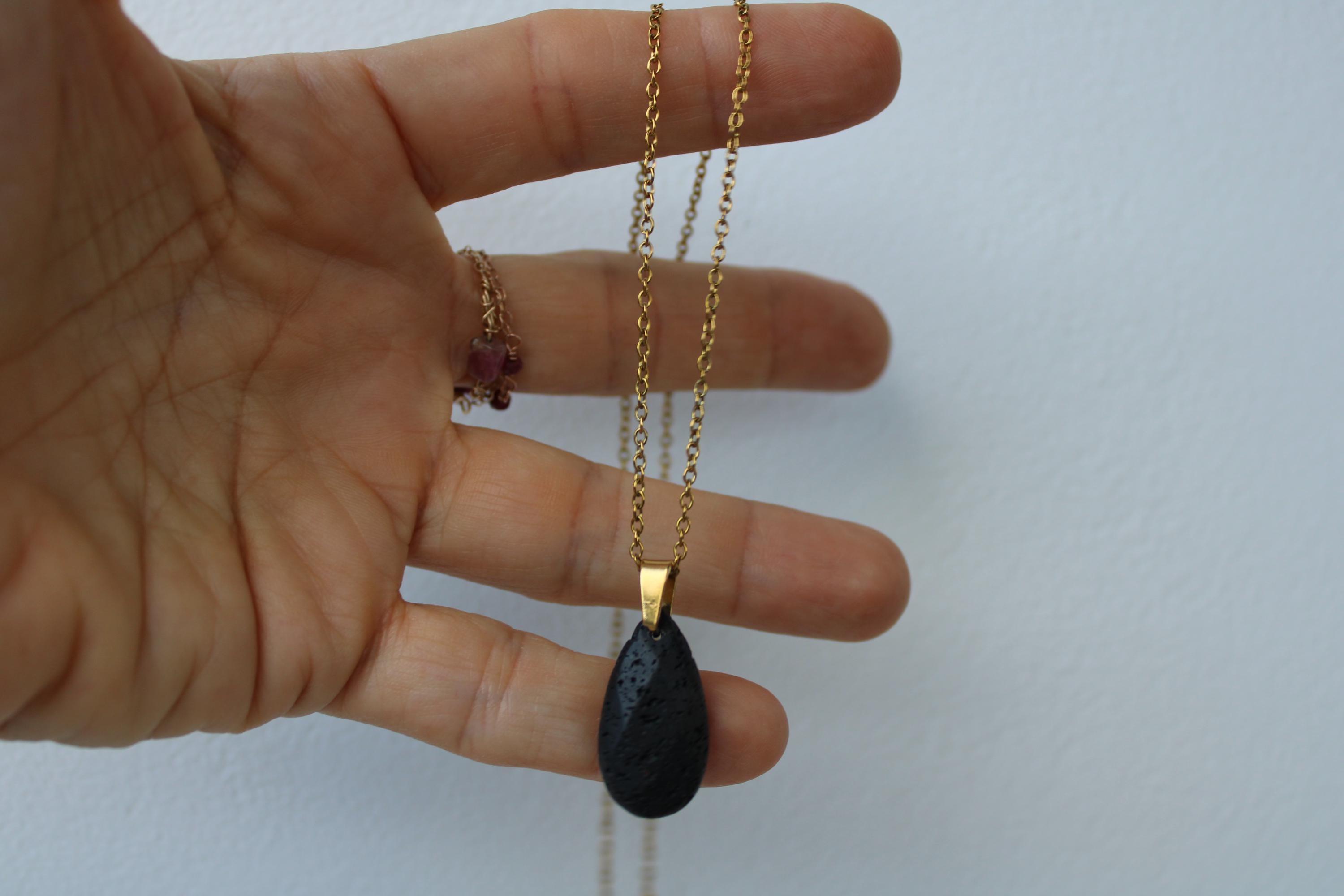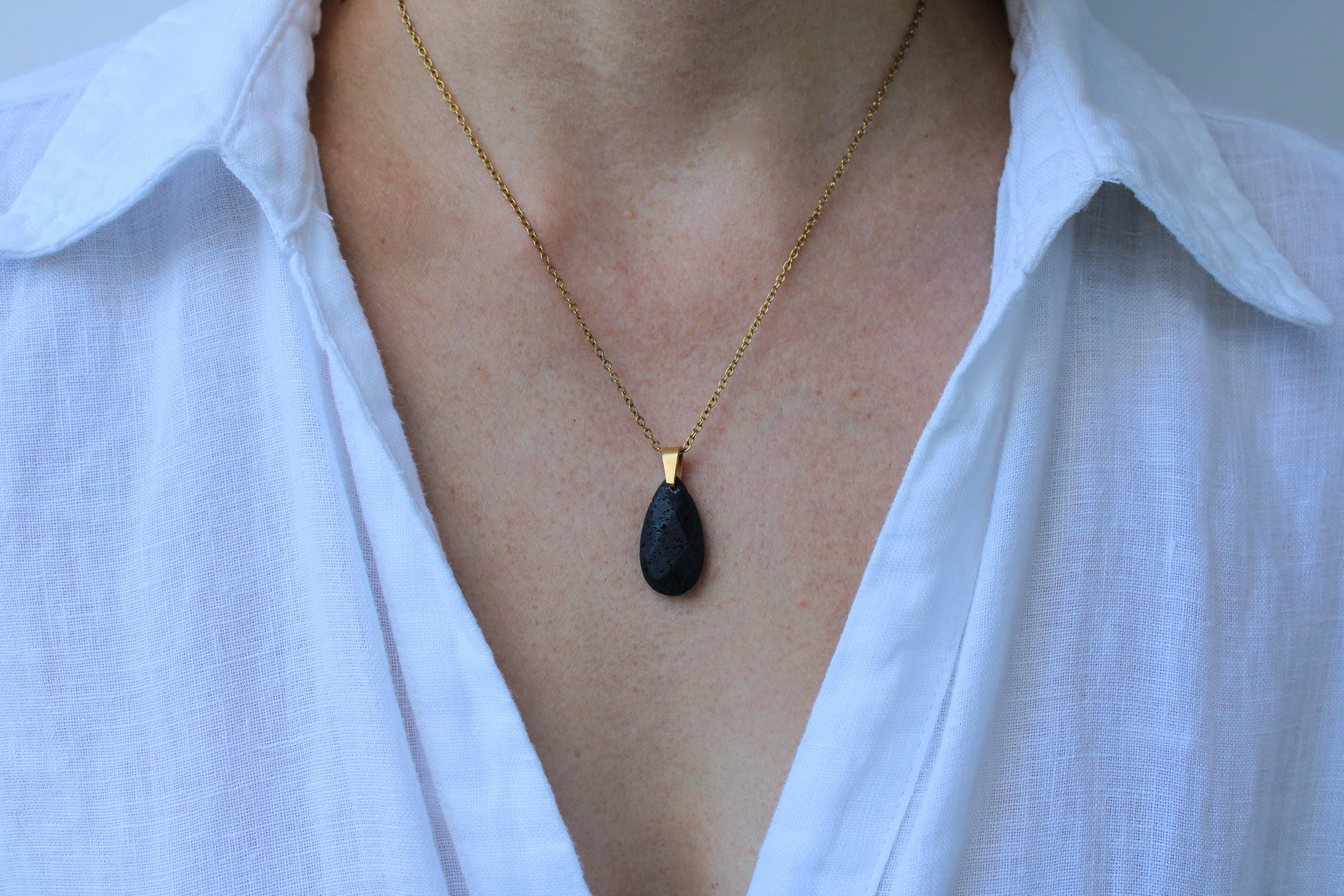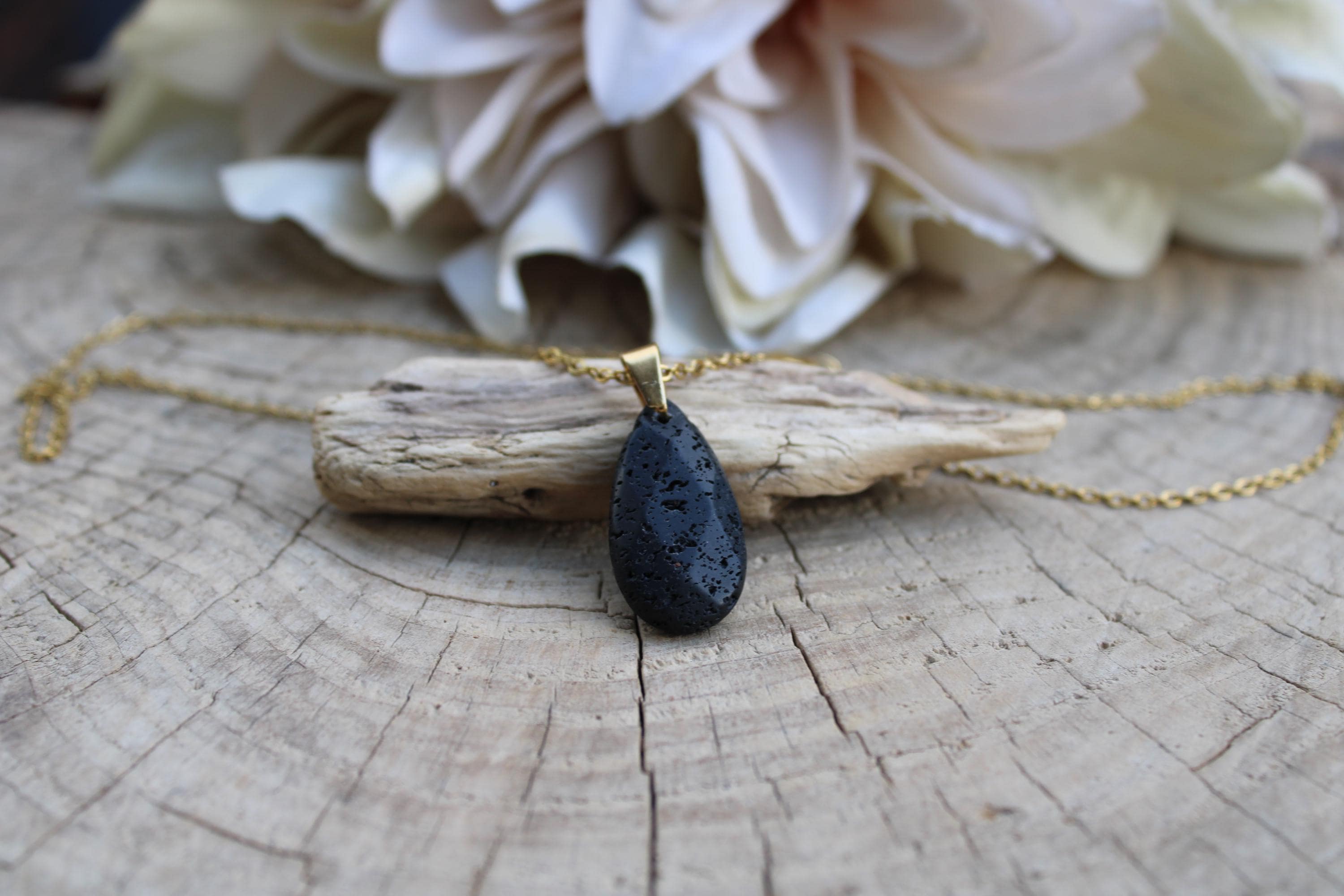 •It features a natural lava teardrop pendant measuring around 45mm long with the stainless steel bail.