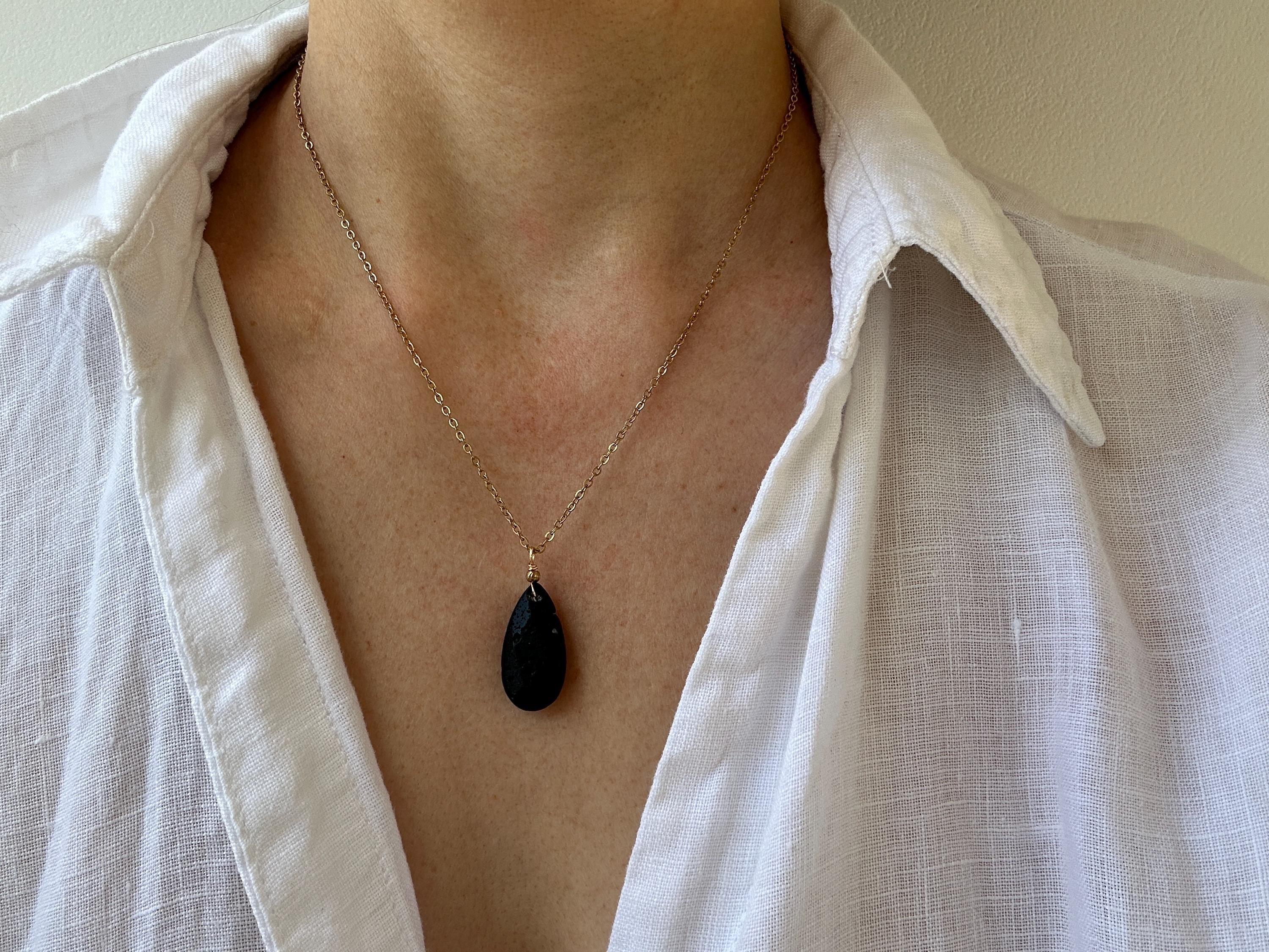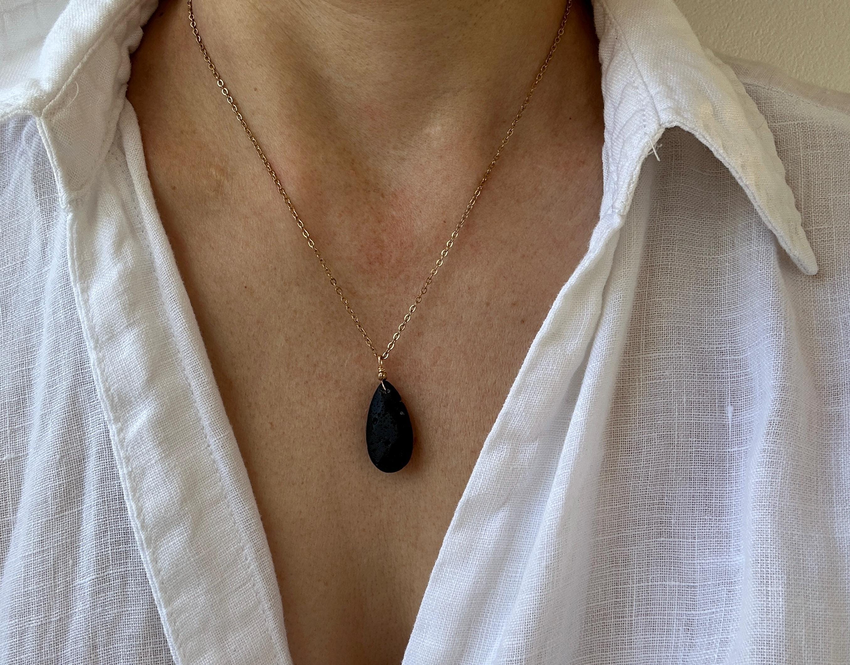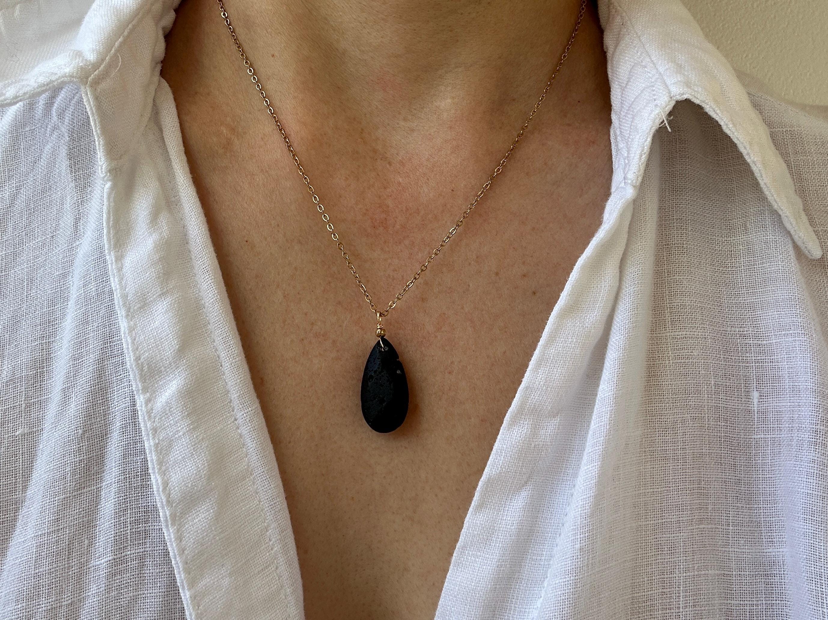 •It features a natural lava teardrop pendant measuring around 45mm long