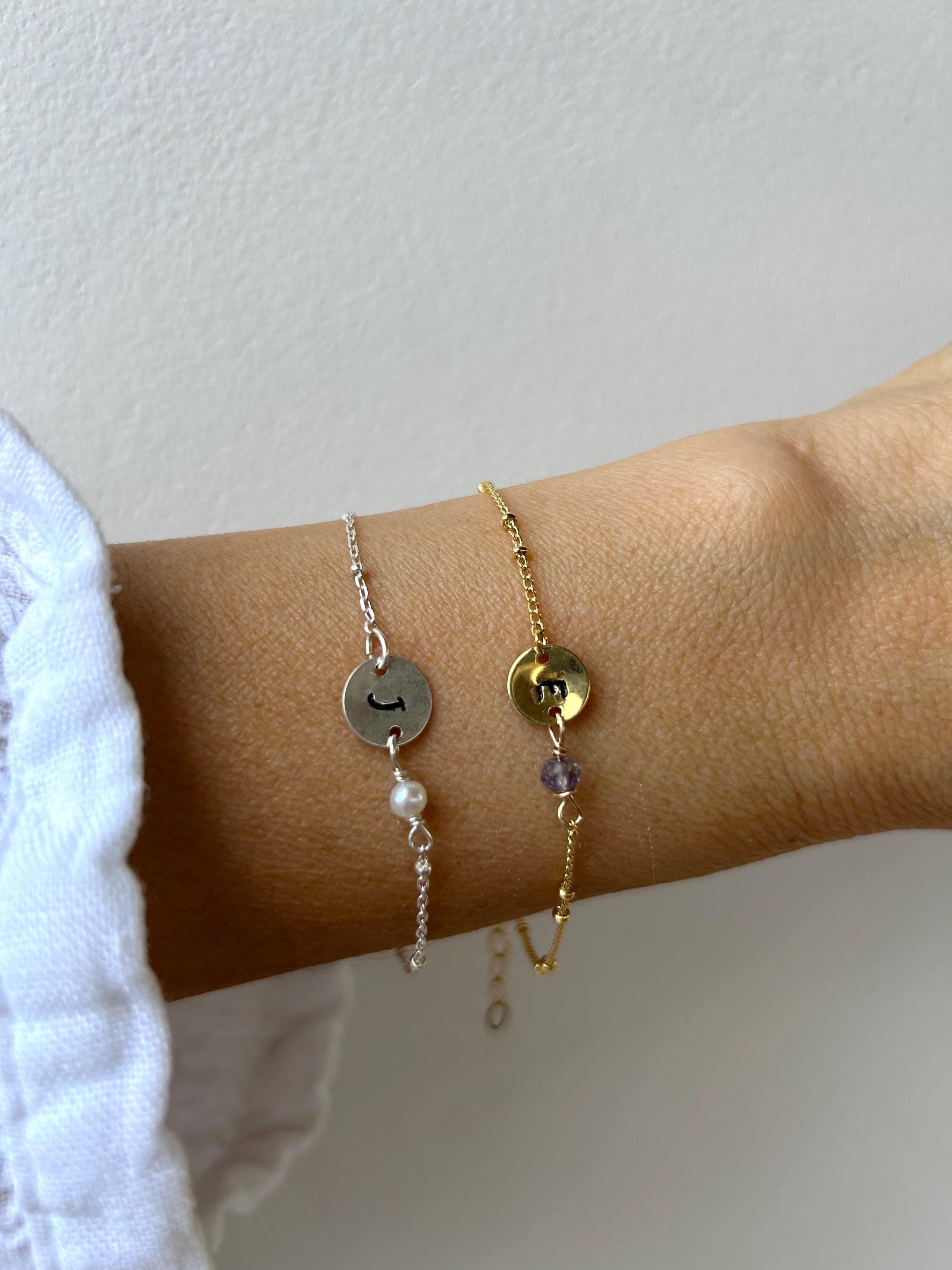This custom hand stamped bracelet featuring genuine gemstones makes a wonderful gift. Personalise it choosing the initial and crystal of your choice.