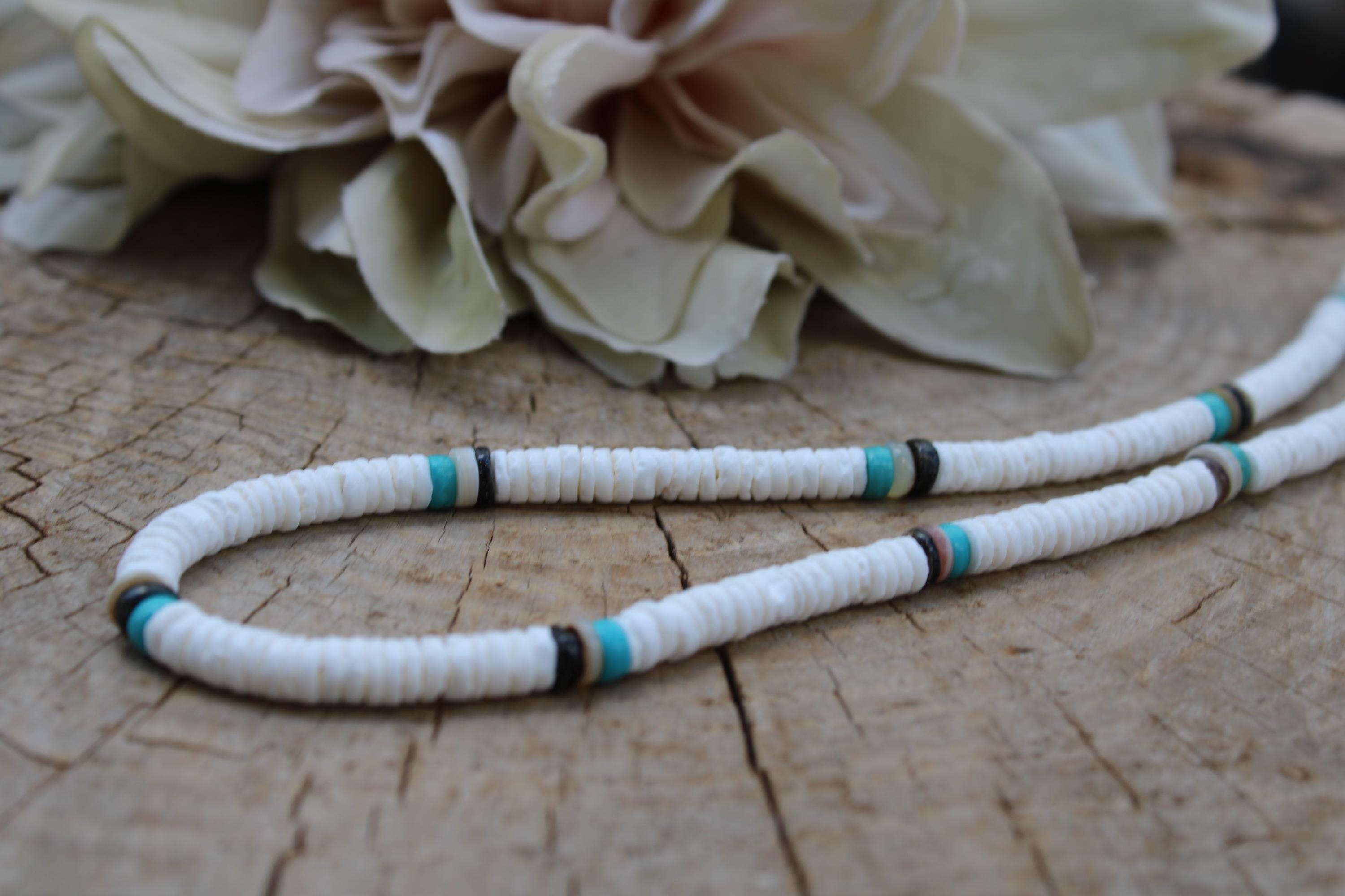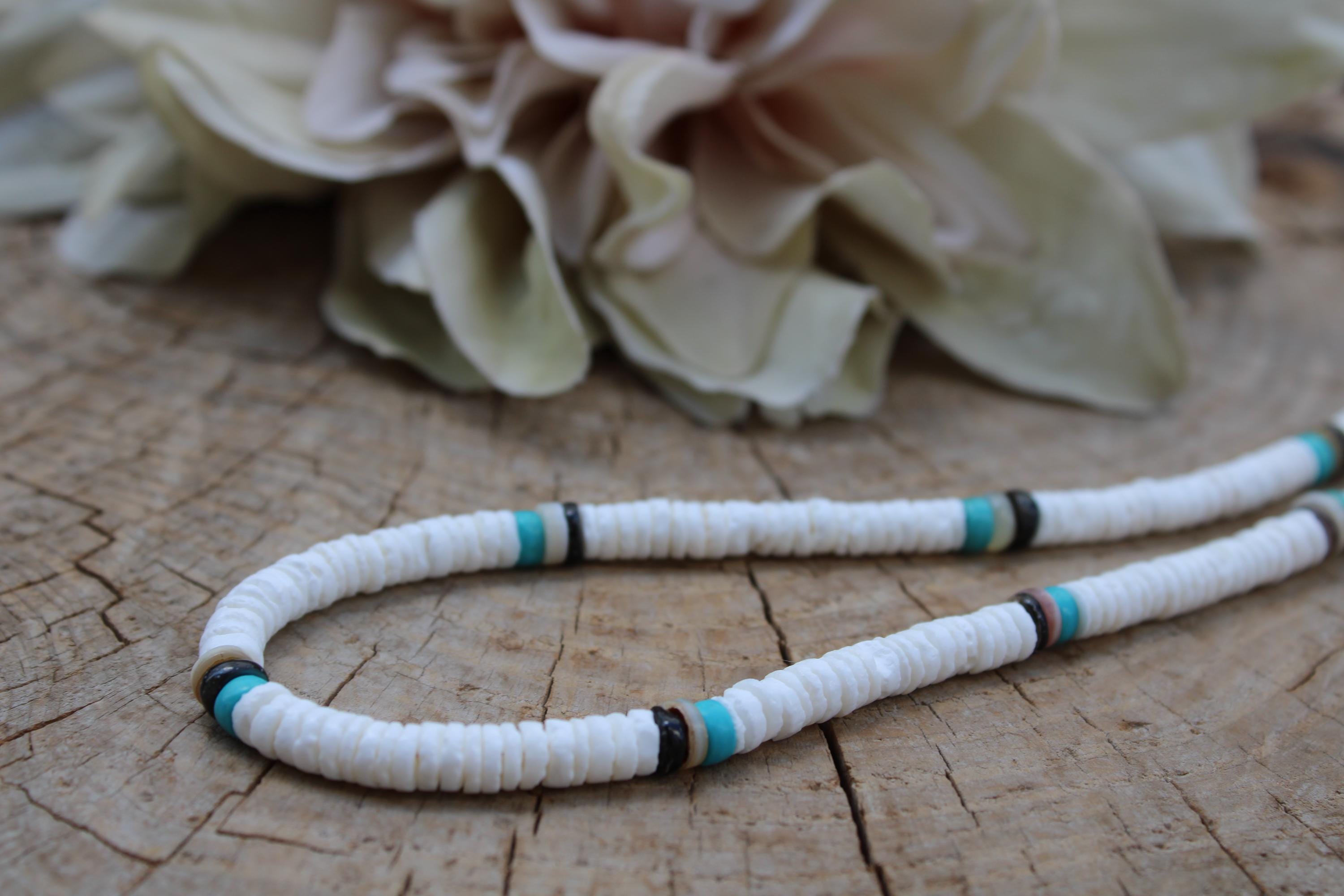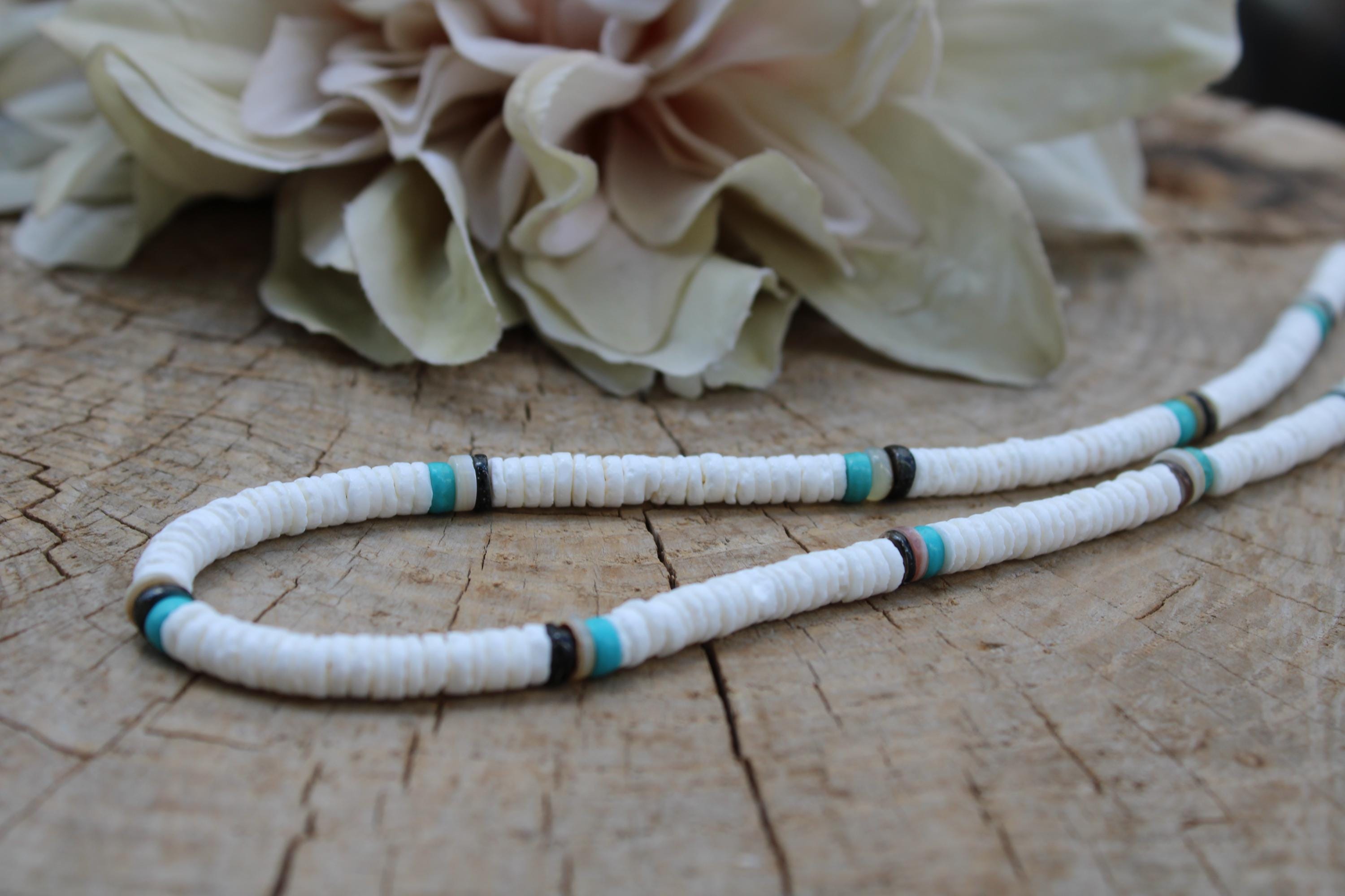 •It features white litub and freshwater shell heishi beads in earthy tones measuring around 5mm.
